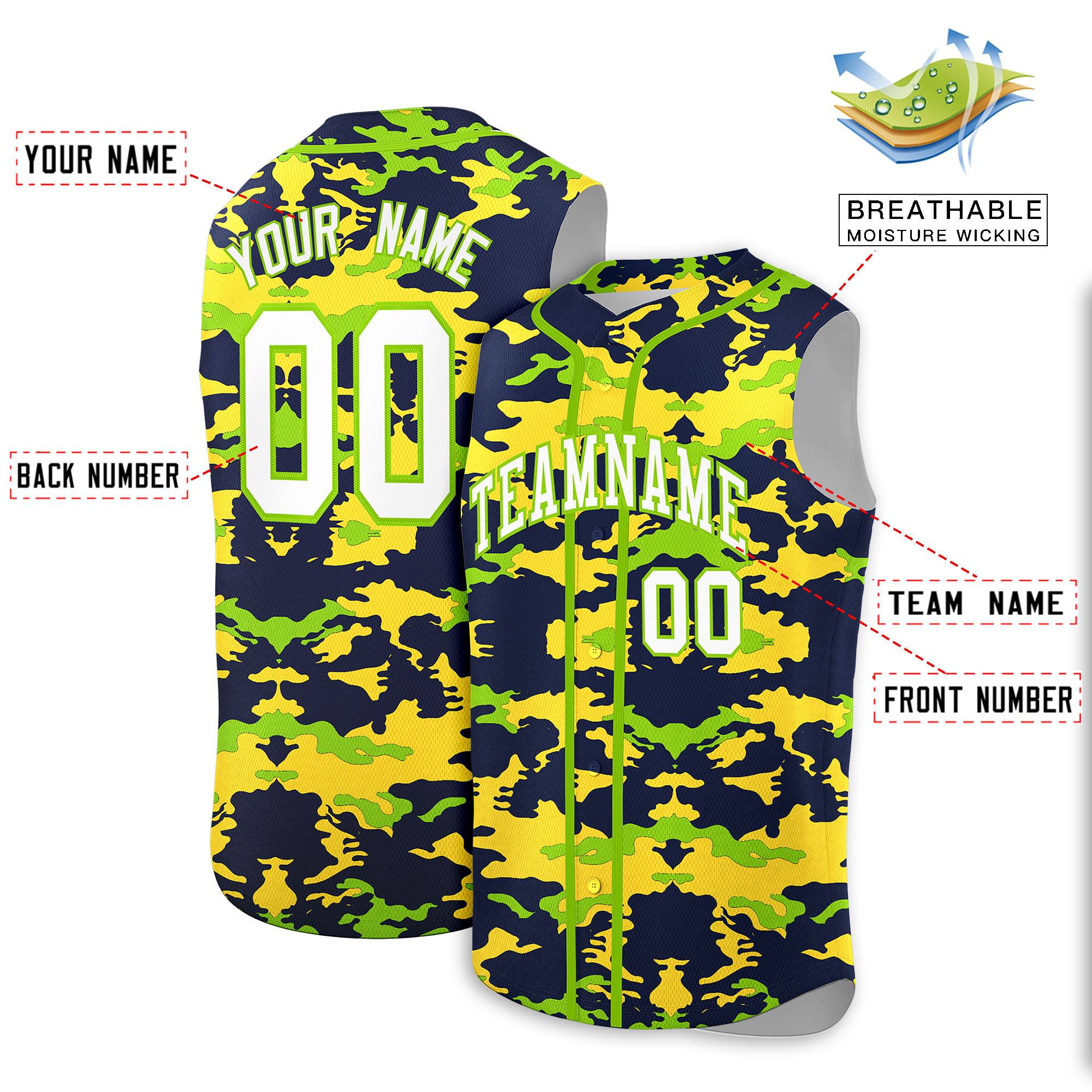 Custom Navy Gold and Neon Green Camo Fashion Authentic Sleeveless Baseball Jersey
