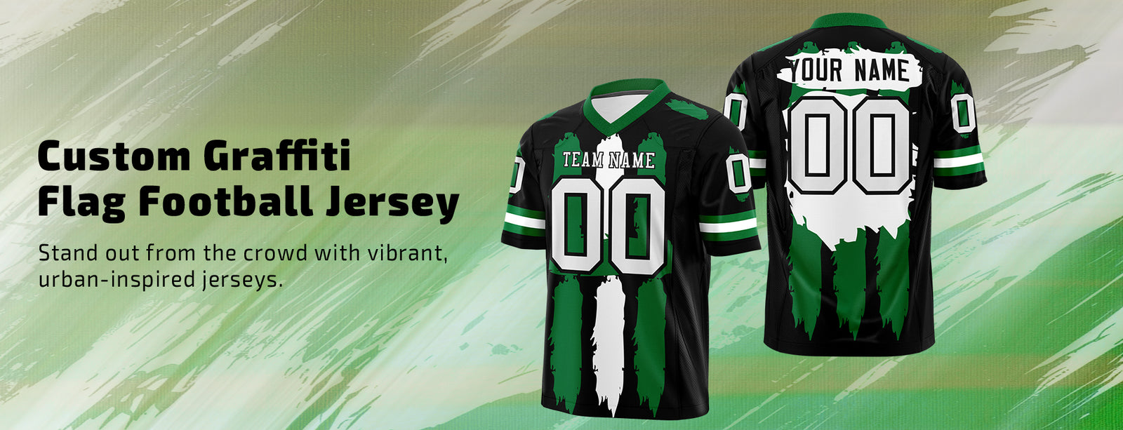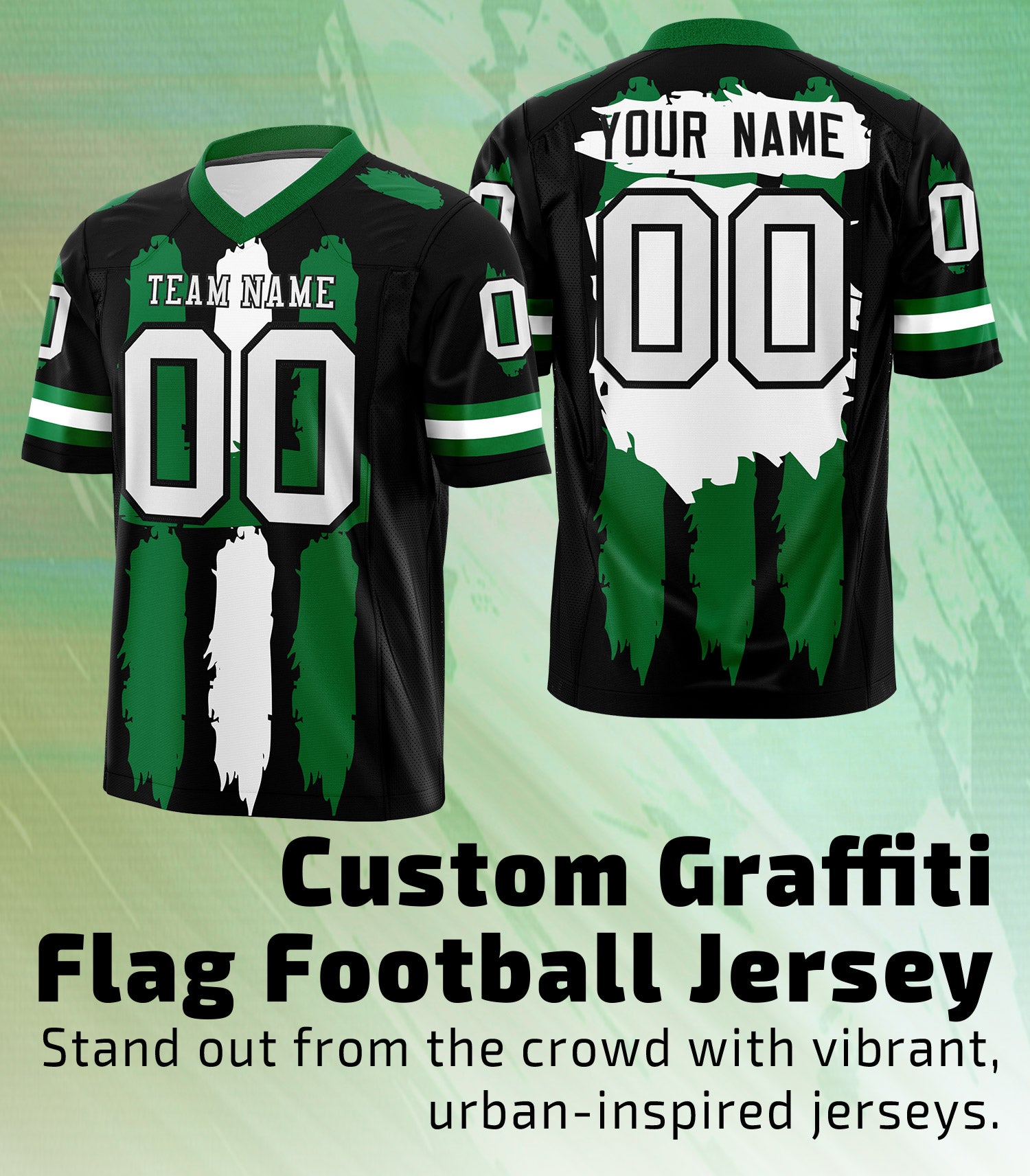 Custom Black Kelly Green and White Graffiti Pattern Flag Football Jerseys