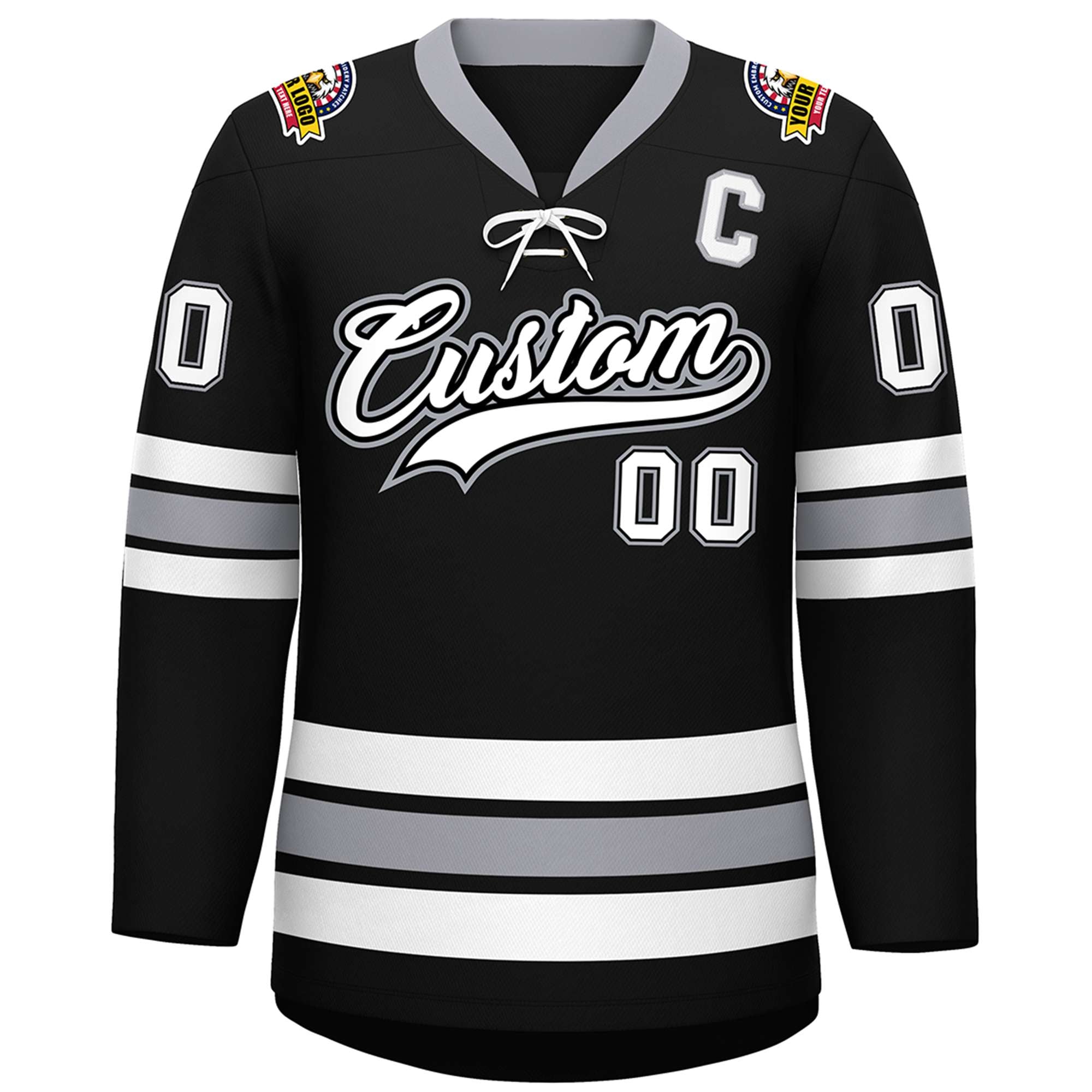 Custom Black White-Gray Lace-Up Neck Hockey Jersey