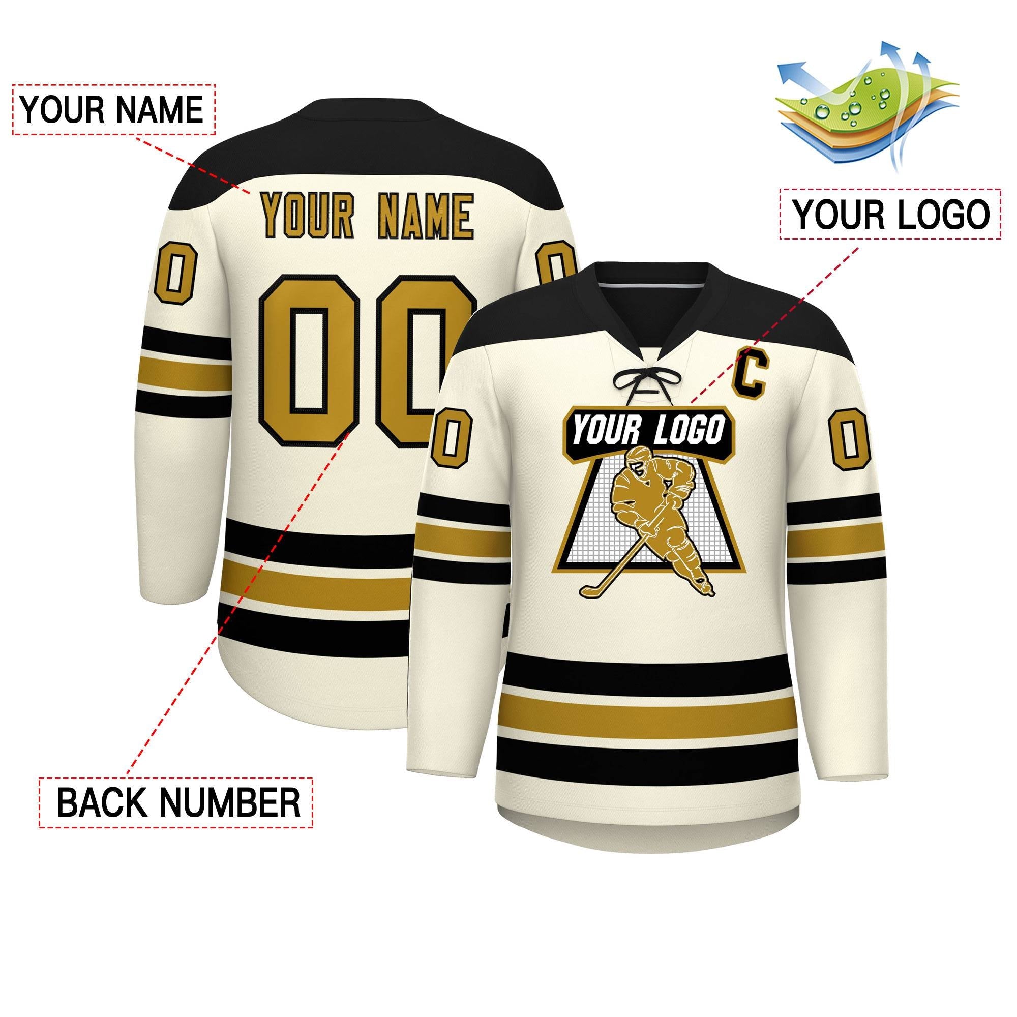 Custom Cream Black Old Gold Personalized Classic Lace-Up Neck Hockey Jersey