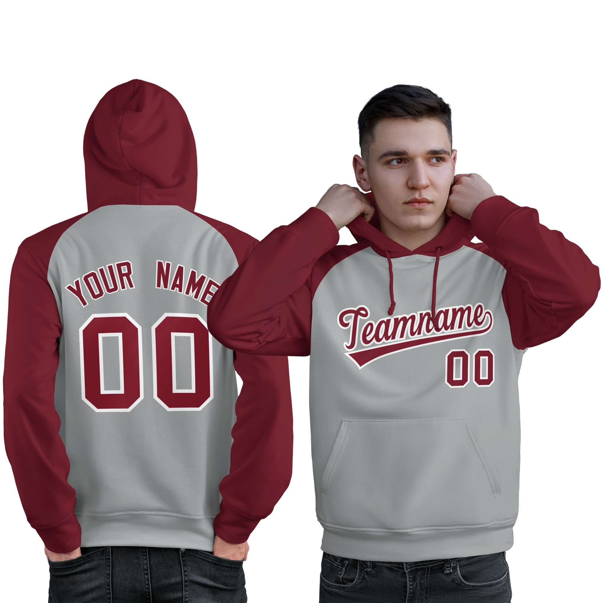 Custom Stitched Gray Crimson Raglan Sleeves Sports Pullover Sweatshirt Hoodie For Men
