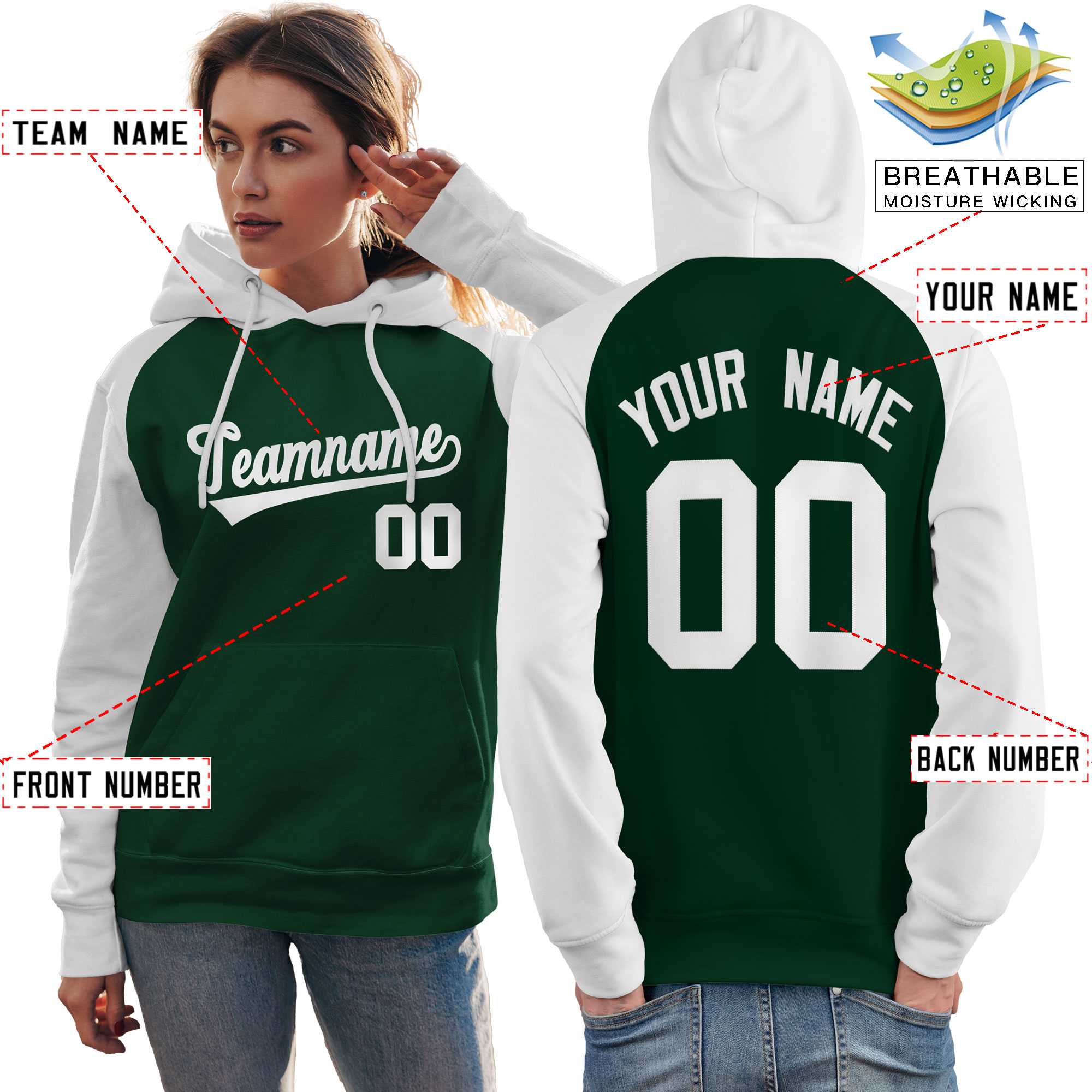 Custom Stitched Green White Raglan Sleeves Sports Pullover Sweatshirt Hoodie For Women