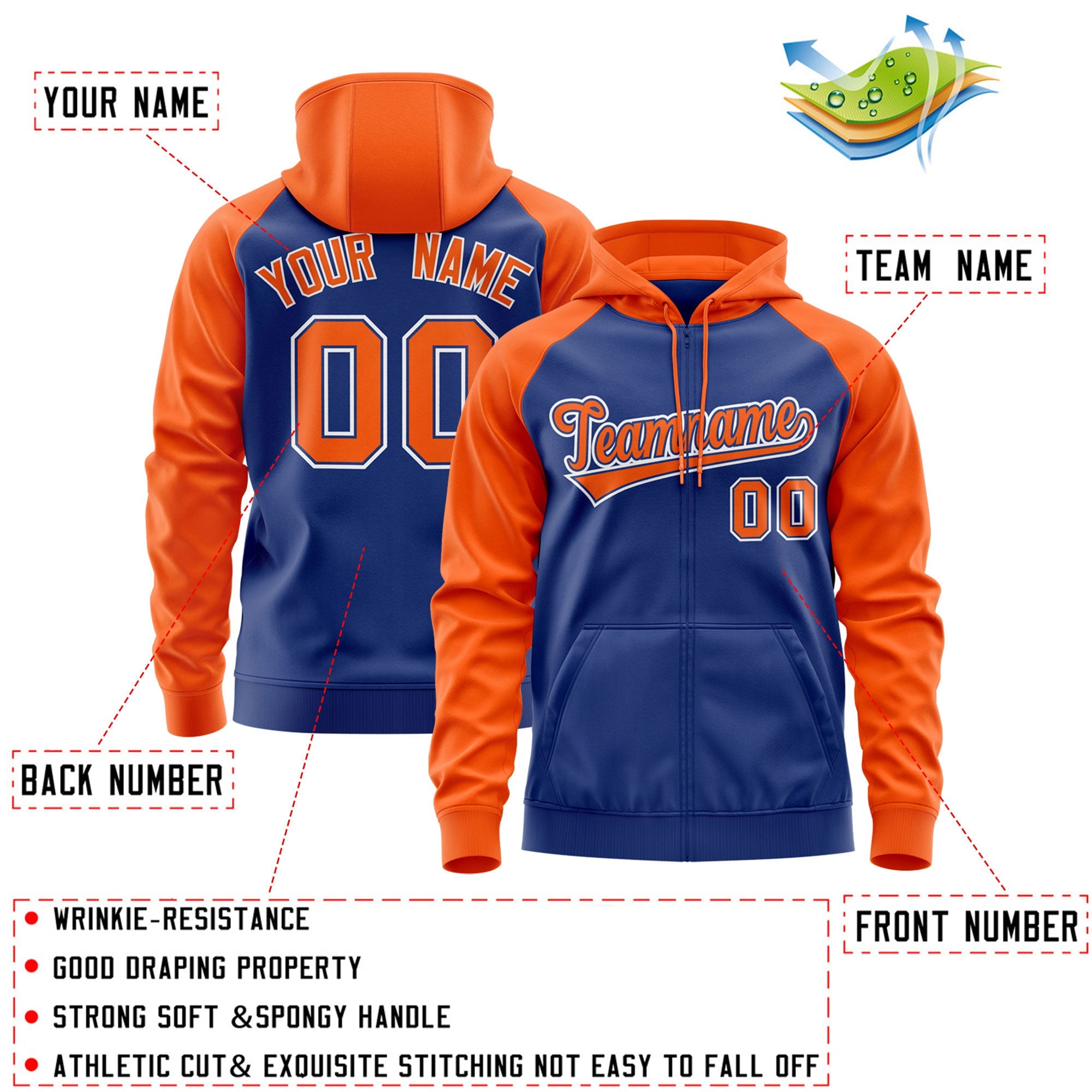 Custom Stitched Royal Orange-White Raglan Sleeves Sports Full-Zip Sweatshirt Hoodie