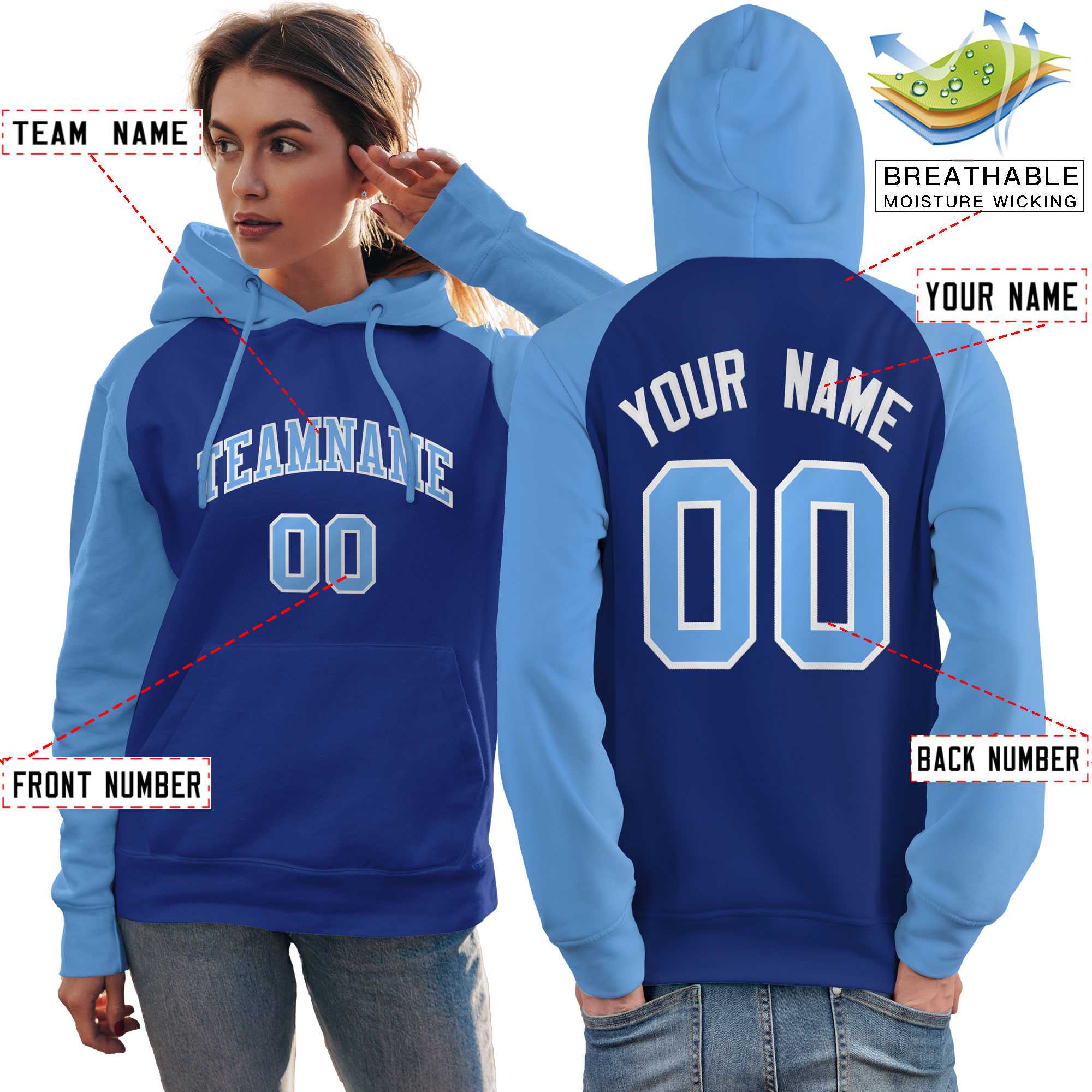 Custom Stitched Royal Powder Blue Raglan Sleeves Sports Pullover Sweatshirt Hoodie For Women