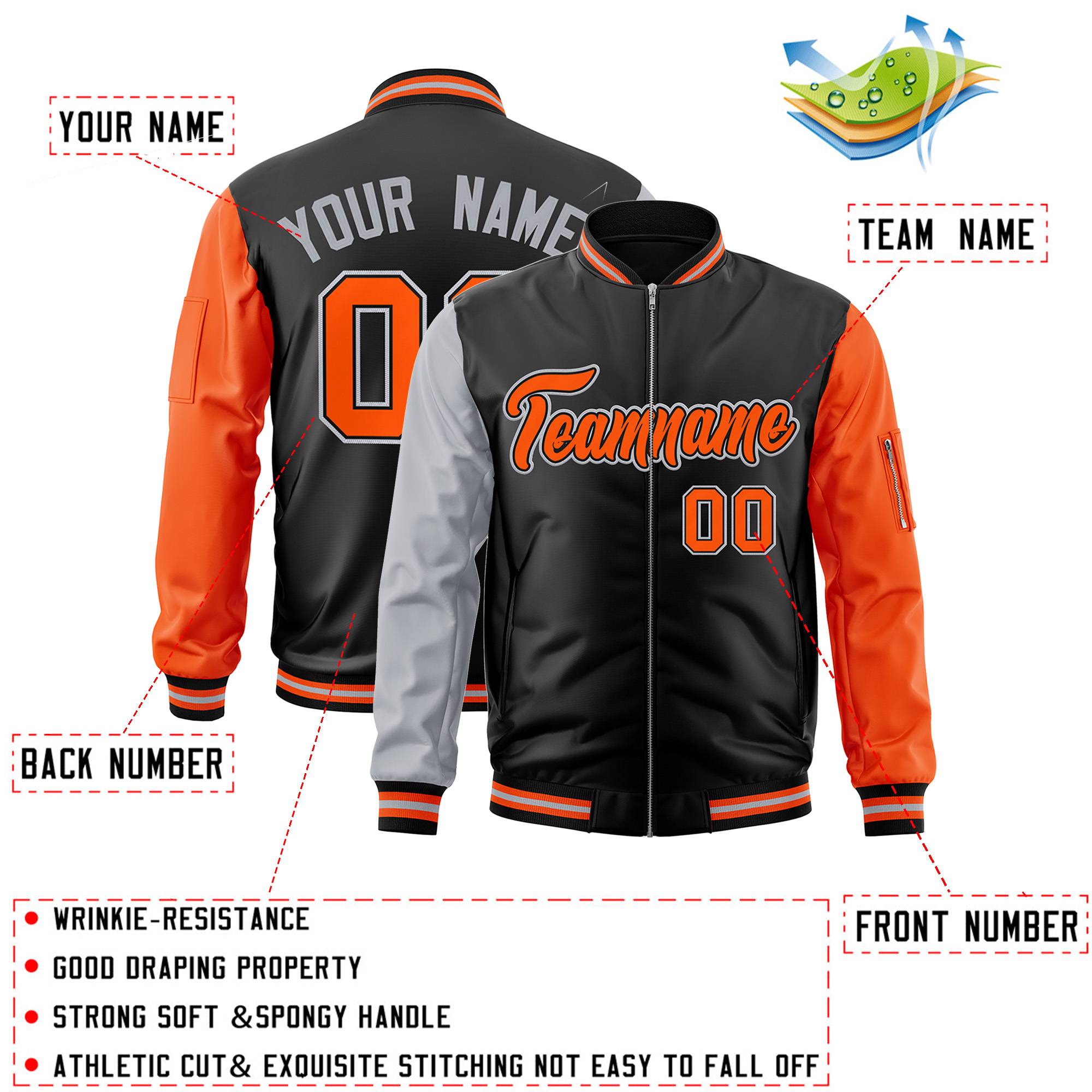 Custom Black Orange-Gray Varsity Full-Zip Raglan Sleeves Letterman Bomber Jacket