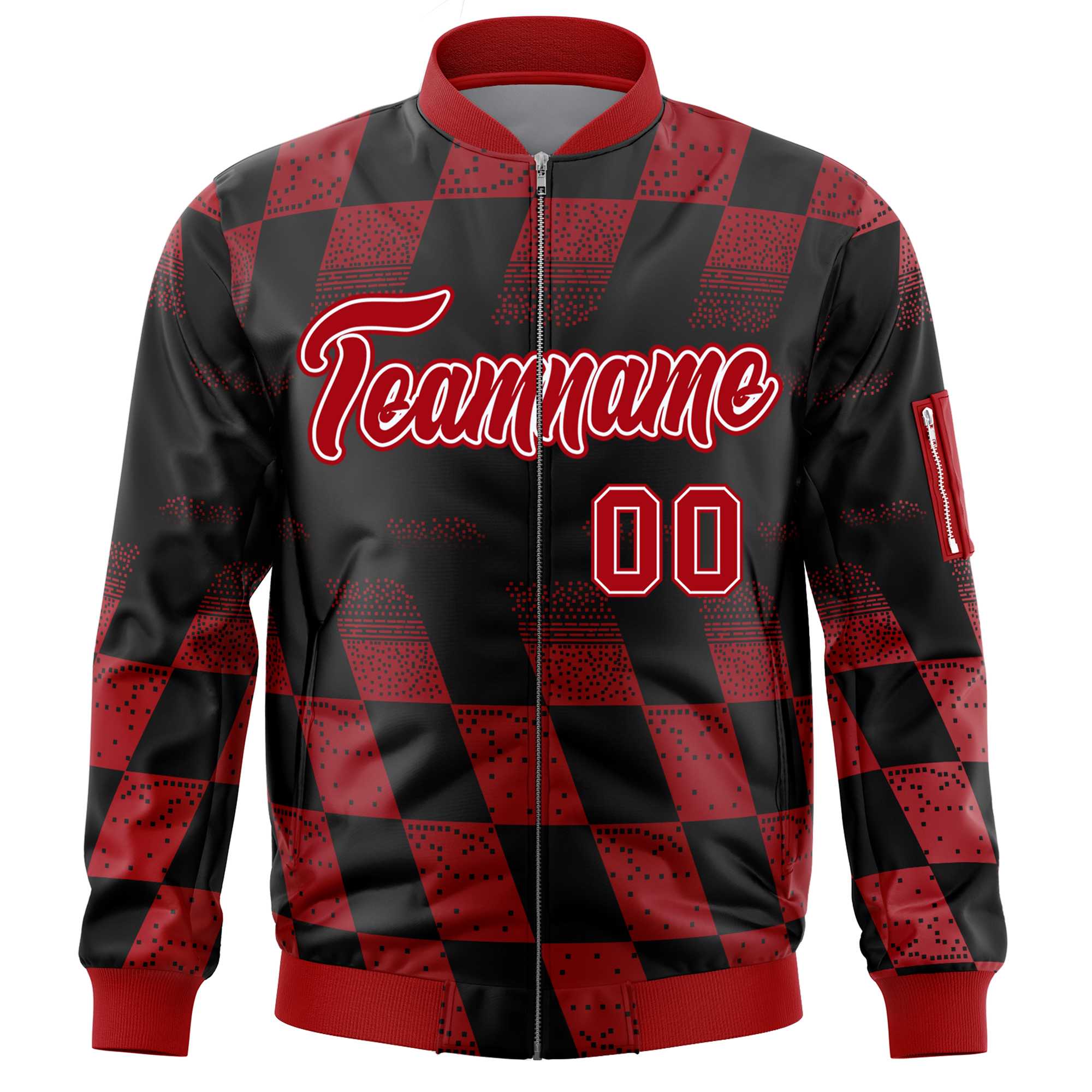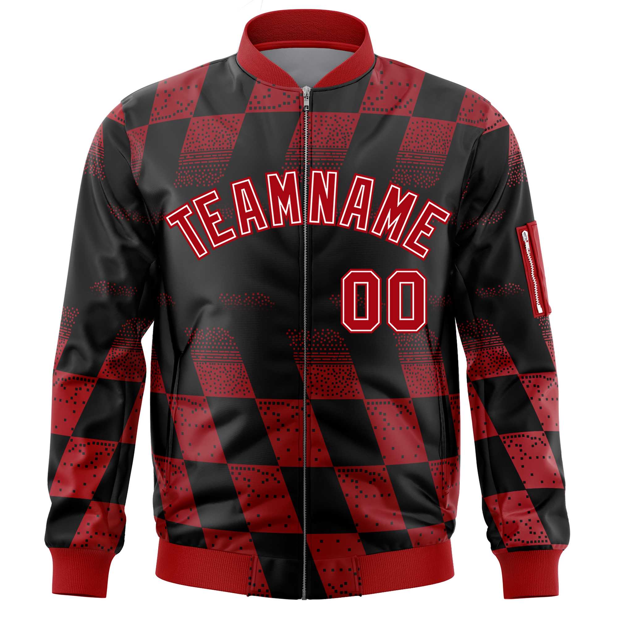 Custom Black Red Grid Varsity Full-Zip Color Block Letterman Bomber Jacket