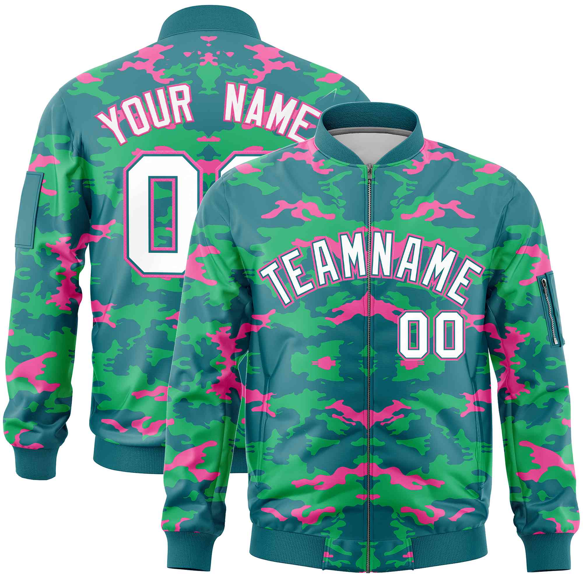Custom Aqua Pink-Light Green Varsity Full-Zip Camo Letterman Bomber Jacket