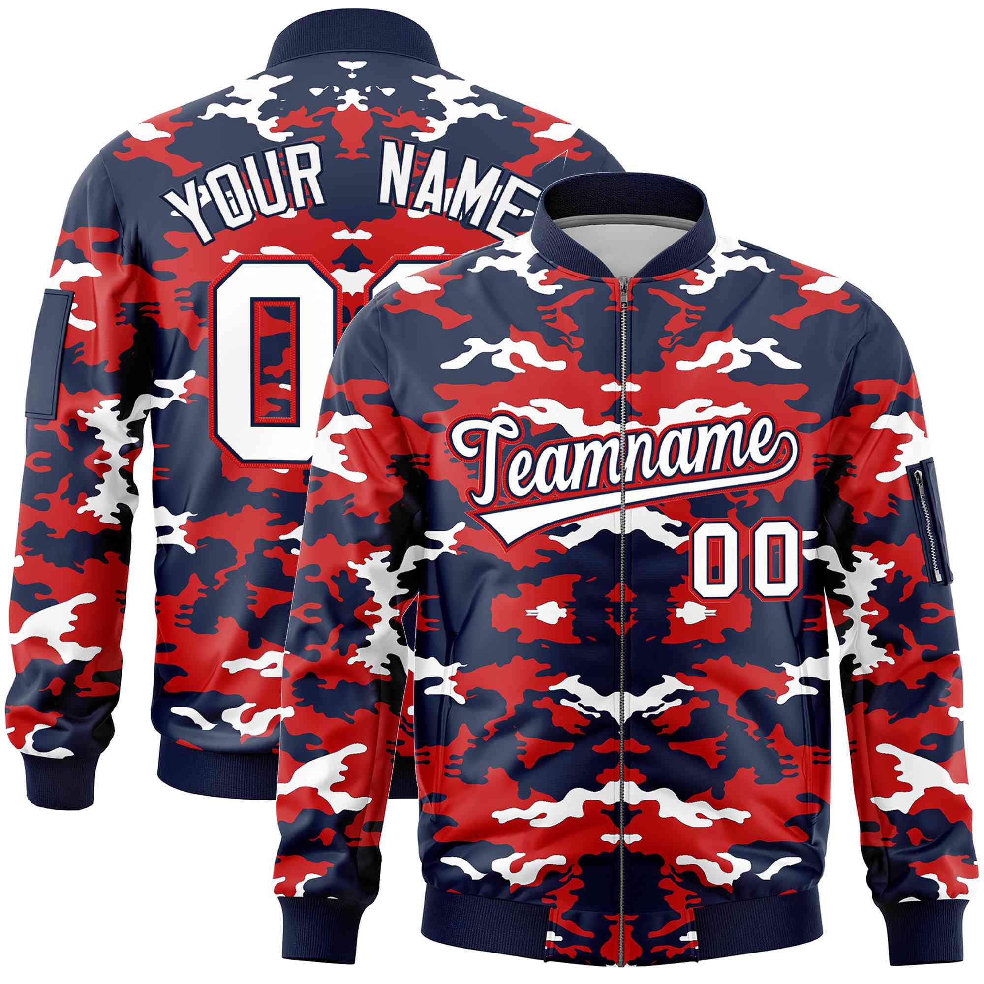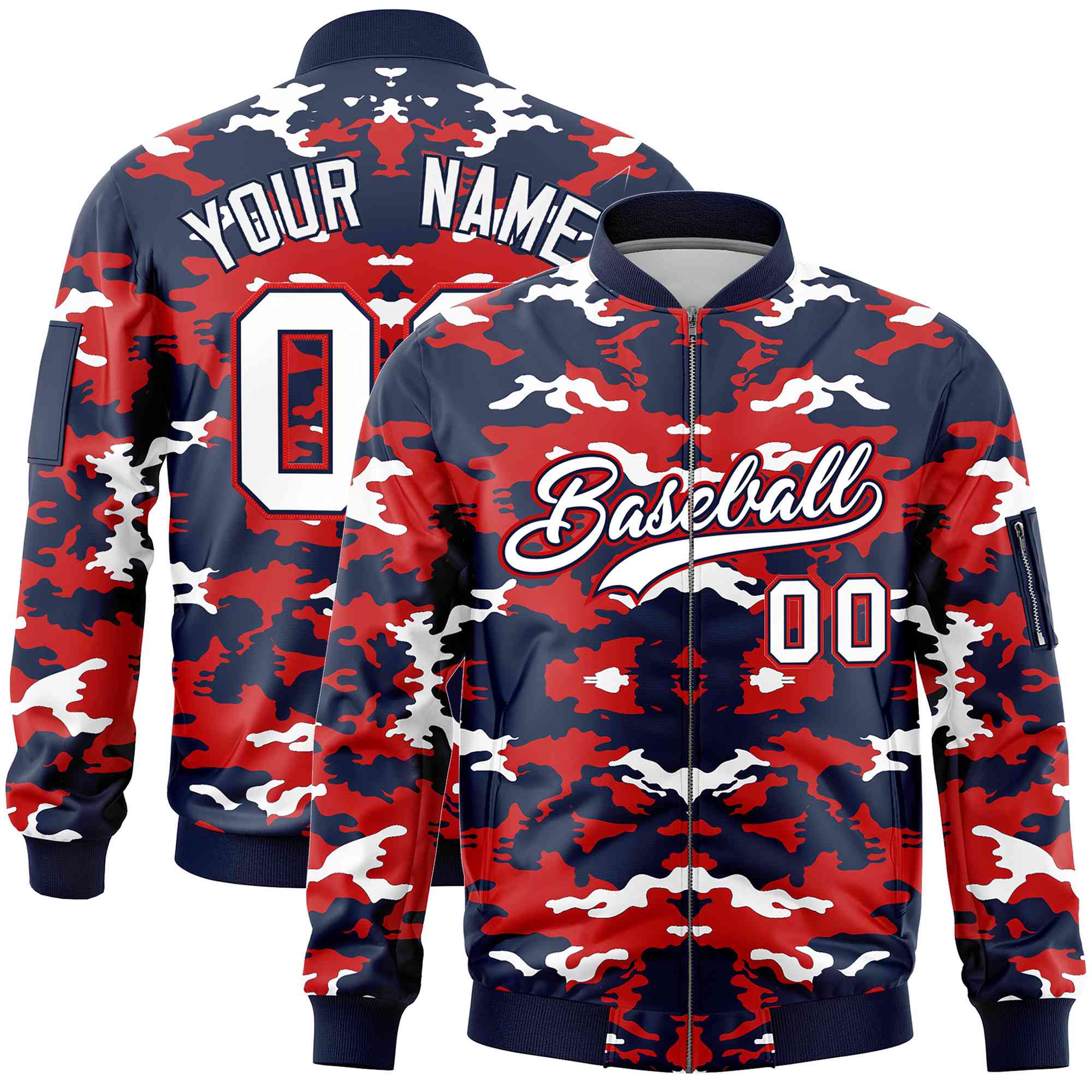 Custom Navy Red-White Varsity Full-Zip Camo Letterman Bomber Jacket