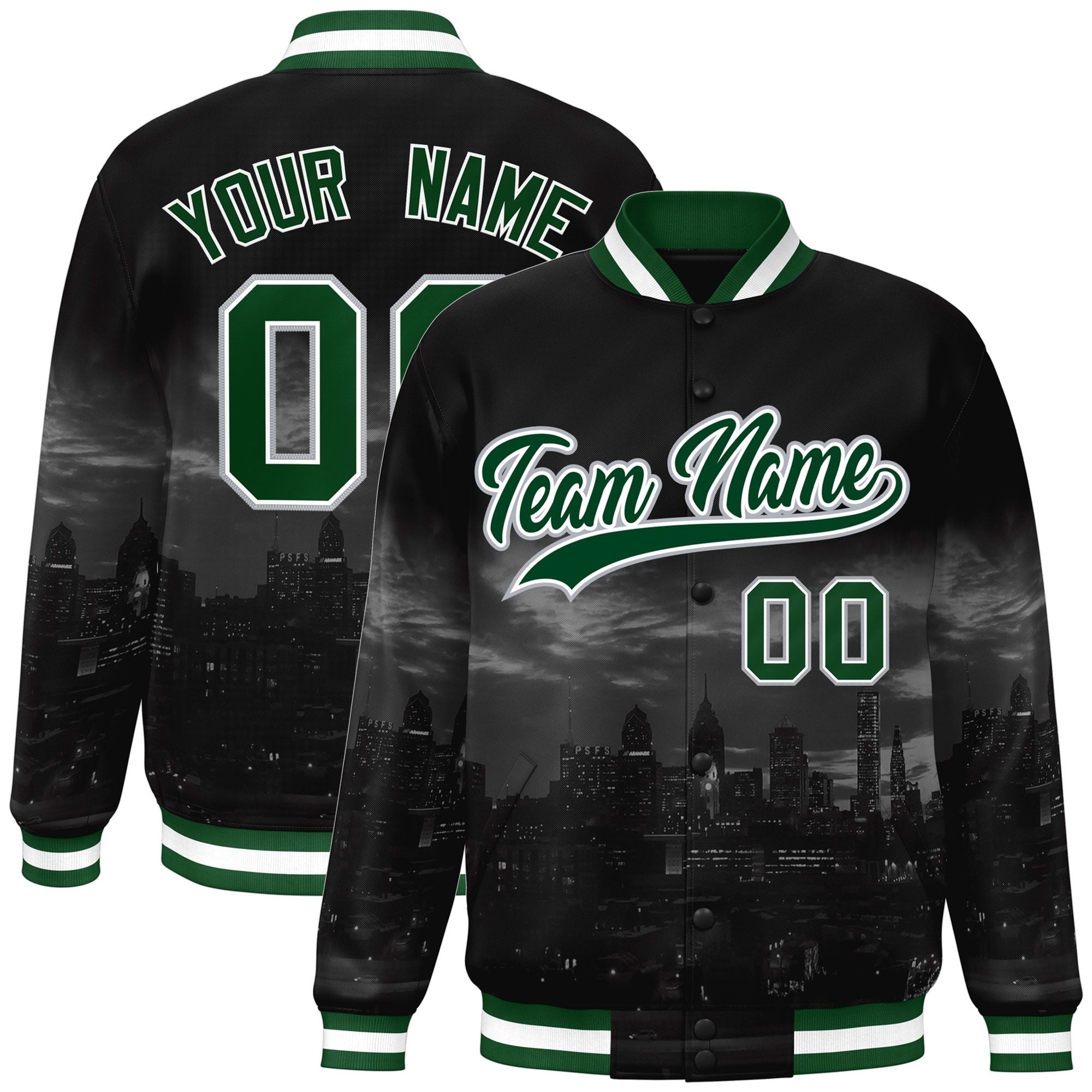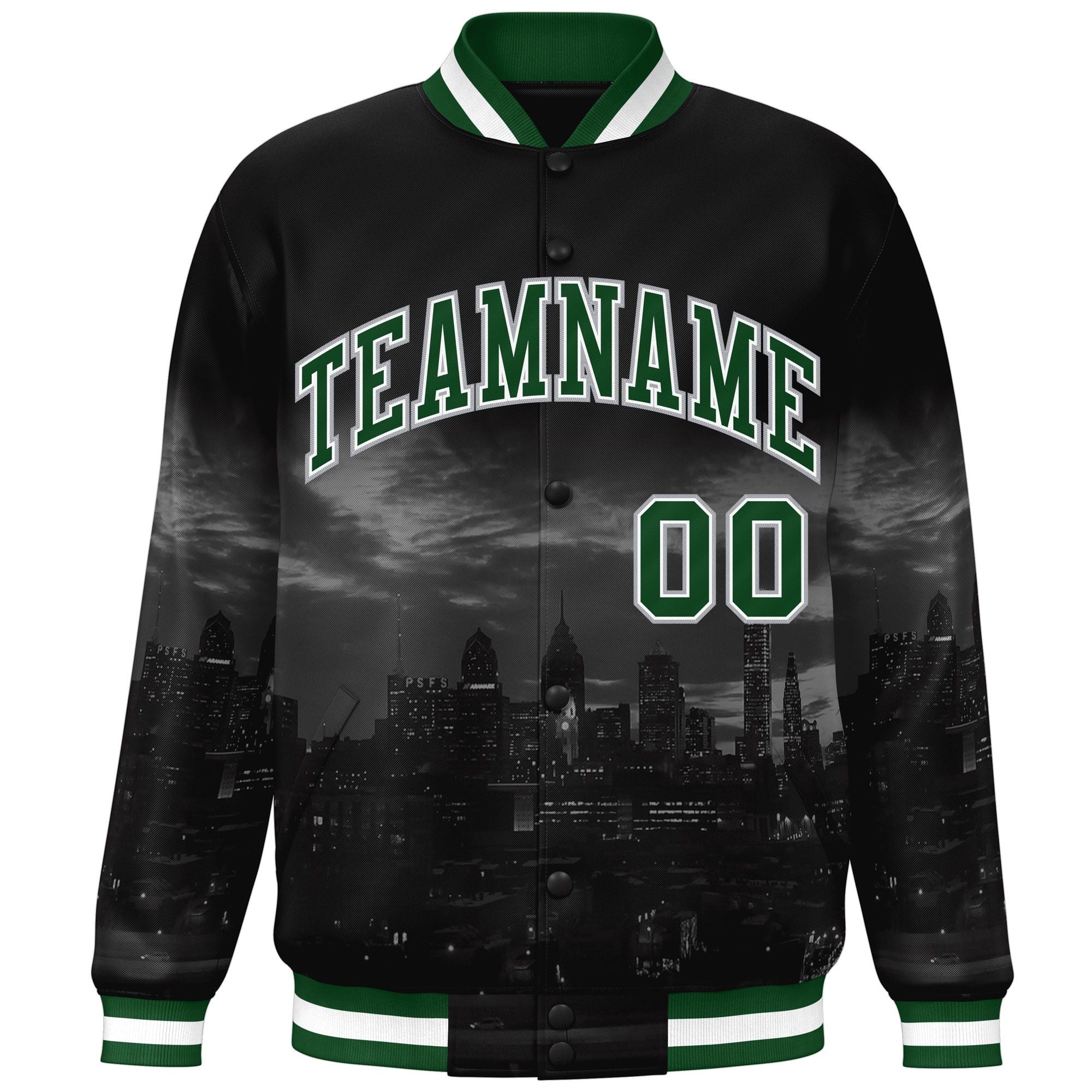 Custom Black Green-White Philadelphia City Connect Track Varsity Full-Snap Jacket