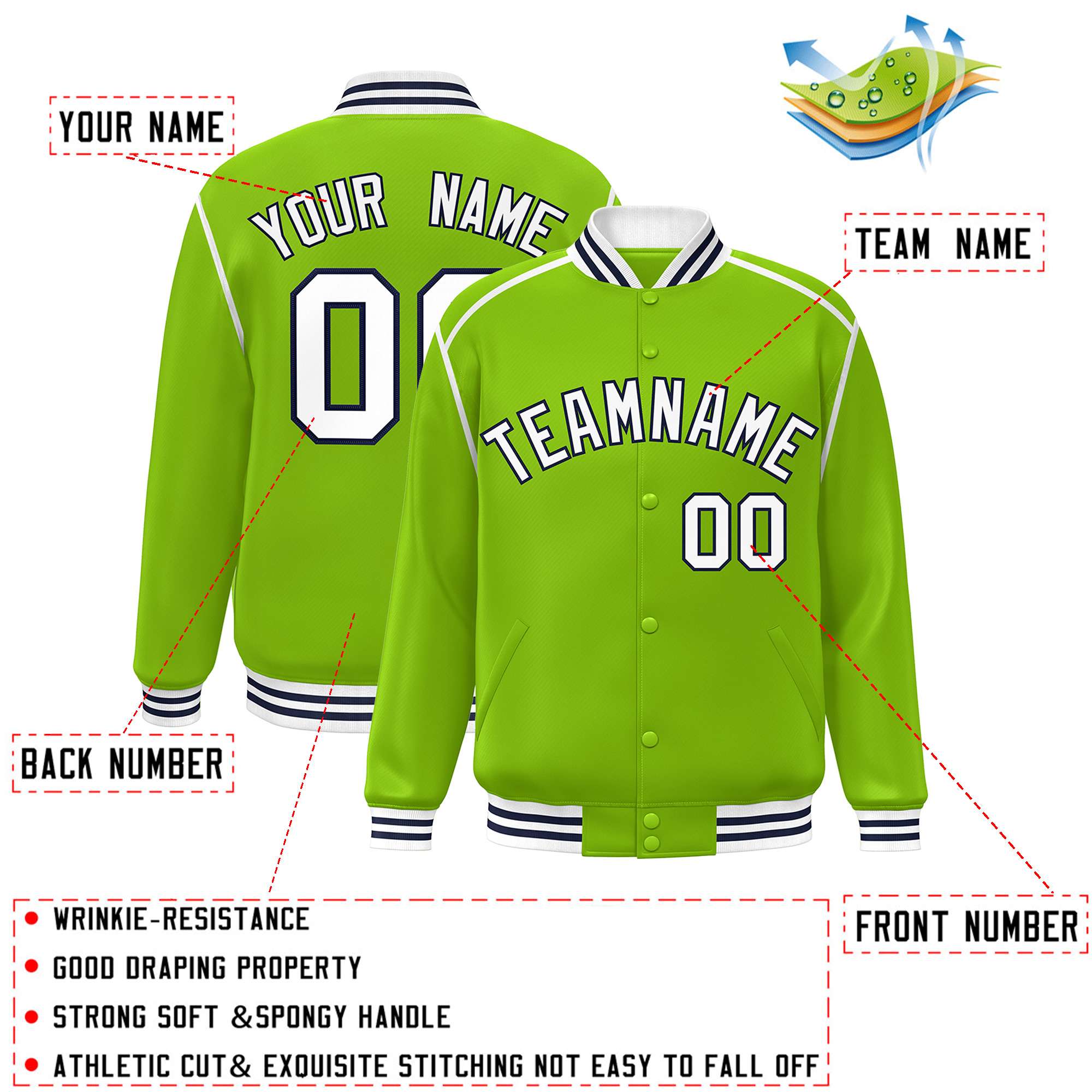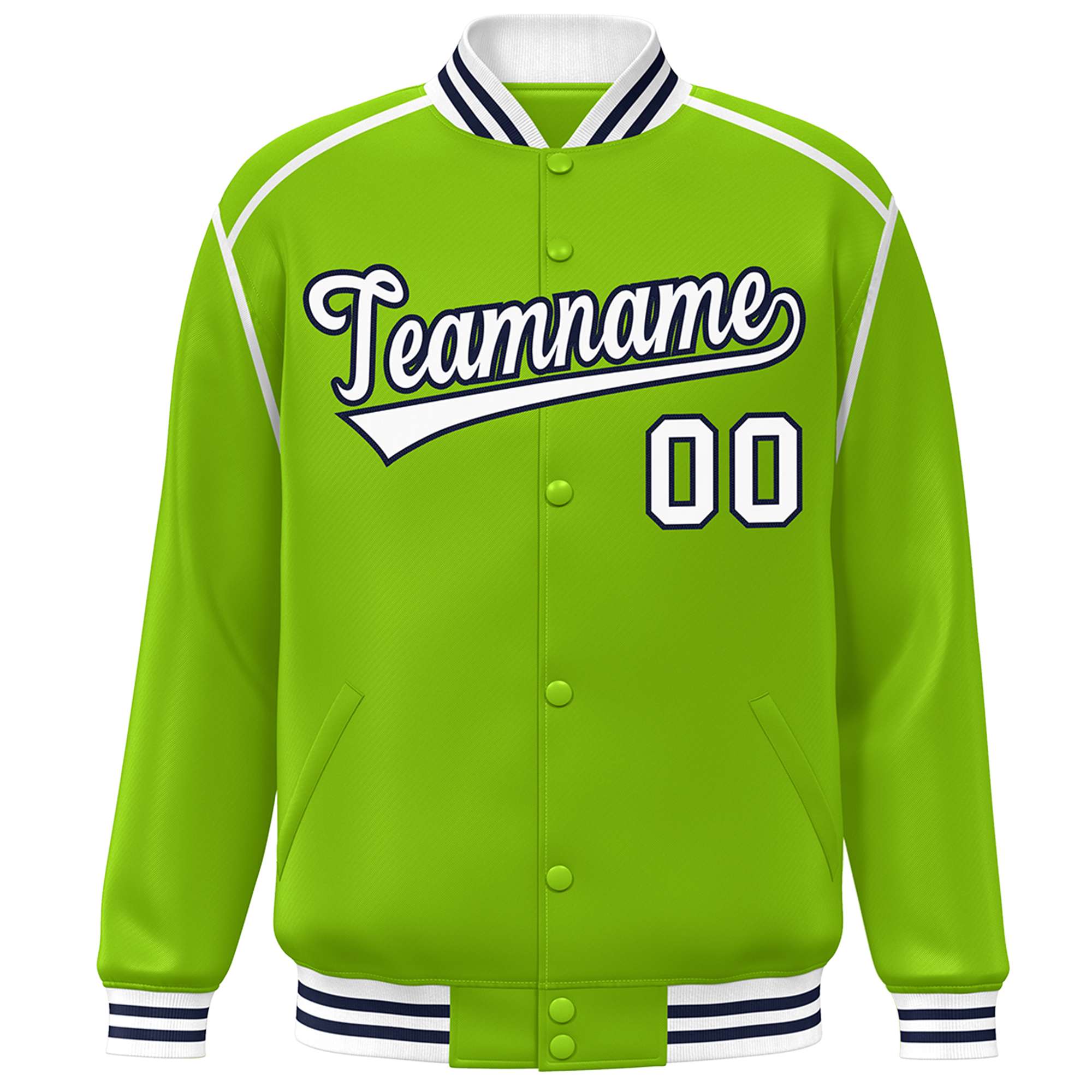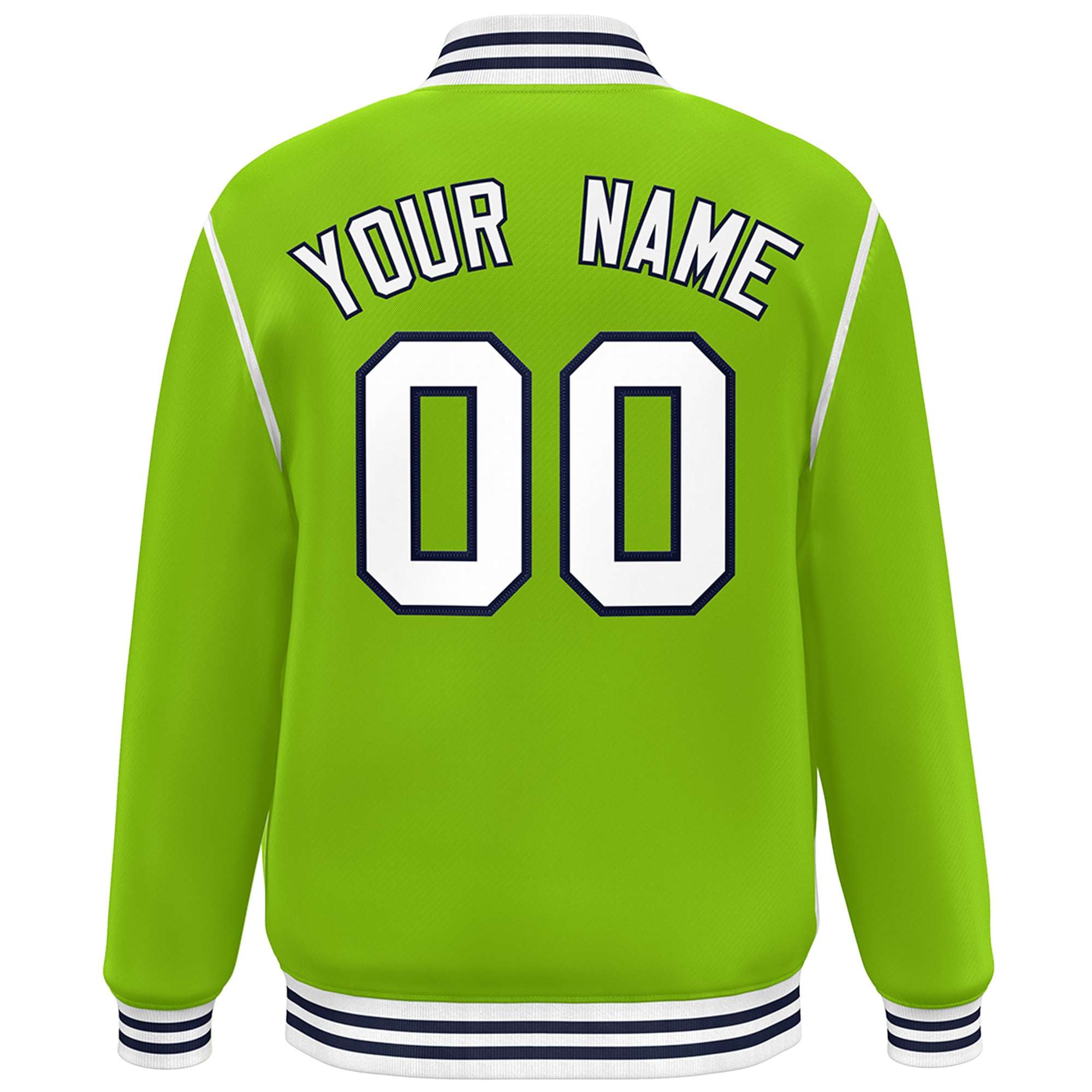 Custom Neon Green White-Navy Color Block Ribbon Varsity Full-Snap Bomber Jacket