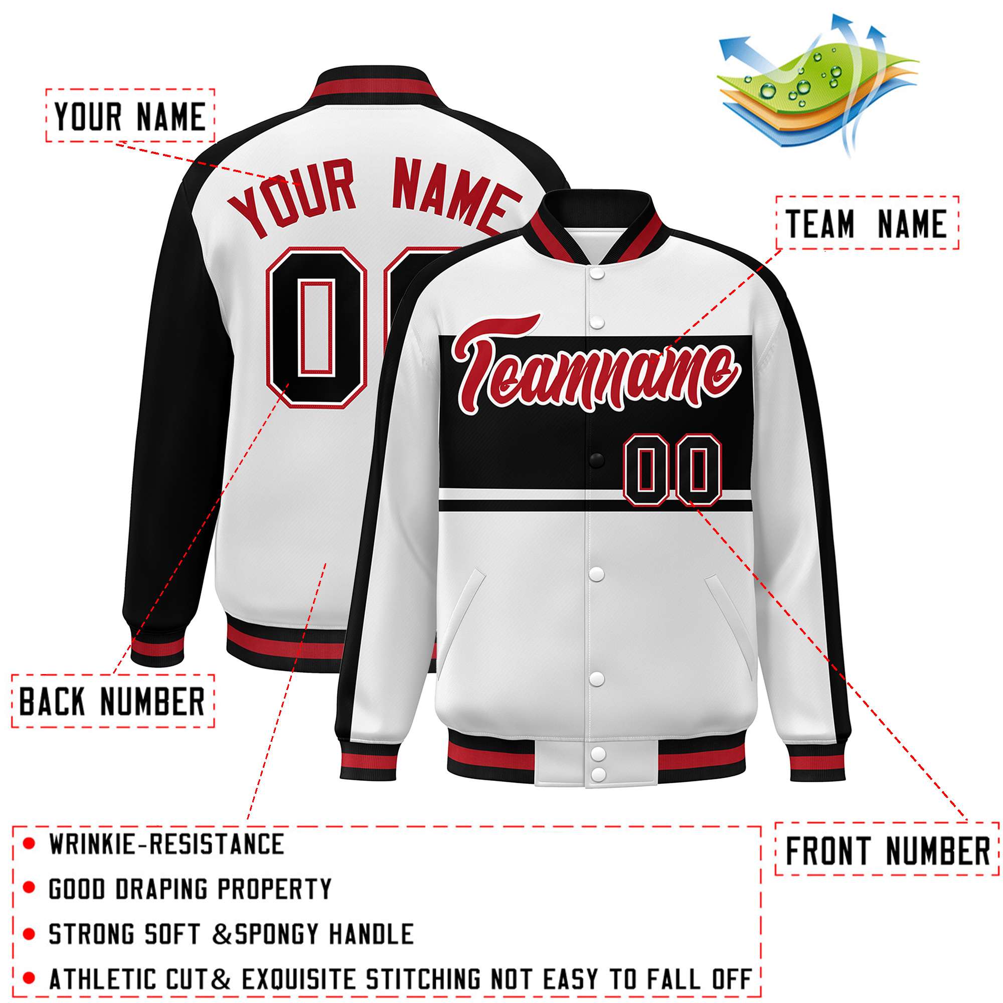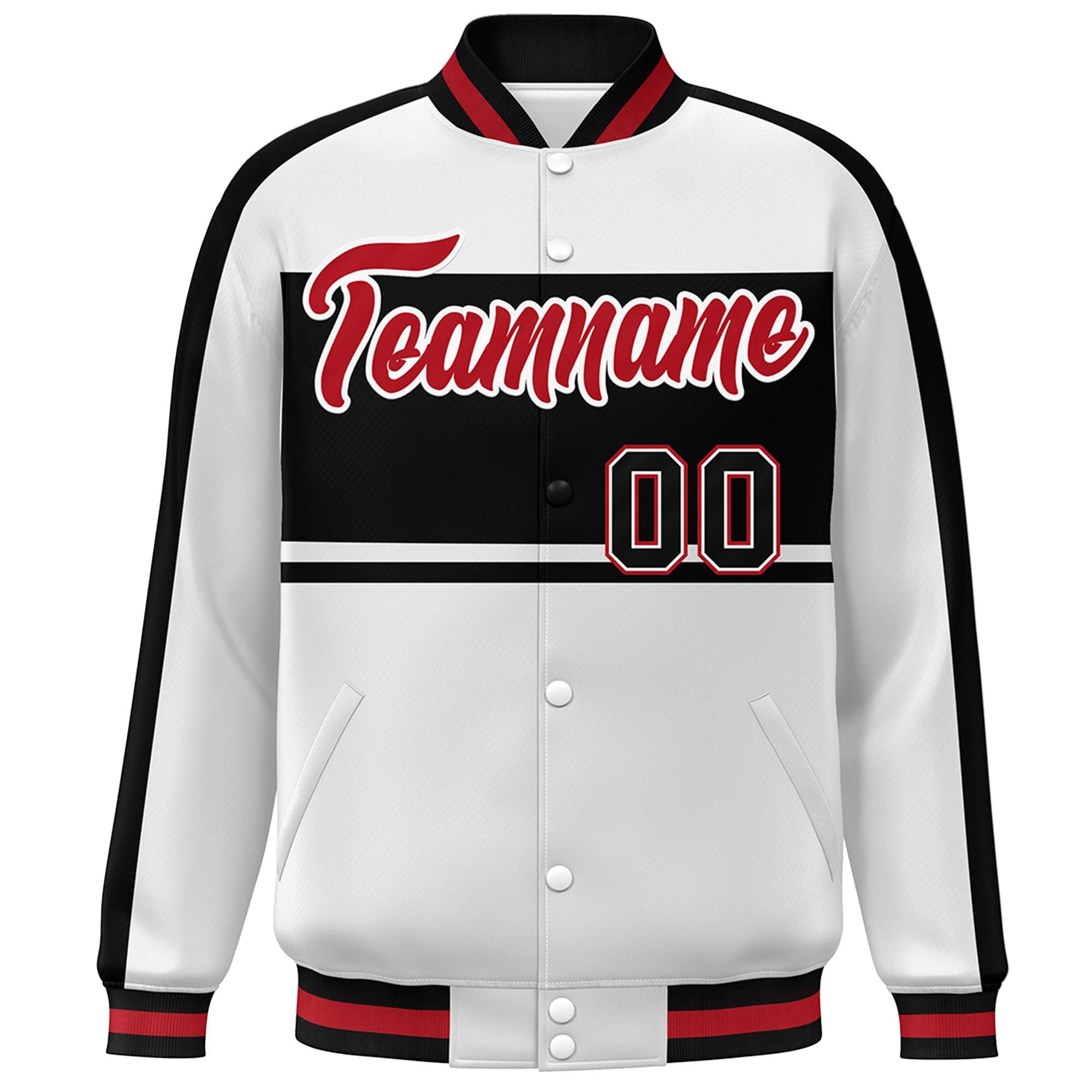 Custom White Black-Red Color Block Bomber Varsity Baseball Jacket