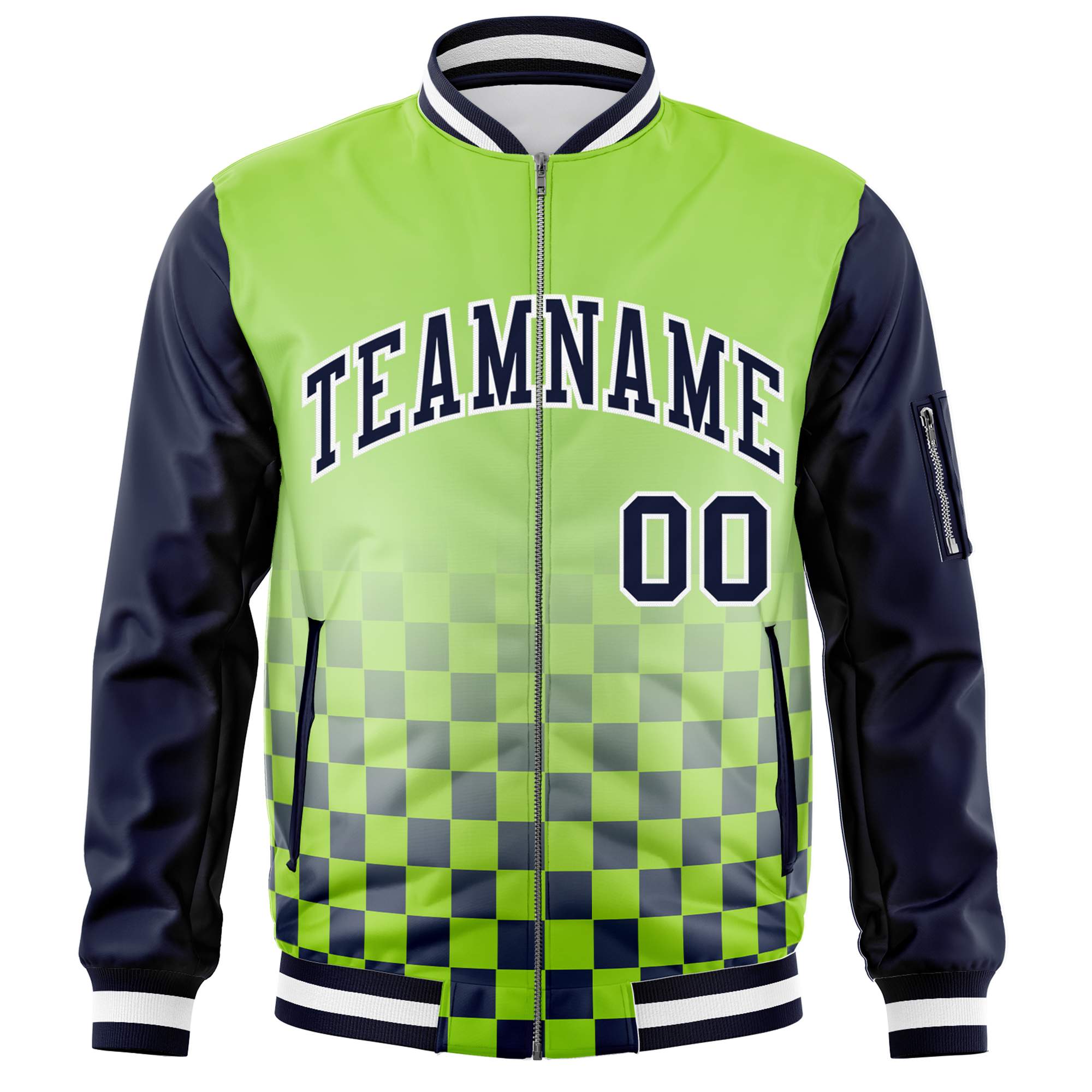 Custom Neon Green Navy-White Grid Varsity Full-Zip Color Block Letterman Raglan Sleeve Jacket