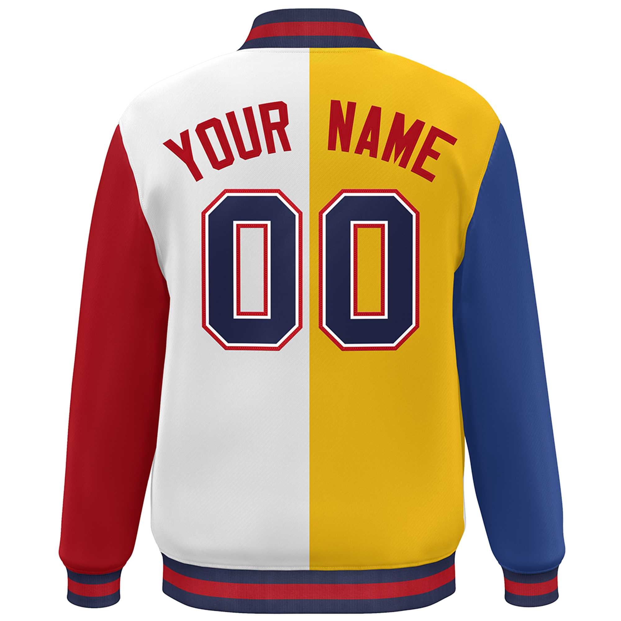 Custom Royal Gold White-Red Color Block Bomber Varsity Full-Snap Baseball Jacket