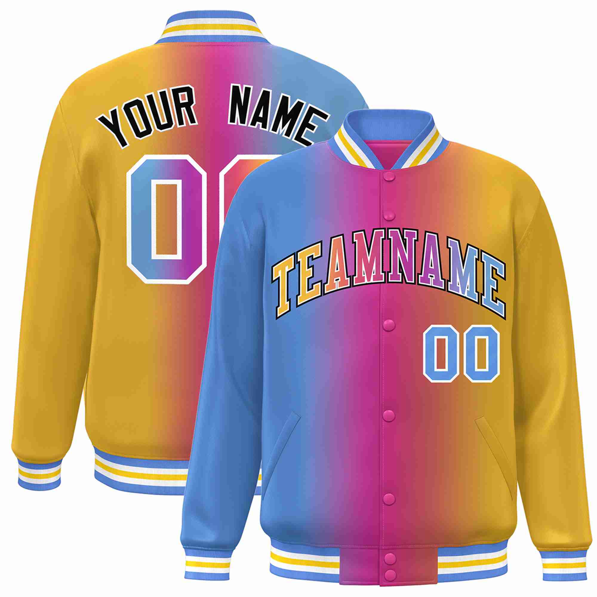 Custom Light Blue Purple-Yellow-White Gradient Fashion Letterman Bomber Varsity Jacket