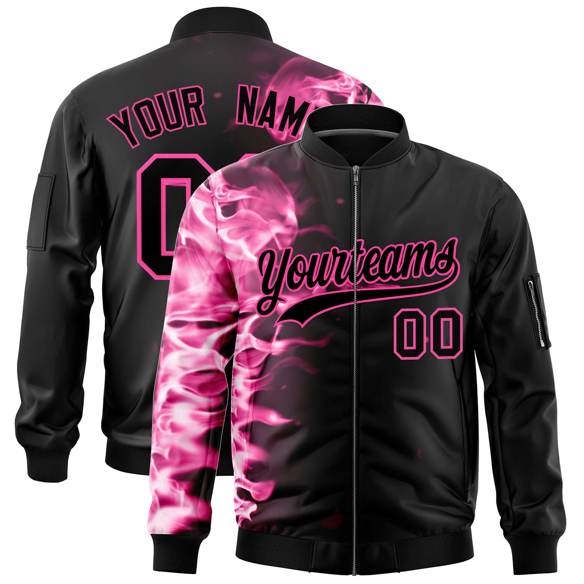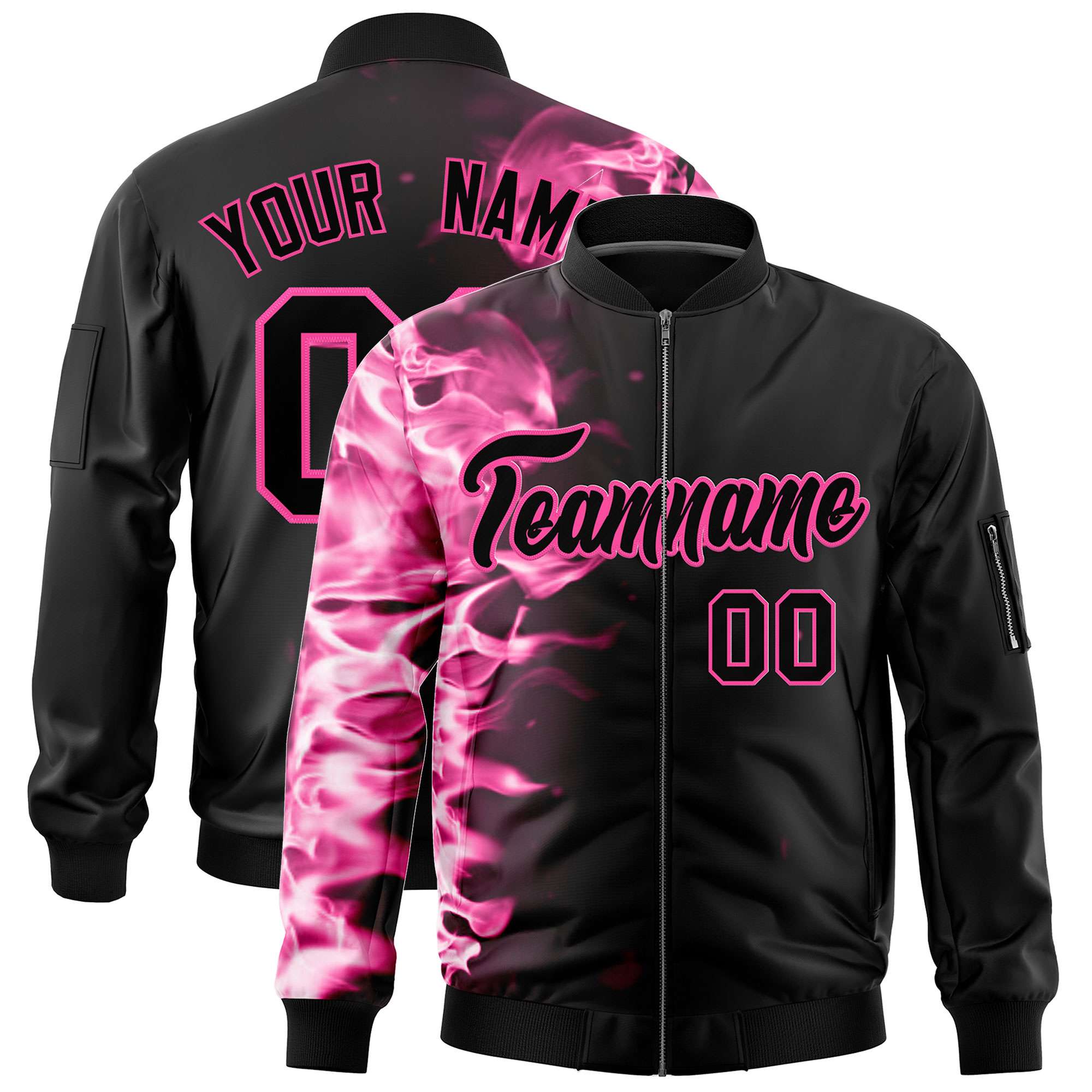 Custom Black 3D Flame Varsity Full-Zip Letterman Bomber Jacket