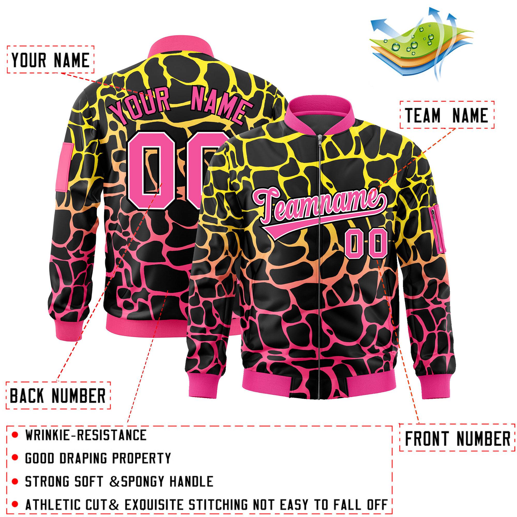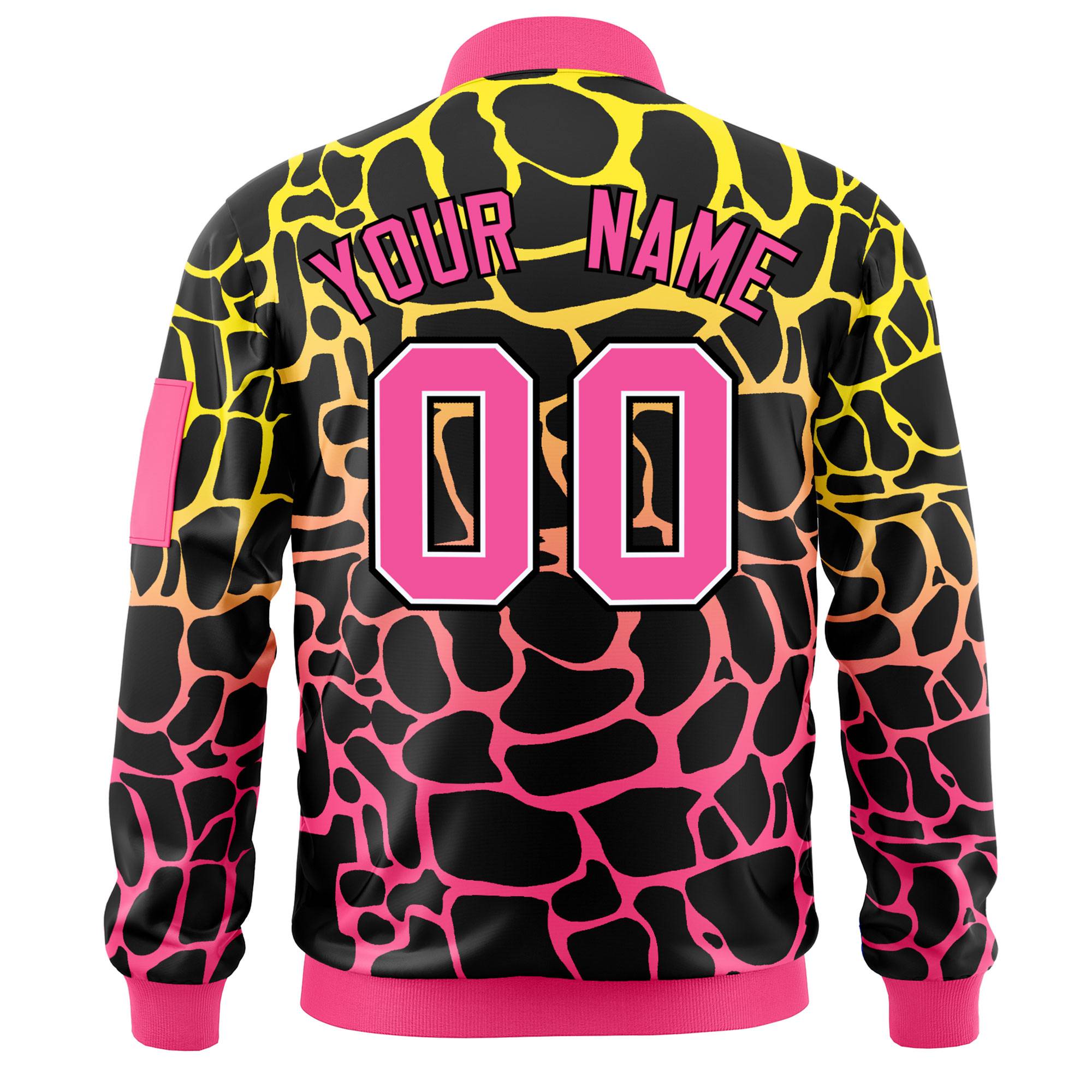 Custom Black Gold-Pink Varsity Full-Zip Spotted Letterman Bomber Jacket