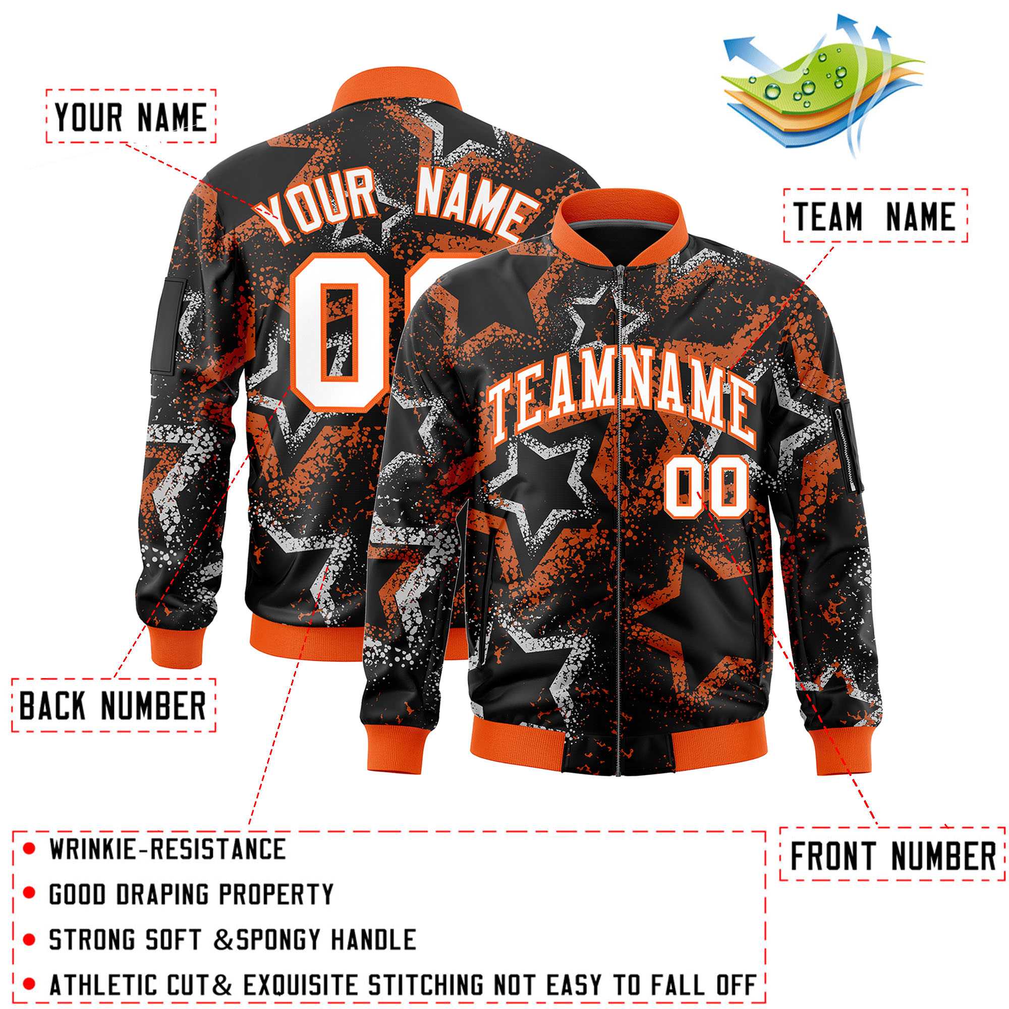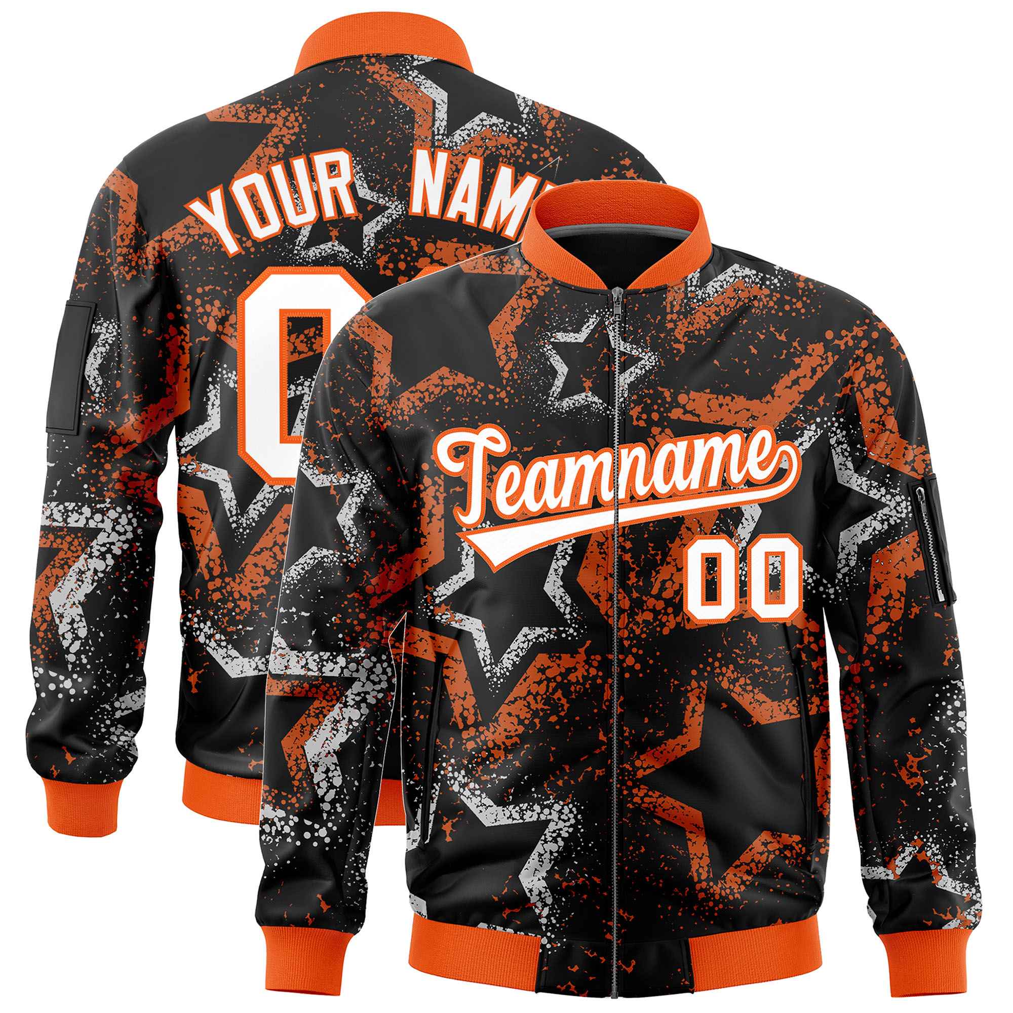 Custom Black Varsity Full-Zip Star Pattern Letterman Bomber Jacket