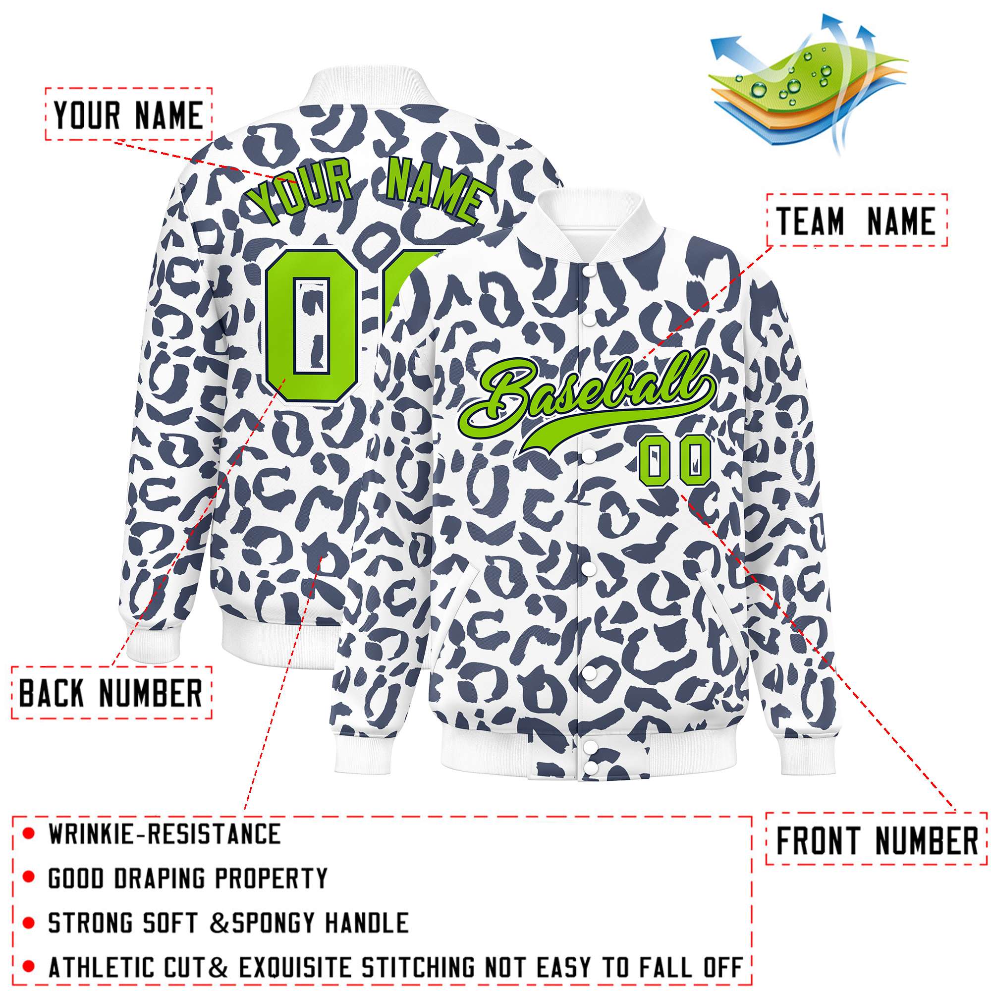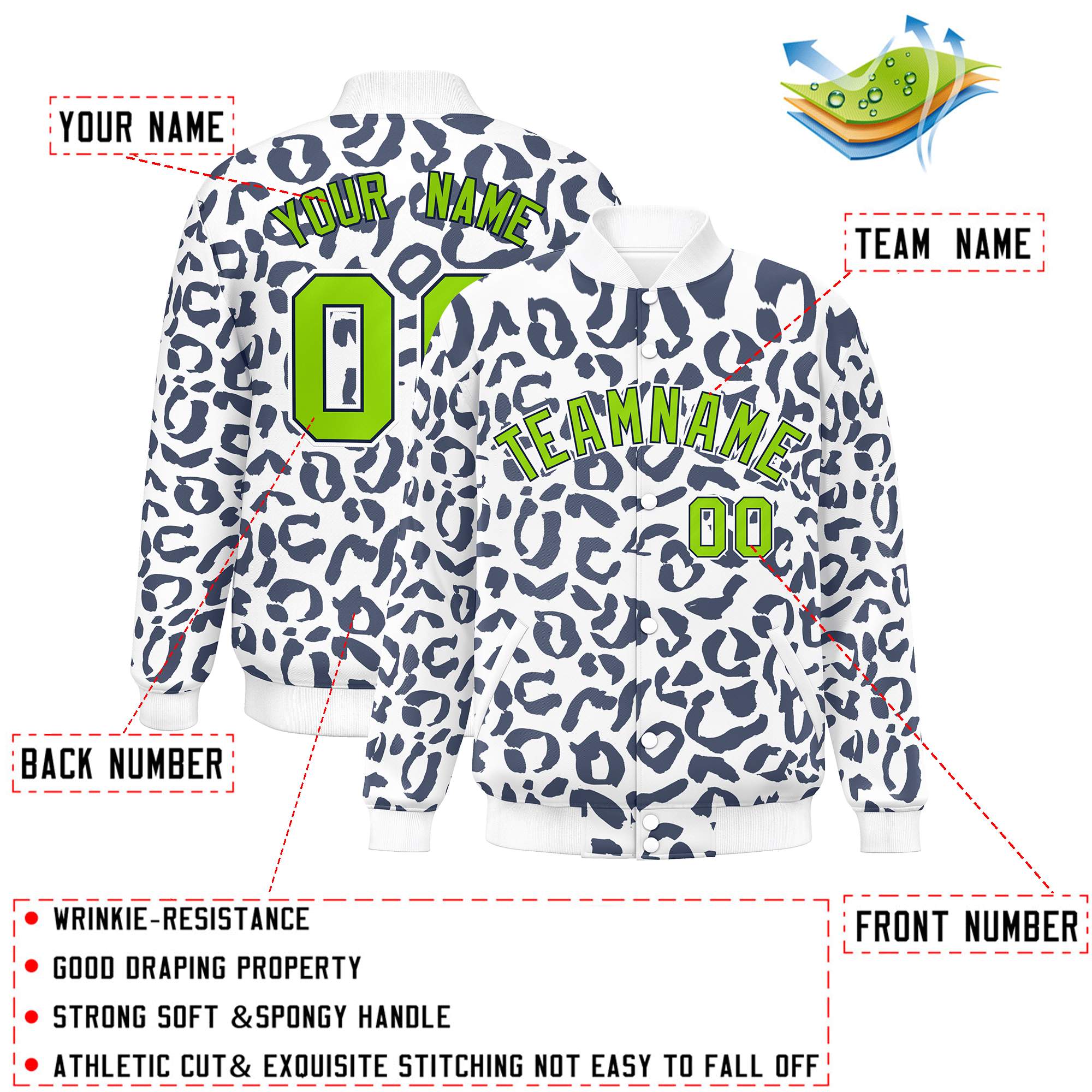 Custom White Navy Varsity Full-Snap Leopard Print Graffiti Pattern Letterman Baseball Jacket