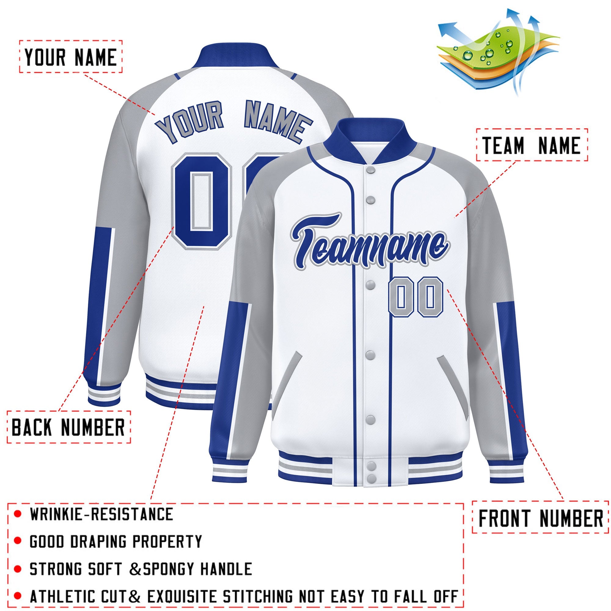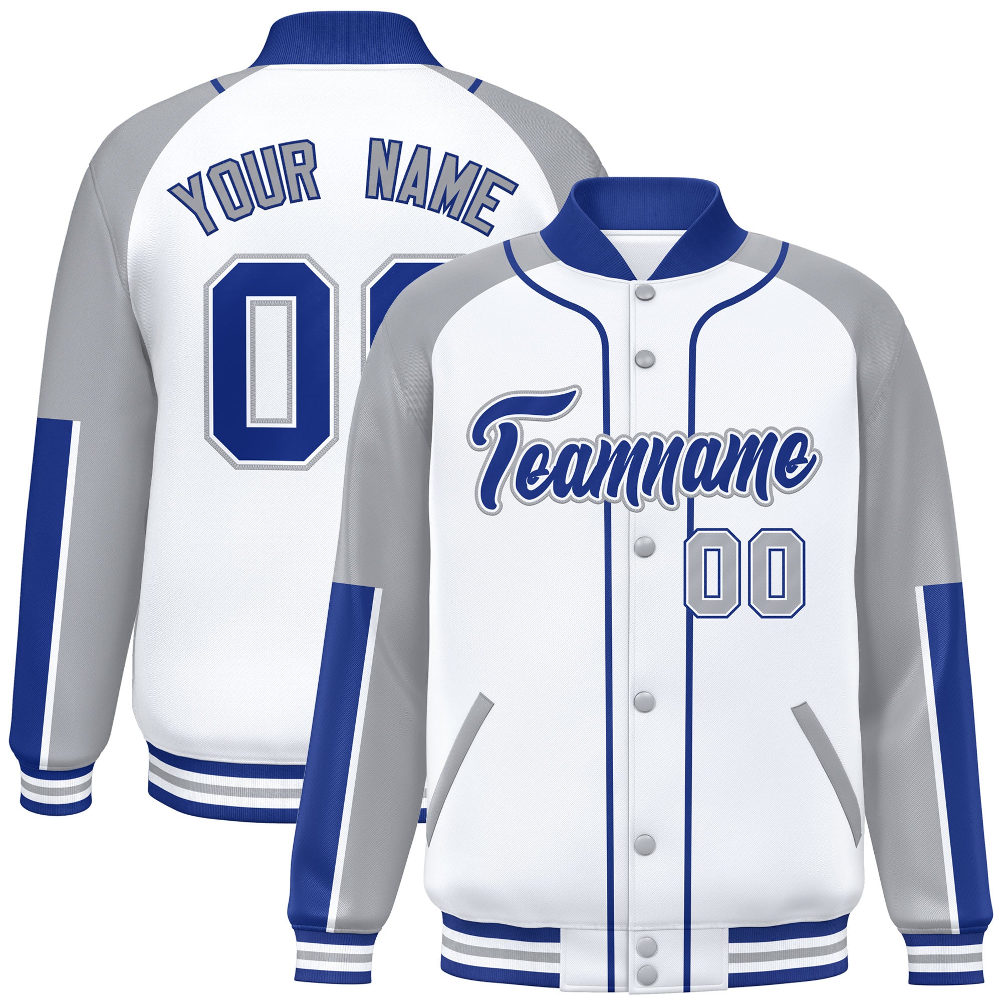 Custom White Gray-Royal Raglan Sleeves Varsity Full-Snap Letterman Baseball Jacket