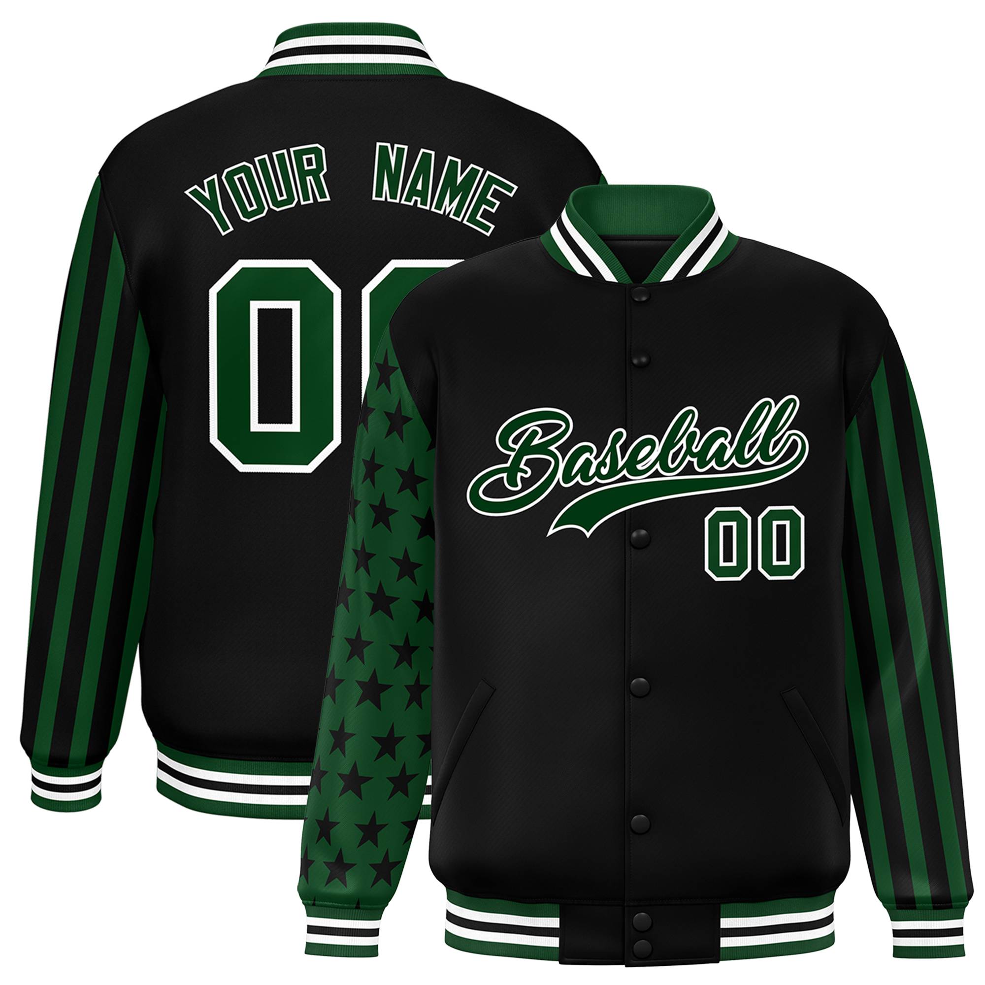 Custom Black Green American Flag Varsity Full-Snap Authentic Raglan Sleeves Letterman Bomber Jacket
