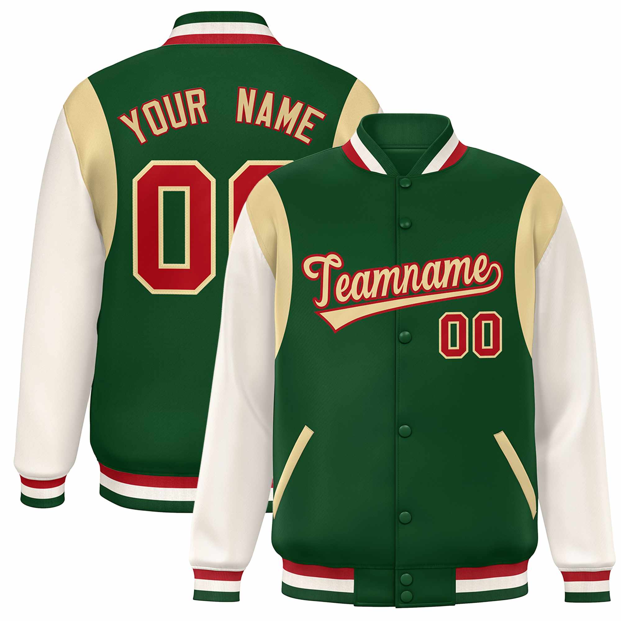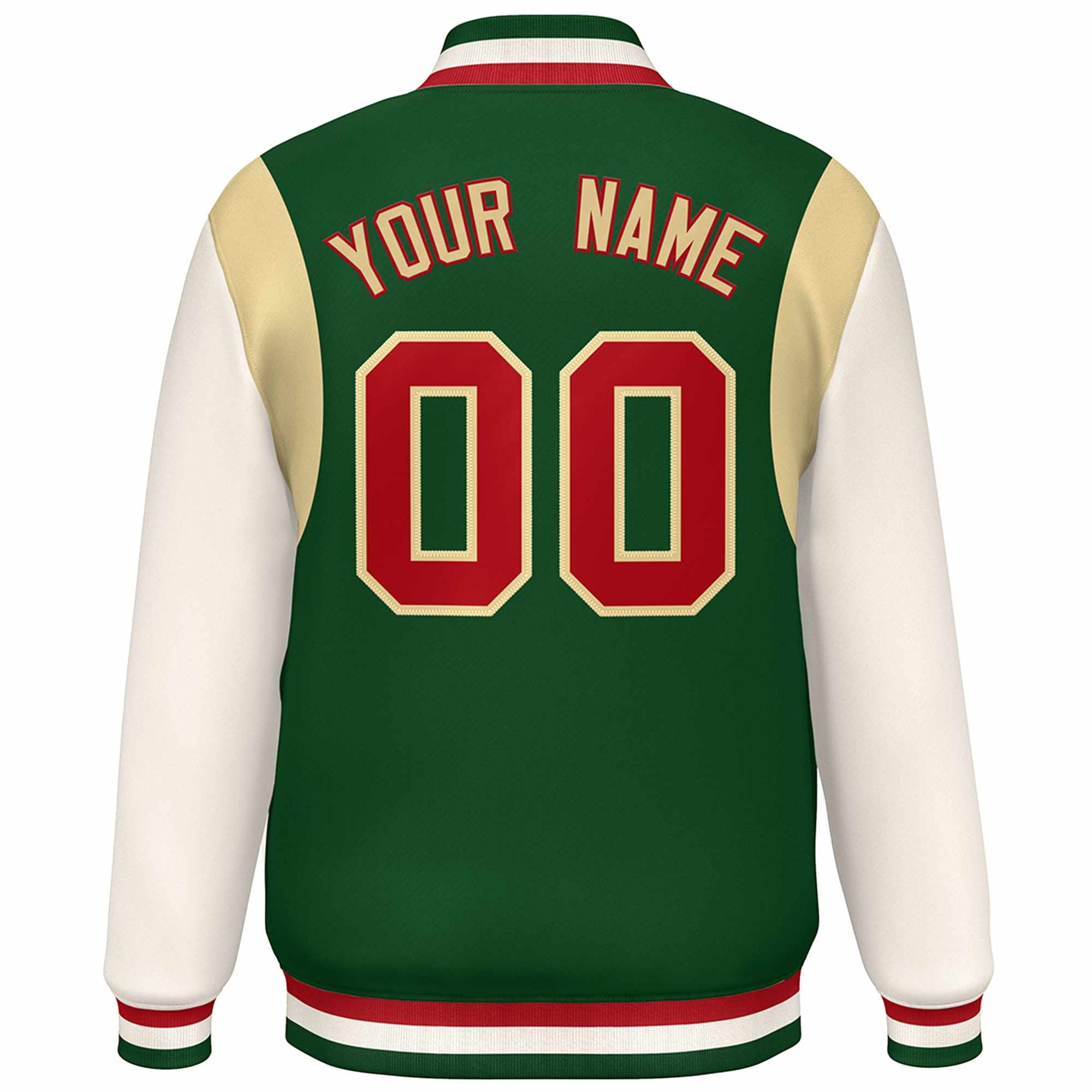 Custom Green Khaki-Red Color Block Bomber Varsity Full-Snap Baseball Jacket