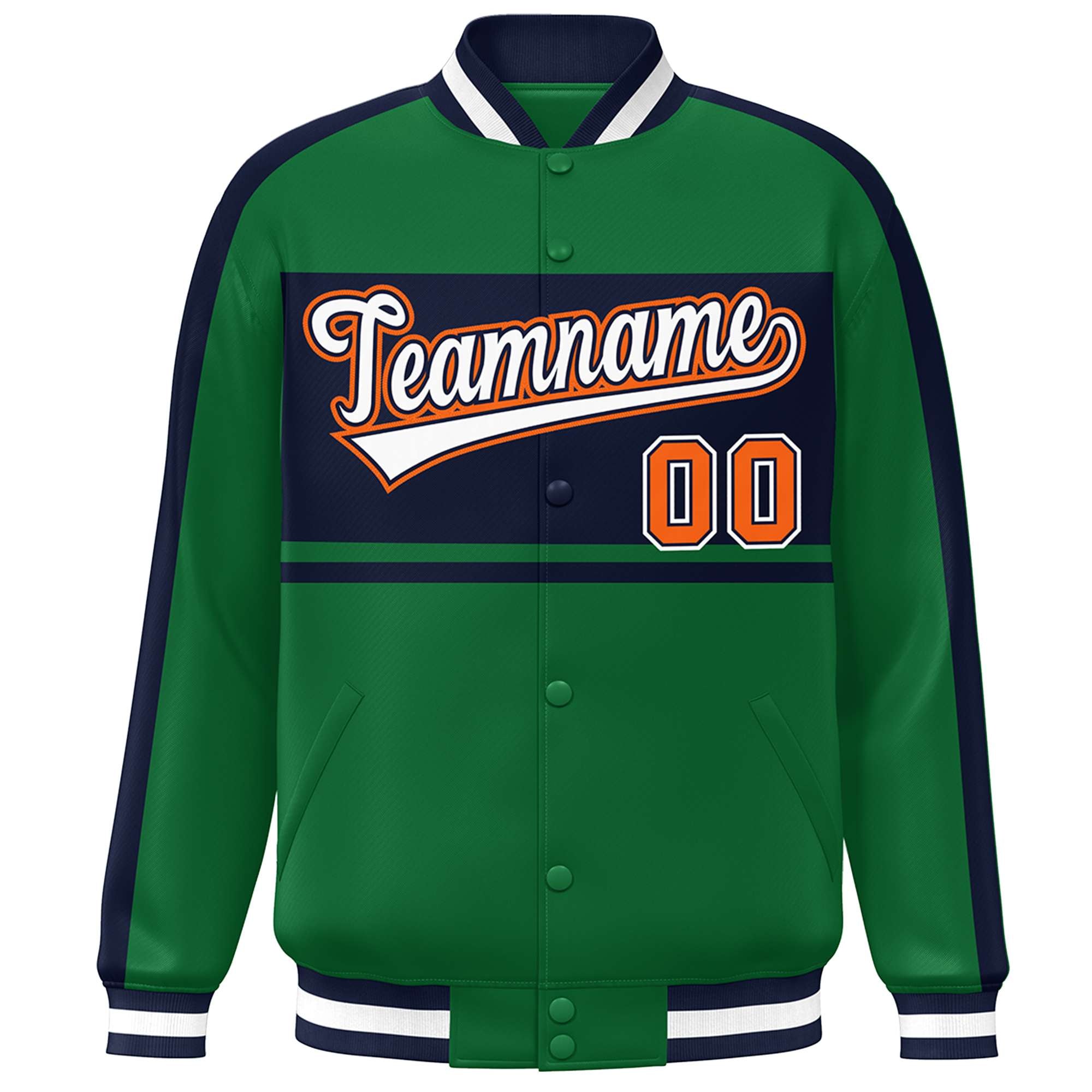 Custom Green Navy-White Color Block Bomber Varsity Baseball Jacket