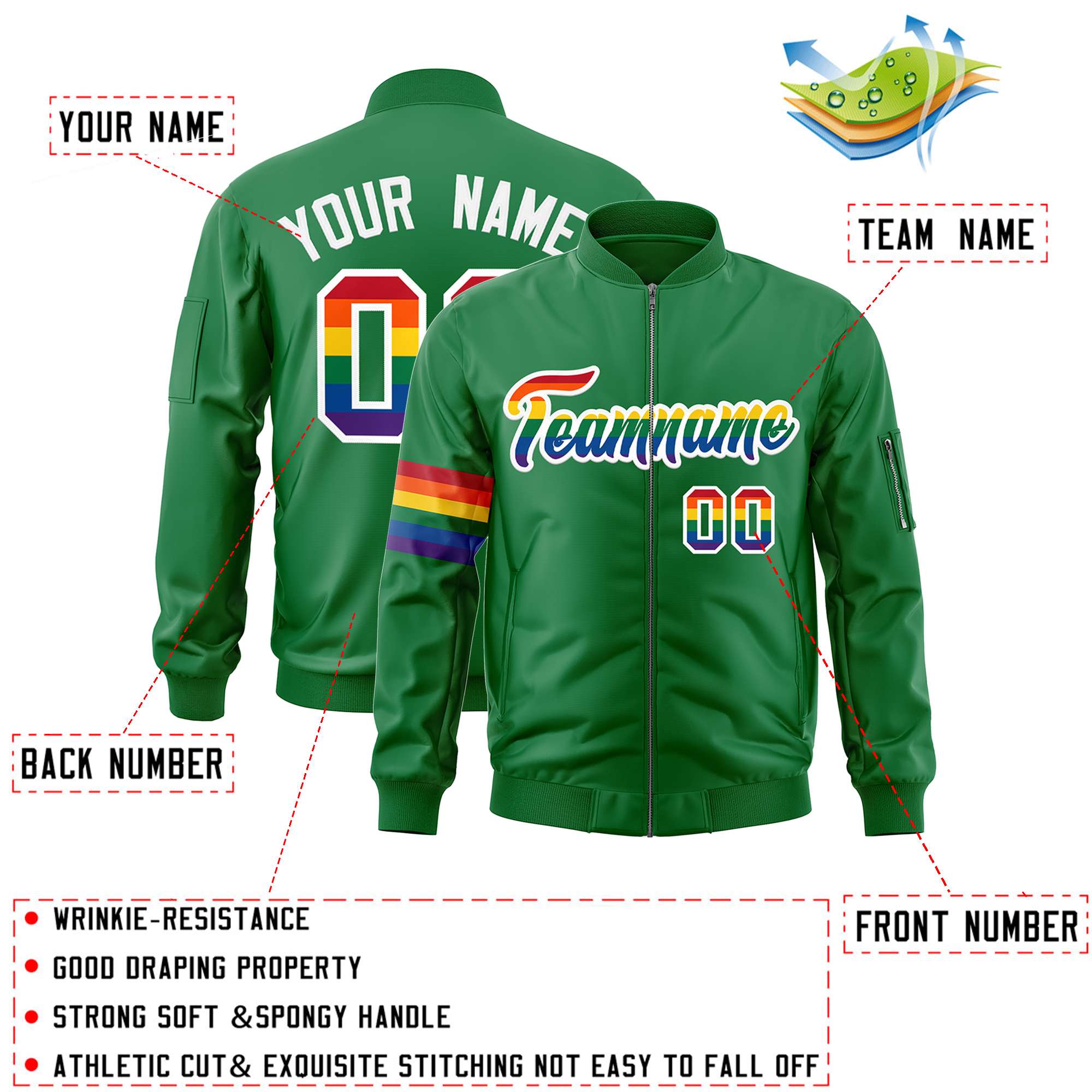 Custom Kelly Green LGBT Rainbow For Pride Month Classic Style Letterman Bomber Jacket