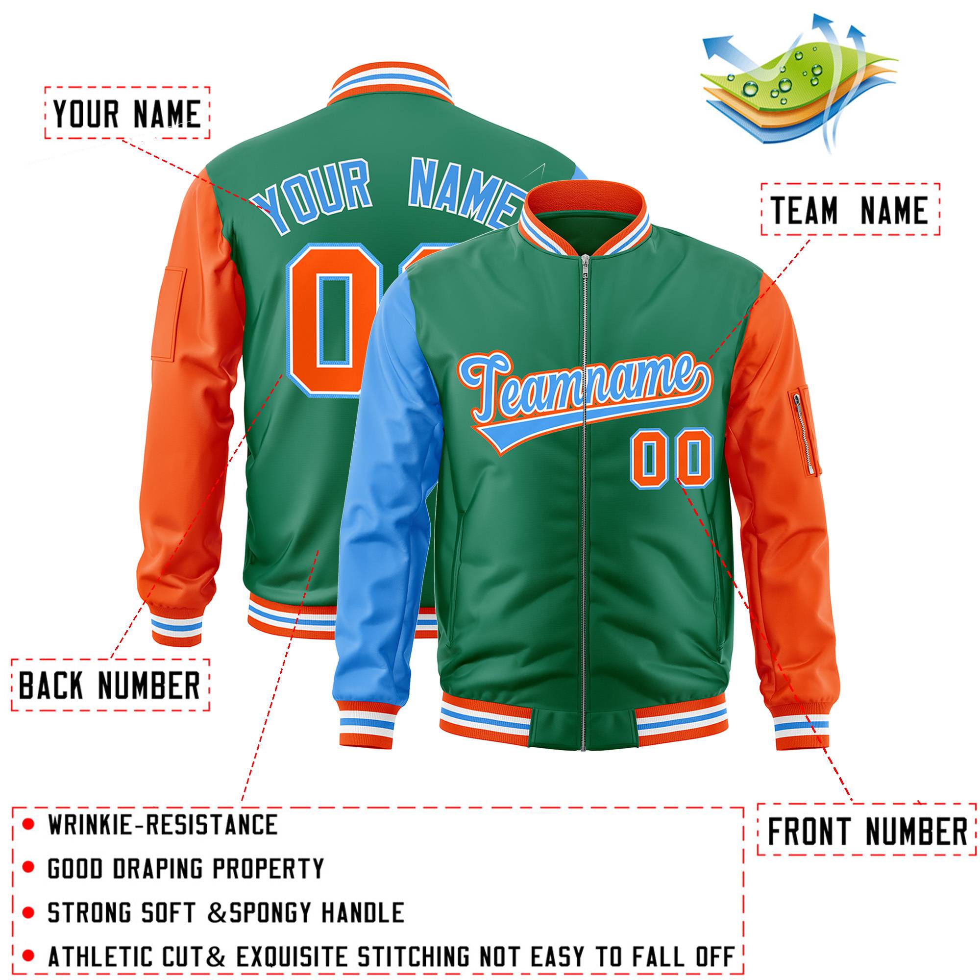 Custom Kelly Green Orange-Powder Blue Varsity Full-Zip Raglan Sleeves Letterman Bomber Jacket