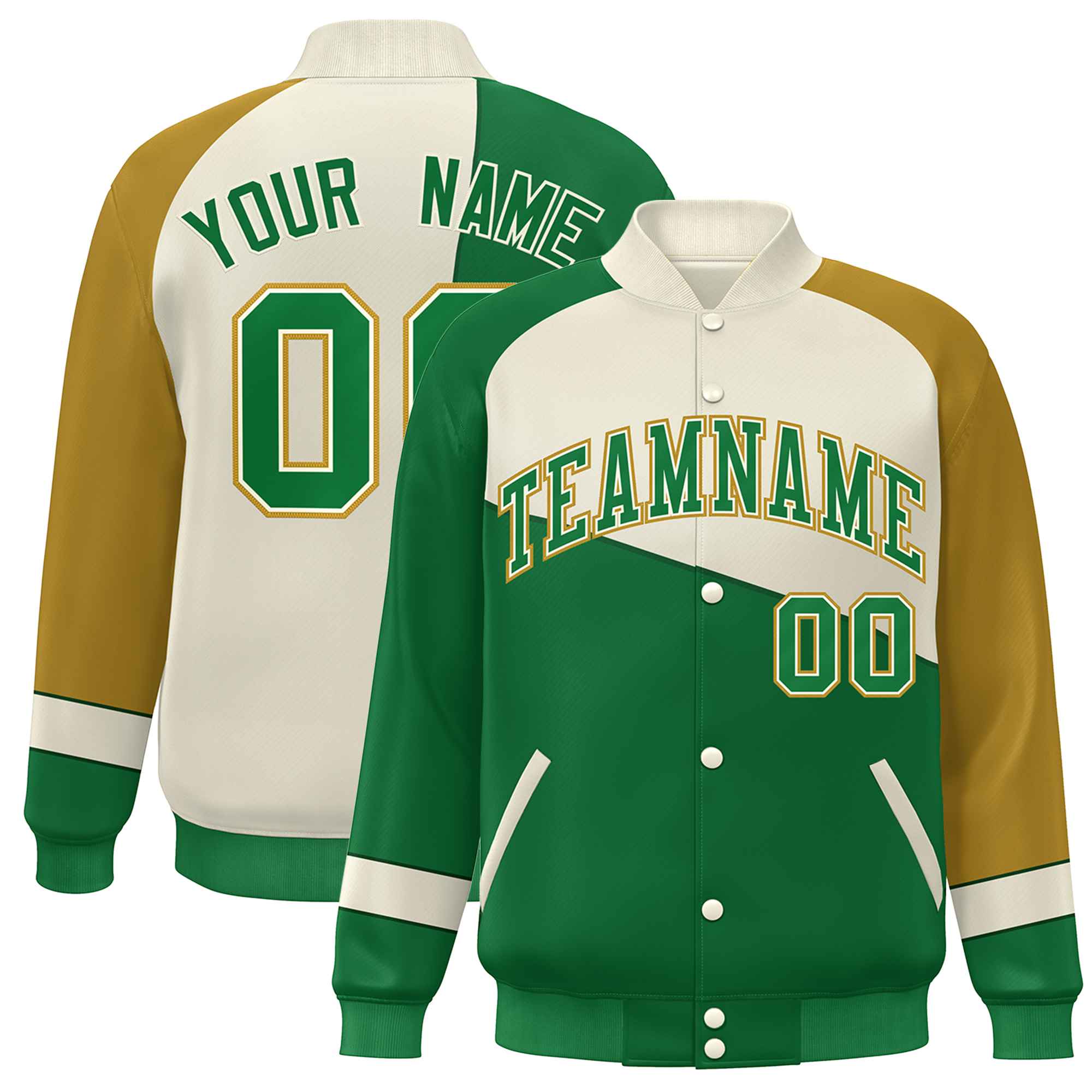 Custom Kelly Green White-Old Gold Color Block Bomber Varsity Full-Snap Baseball Jacket