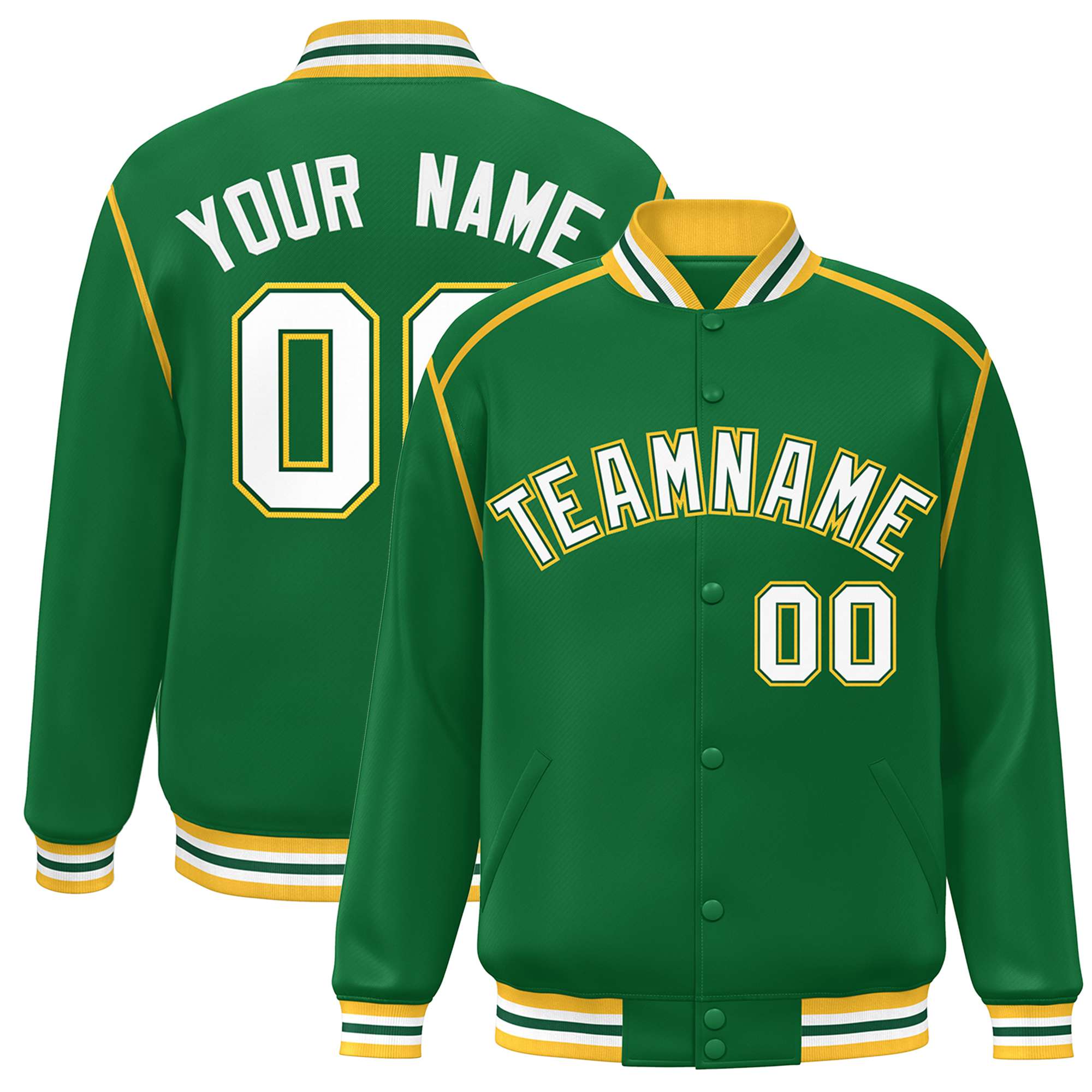 Custom Kelly Green White-Yellow Color Block Ribbon Varsity Full-Snap Bomber Jacket