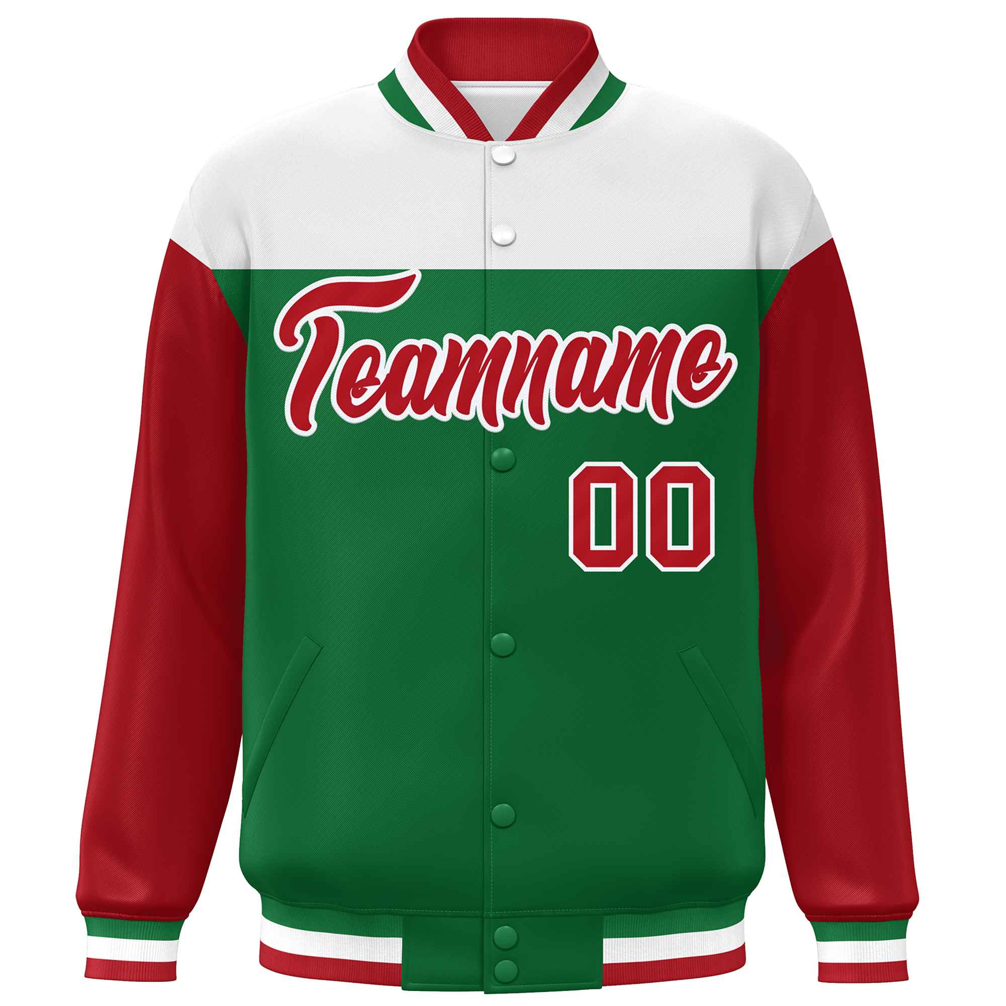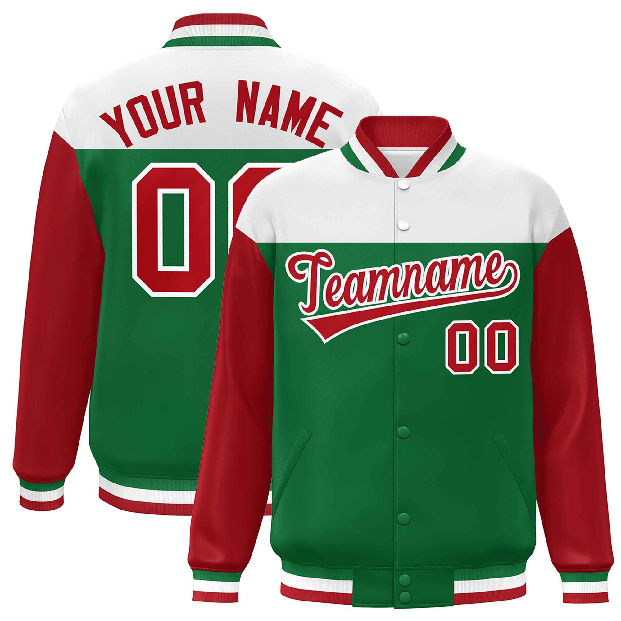 Custom White Kelly Green-Red Letterman Color Block Varsity Full-Snap Baseball Jacket