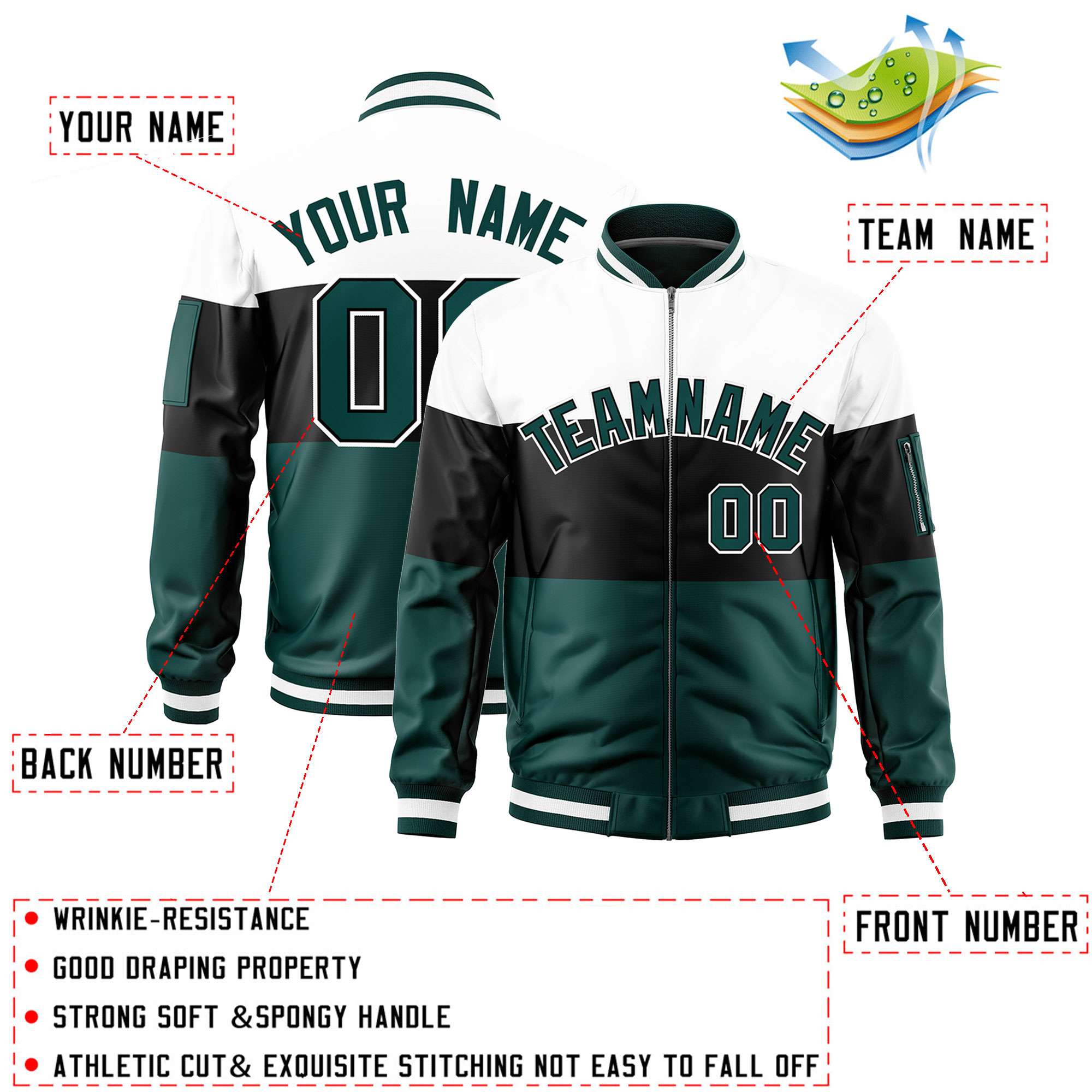 Custom White Black-Midnight Green Varsity Full-Zip Color Block Letterman Bomber Jacket