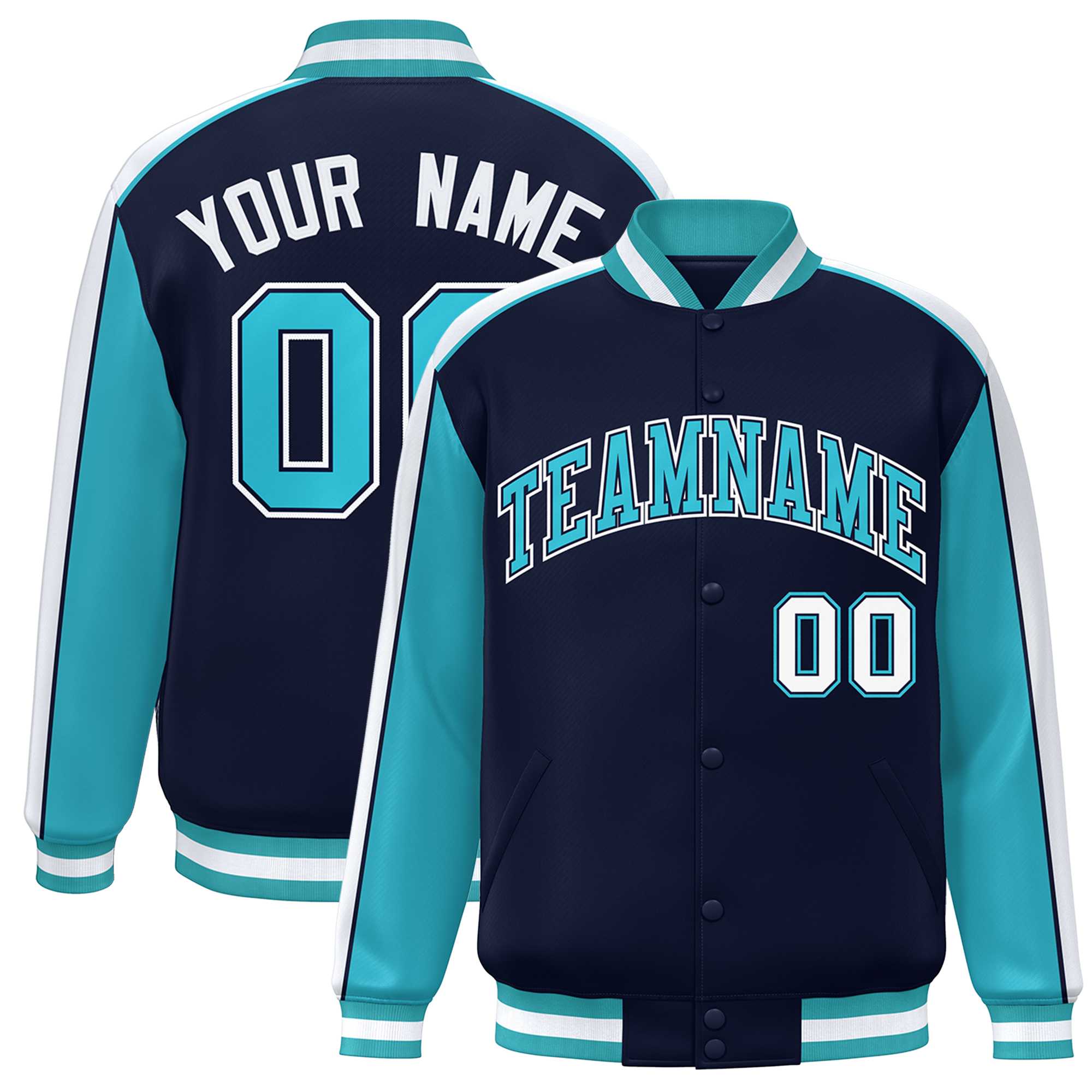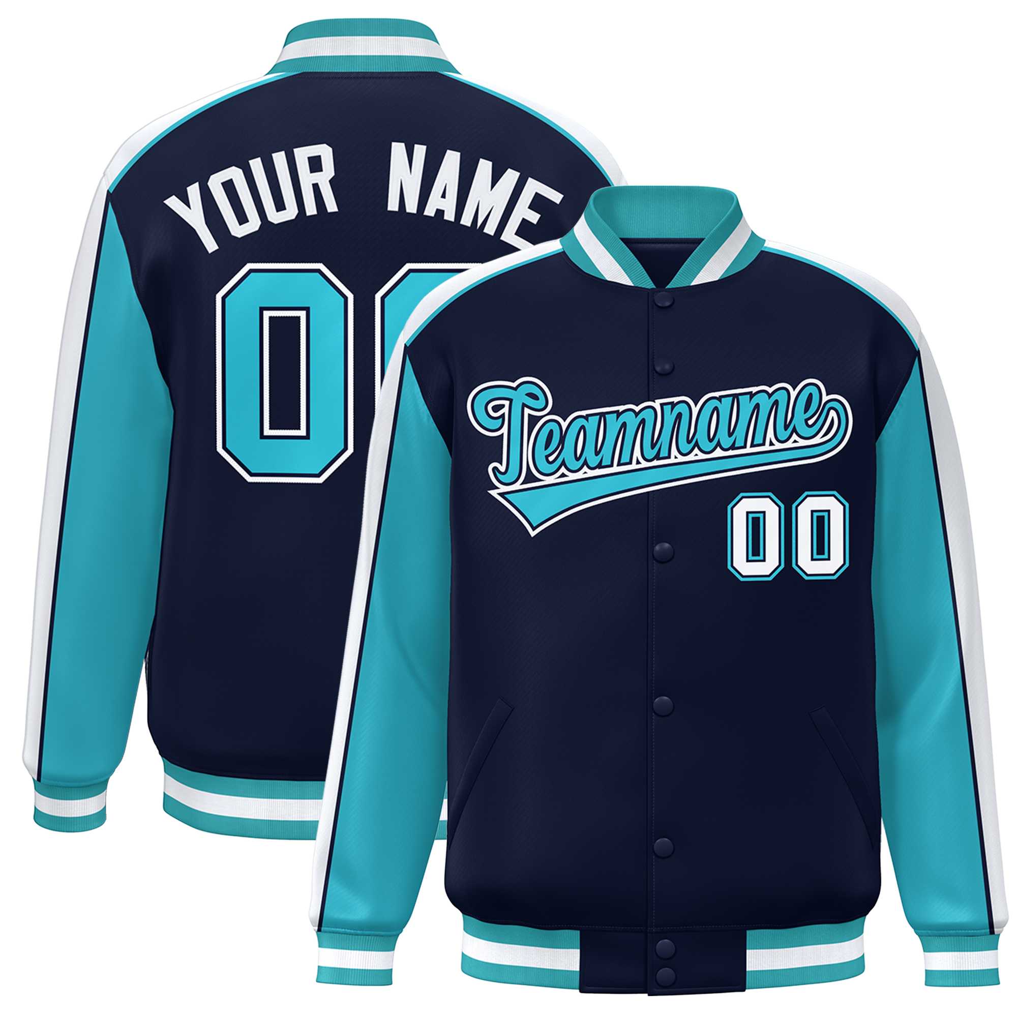 Custom Navy Aqua-White Color Block Bomber Varsity Full-Snap Baseball Jacket