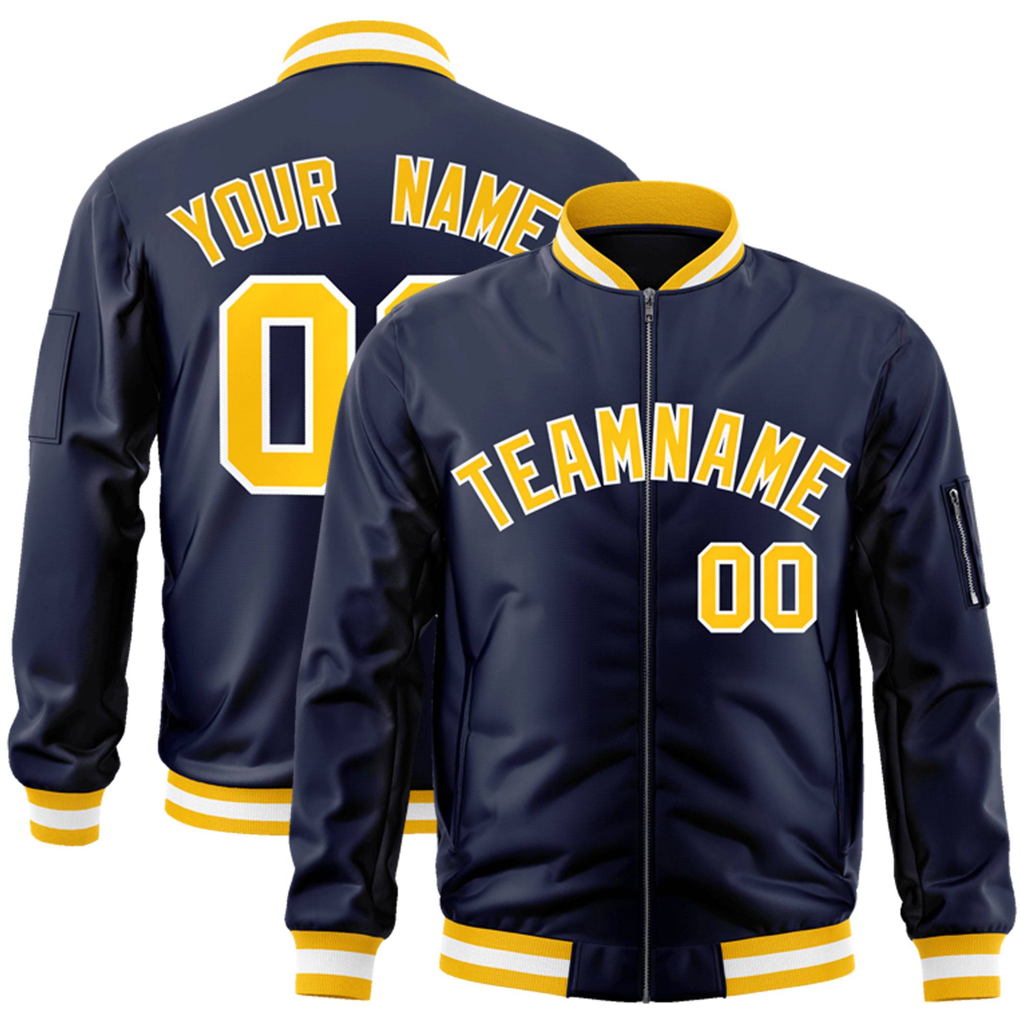 Custom Navy Gold-White Varsity Full-Zip Letterman Bomber Jacket