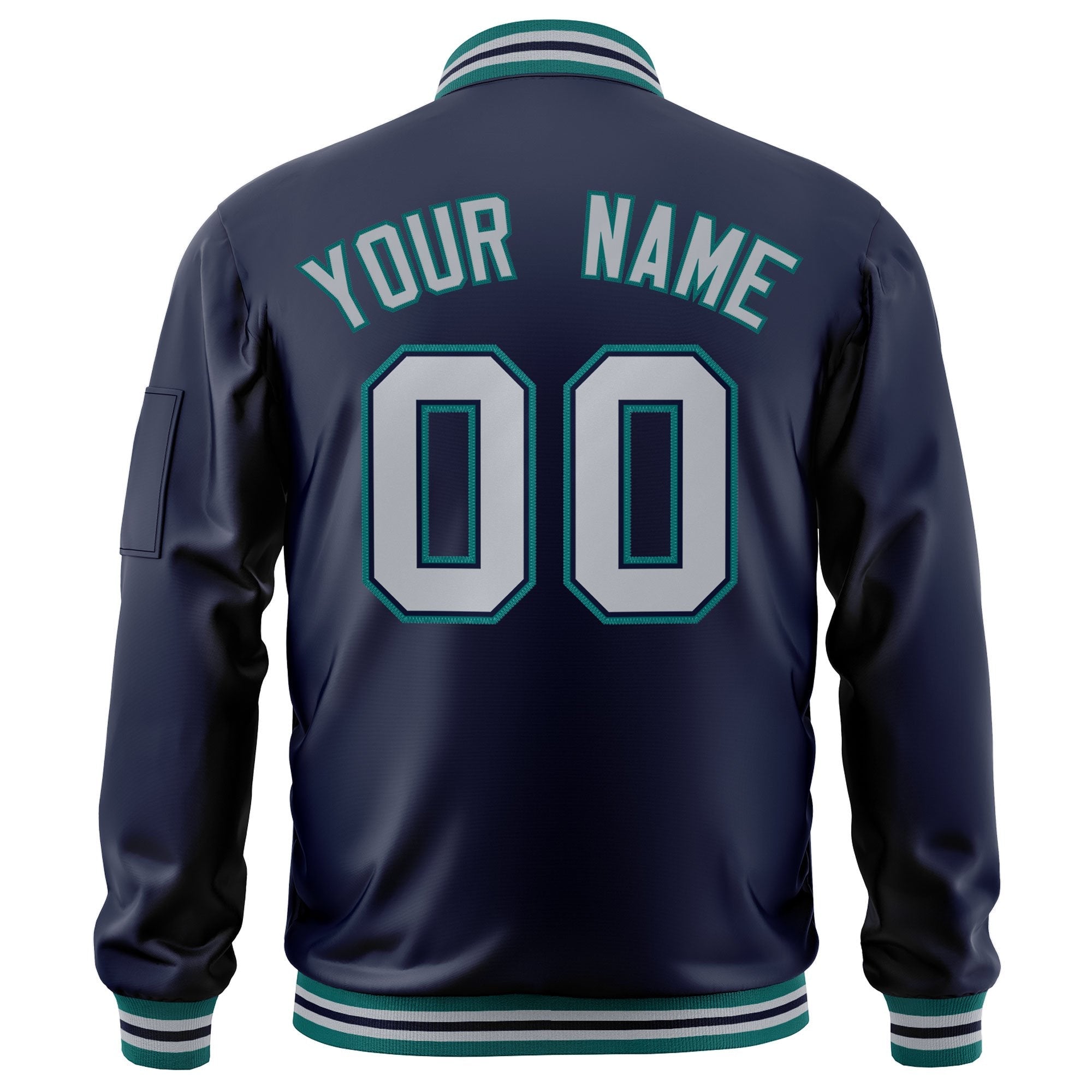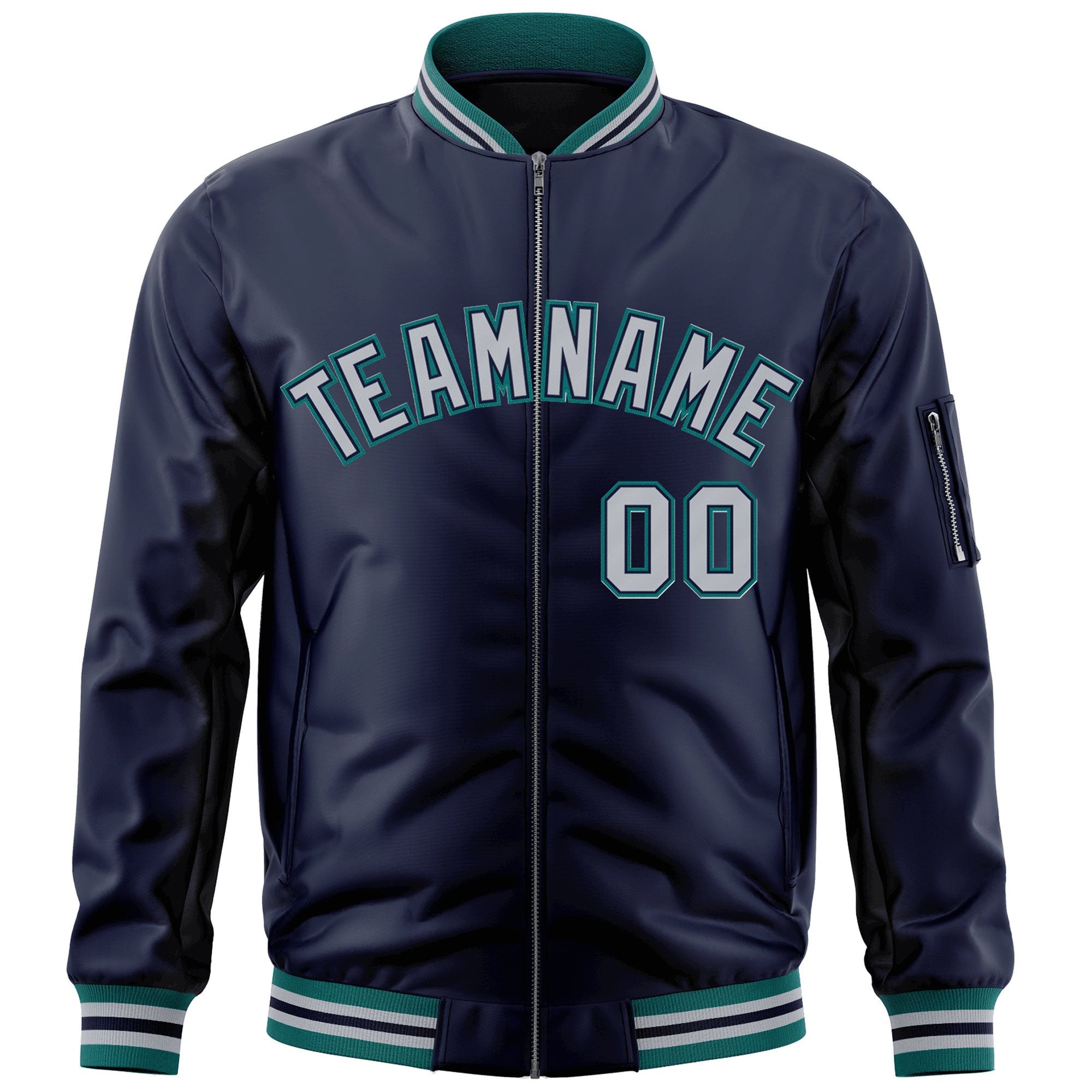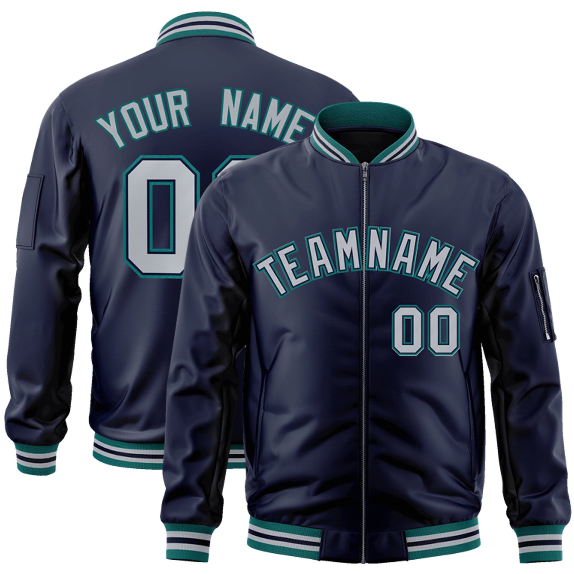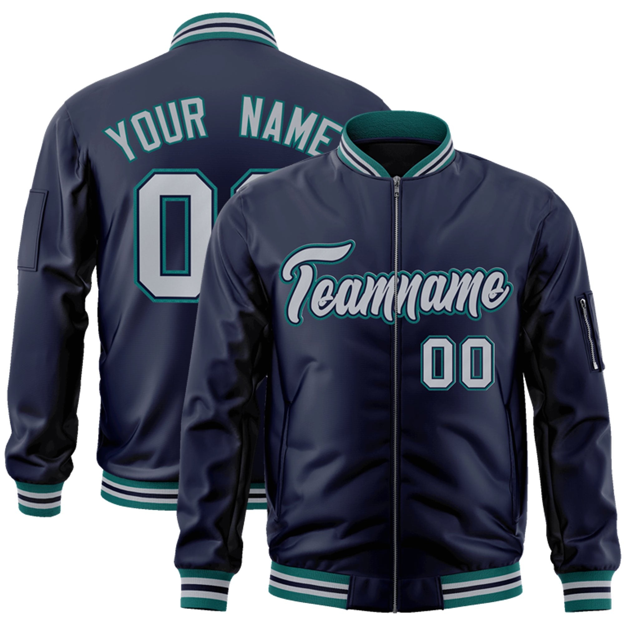 Custom Navy Gray-Aqua Varsity Full-Zip Letterman Bomber Jacket