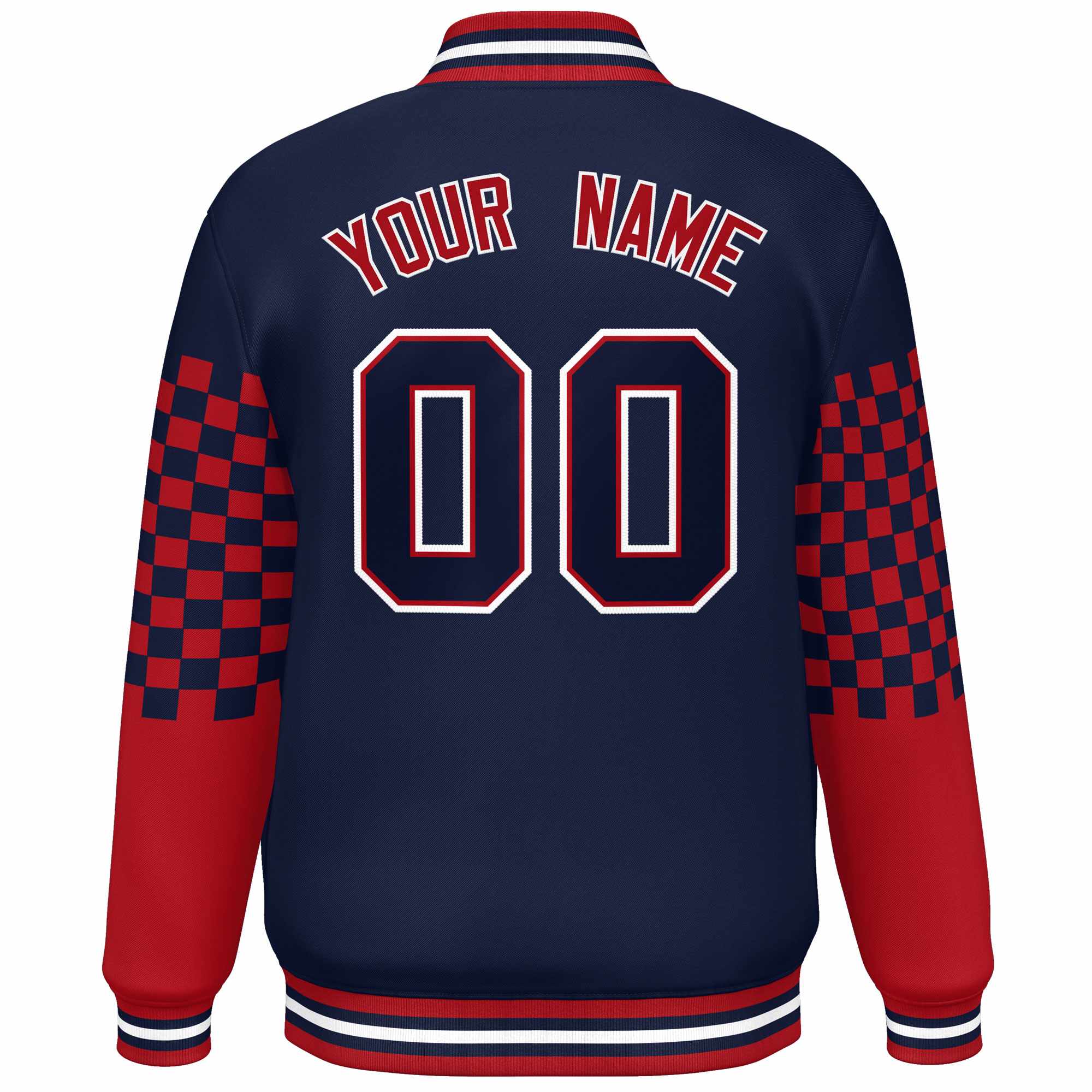 Custom Navy Red-White Checkered Pattern Color Block Bomber Varsity Jacket