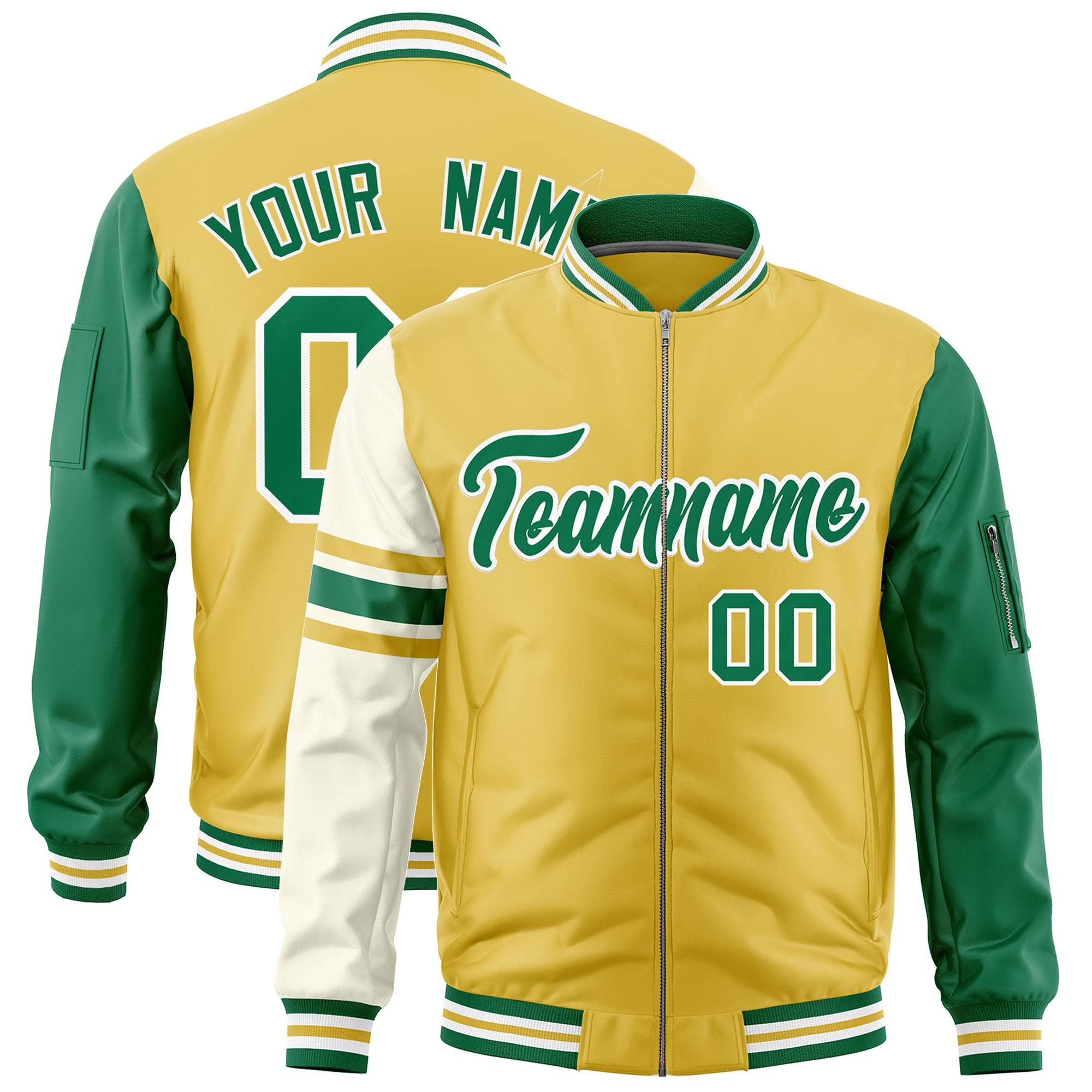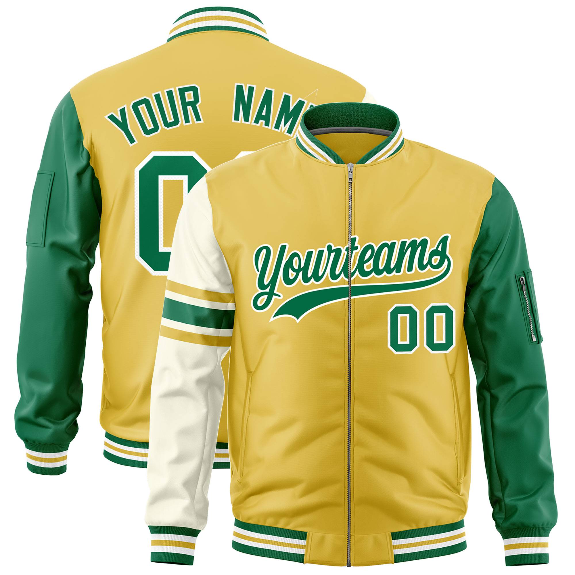 Custom Old Gold Kelly Green-White Varsity Full-Zip Raglan Sleeves Stripe Letterman Bomber Jacket