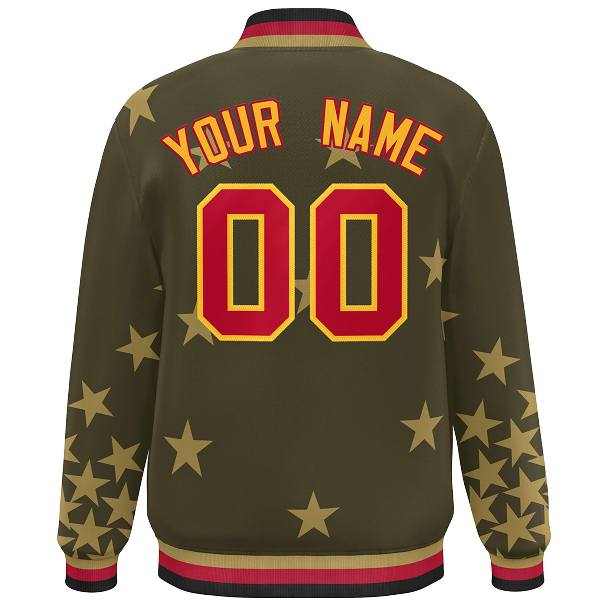 Custom Olive Red-Yellow Star Graffiti Pattern Varsity Full-Snap Bomber Jacket