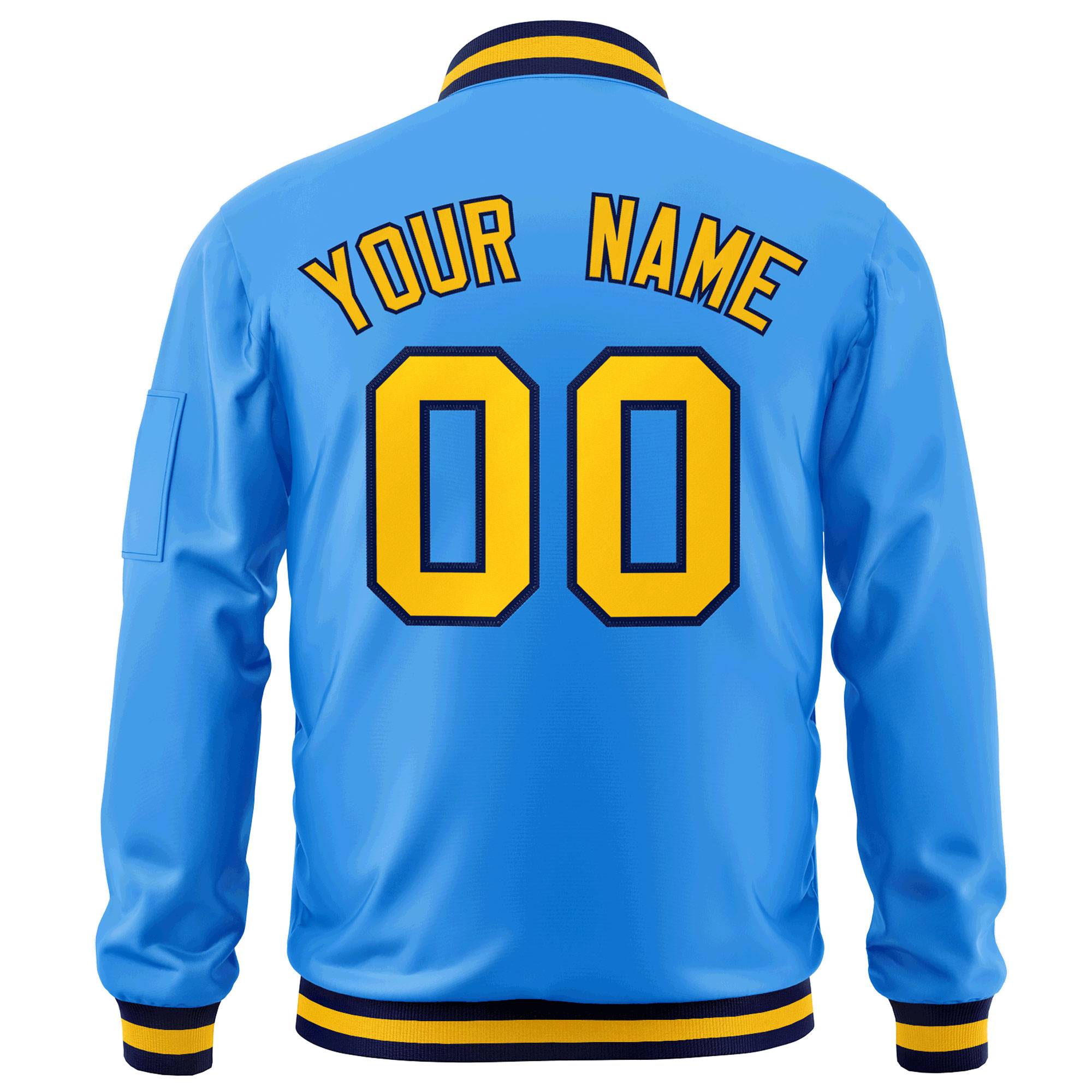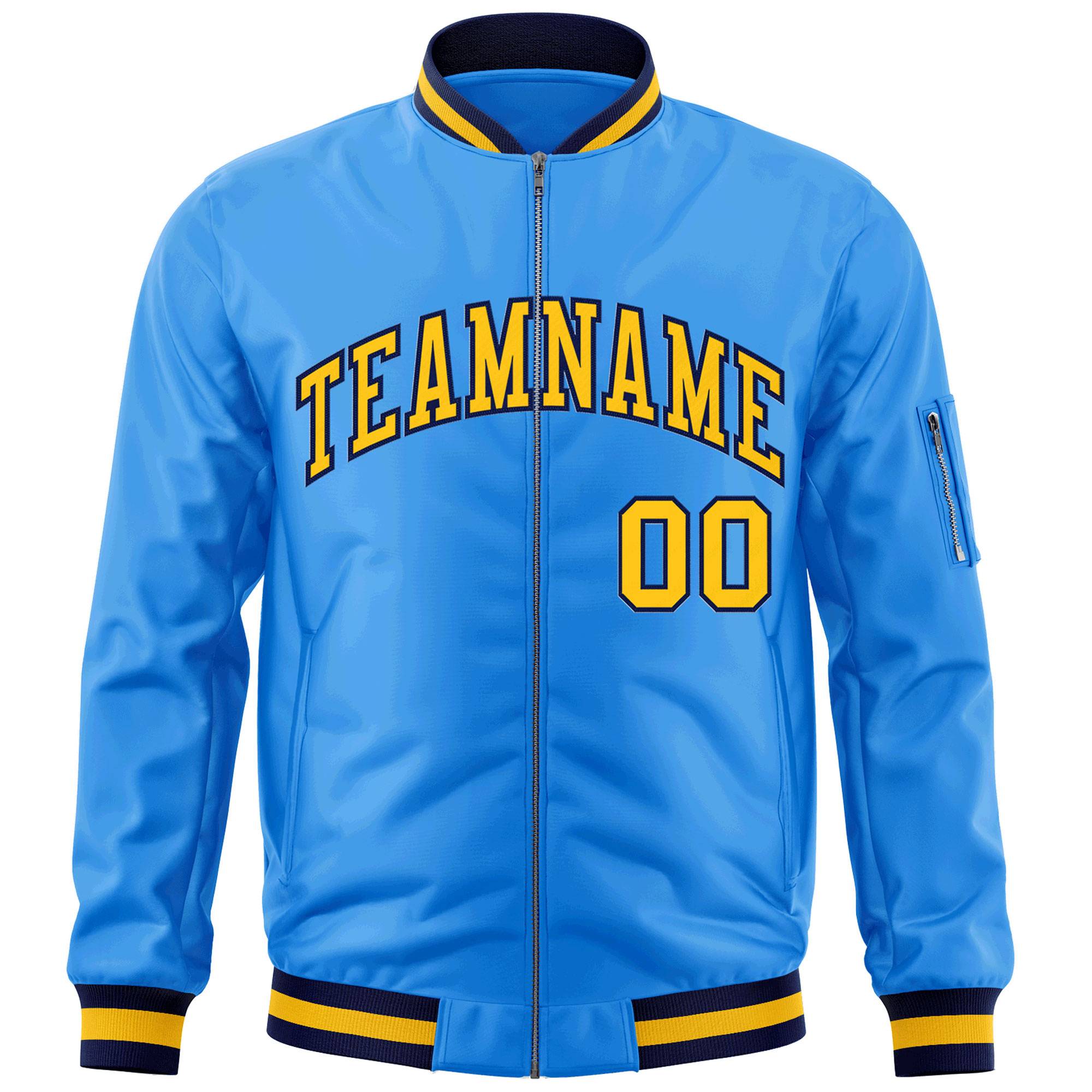 Custom Powder Blue Gold-Navy Varsity Full-Zip Letterman Bomber Jacket