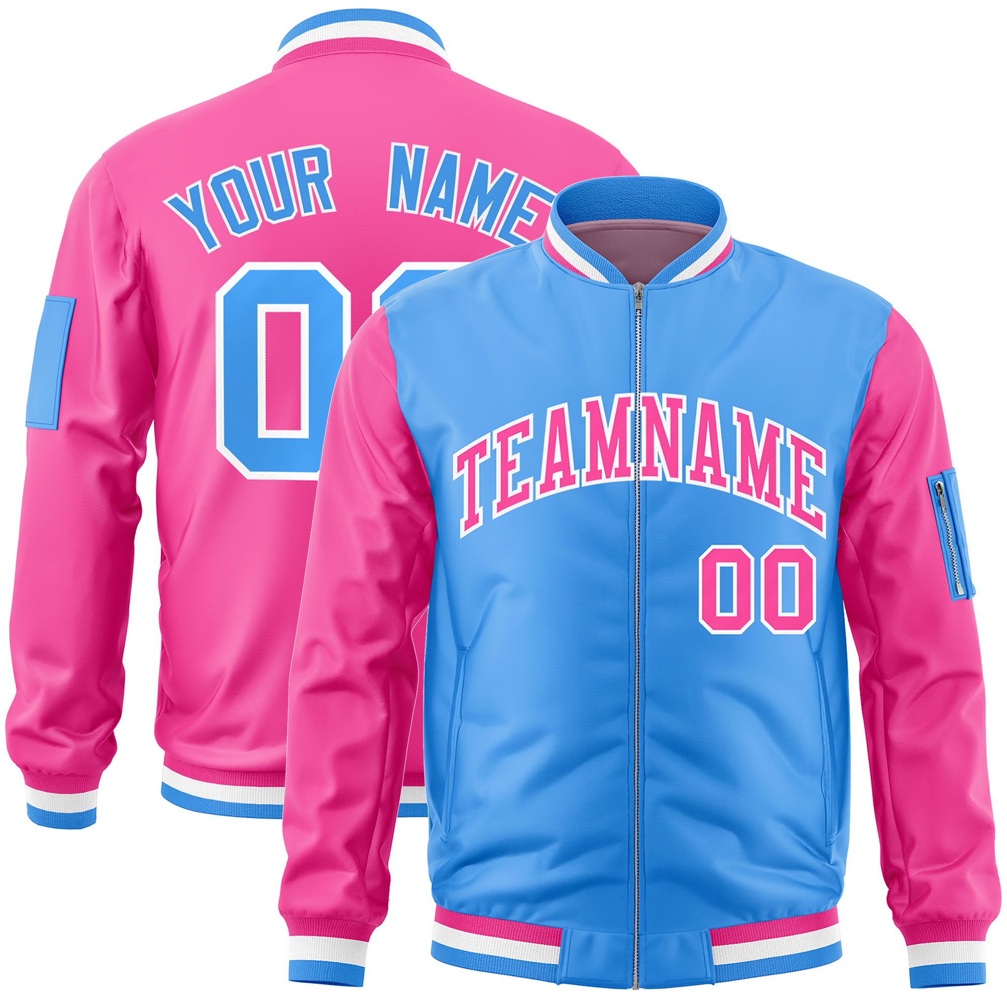 Custom Powder Blue Pink Varsity Full-Zip Two-Tone Letterman Bomber Jacket