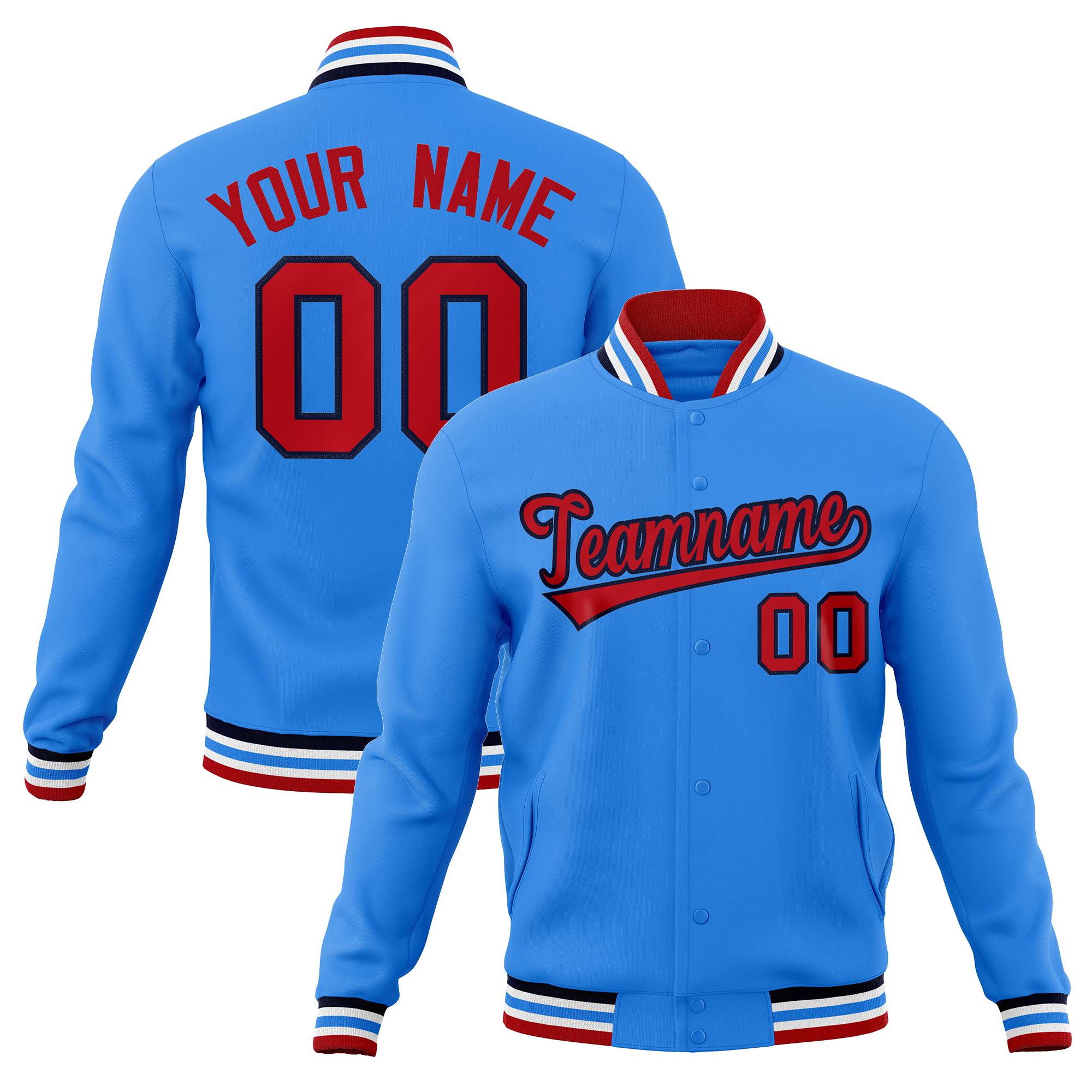 Custom Powder Blue Red-Navy Classic Style Varsity Full-Snap Letterman Jacket