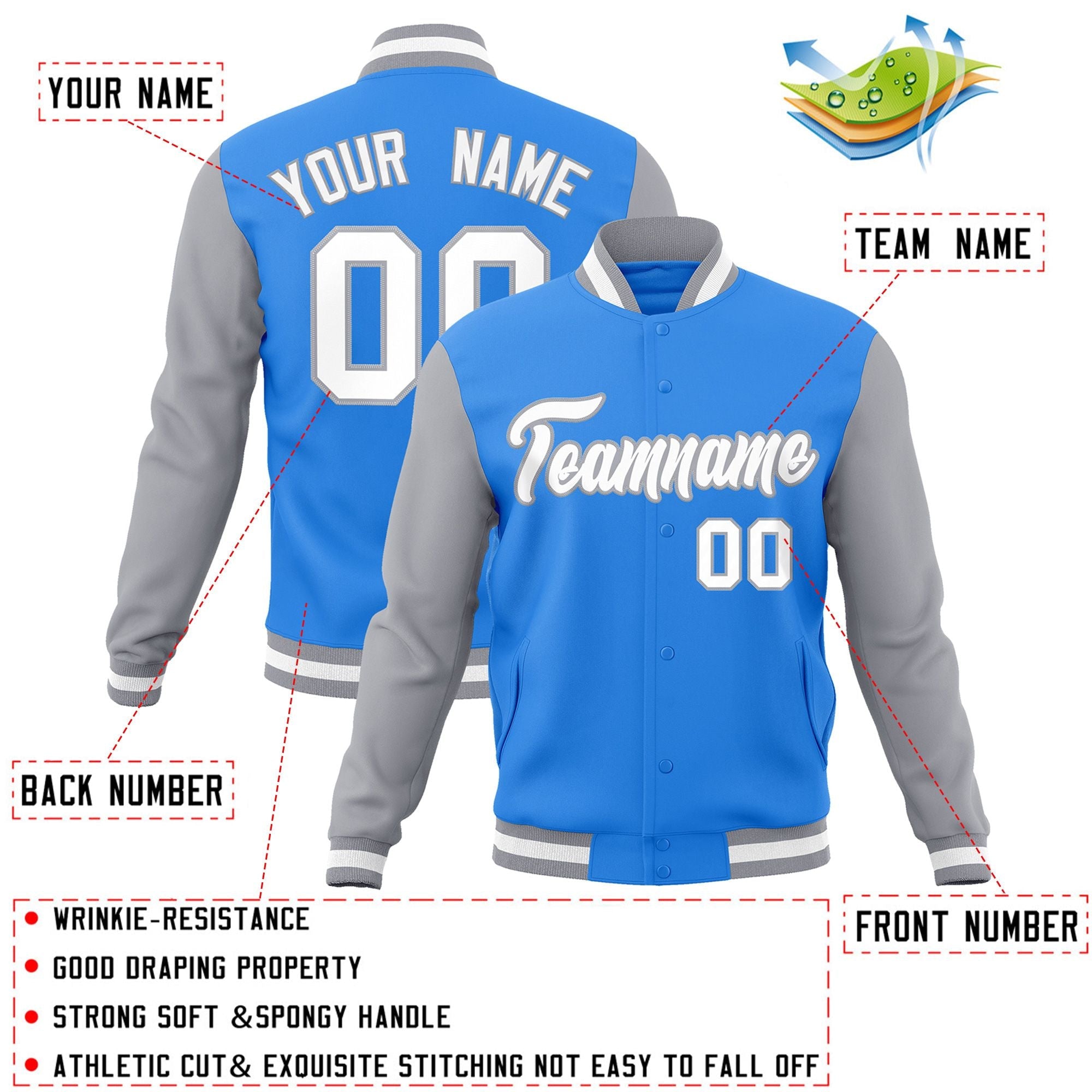 Custom Powder Blue White-Gray Raglan Sleeves Varsity Full-Snap Letterman Jacket