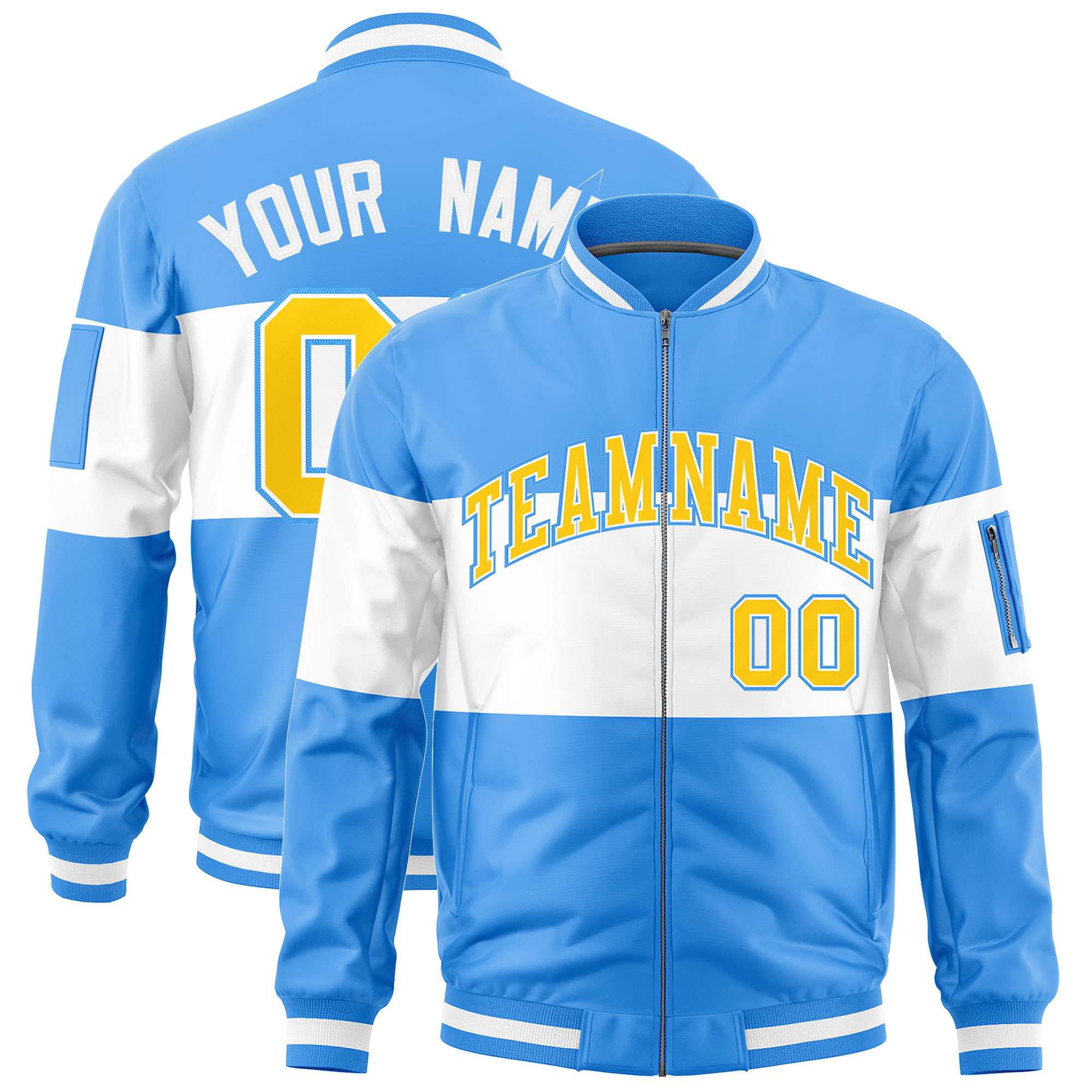 Custom Powder Blue White-Powder Blue Varsity Full-Zip Color Block Letterman Bomber Jacket