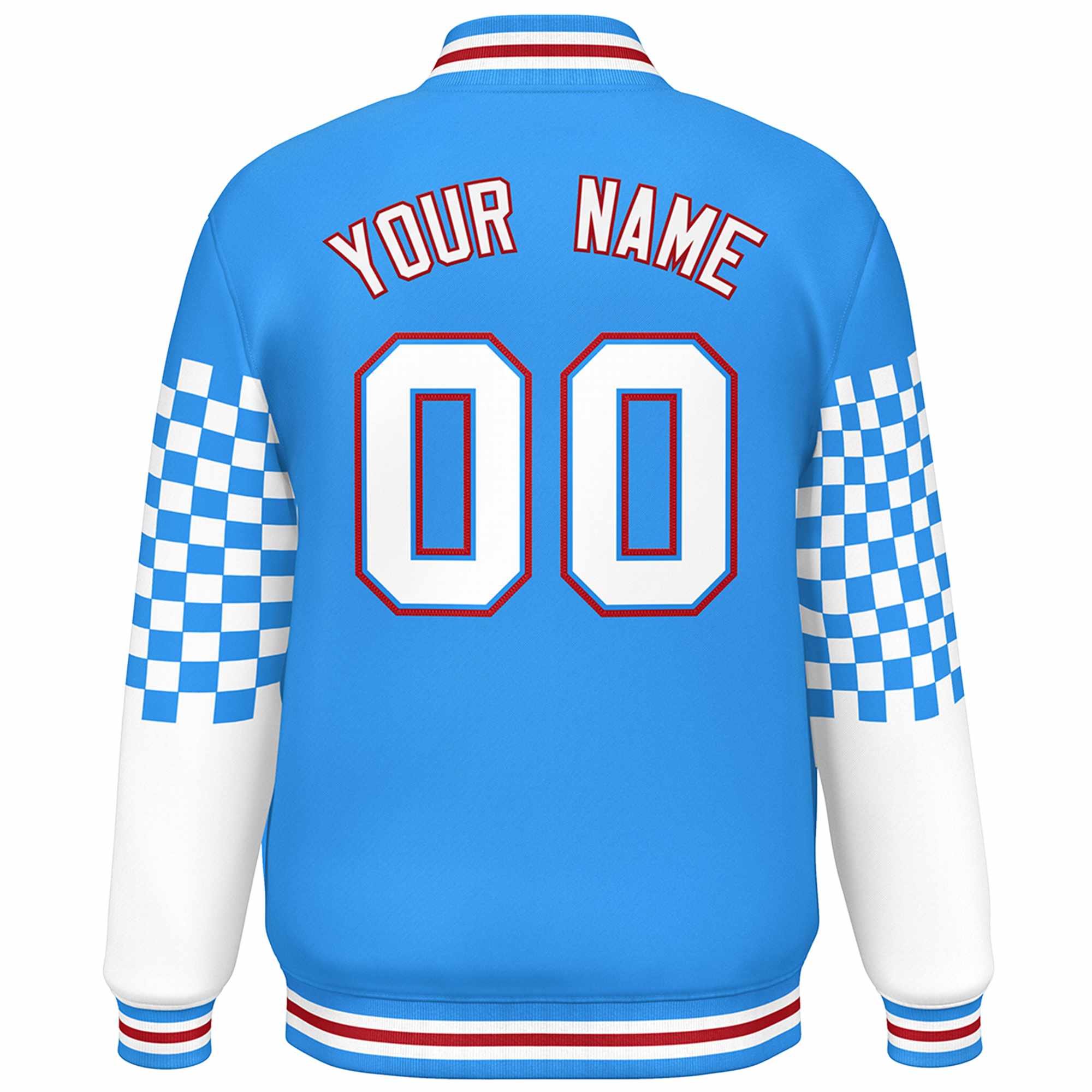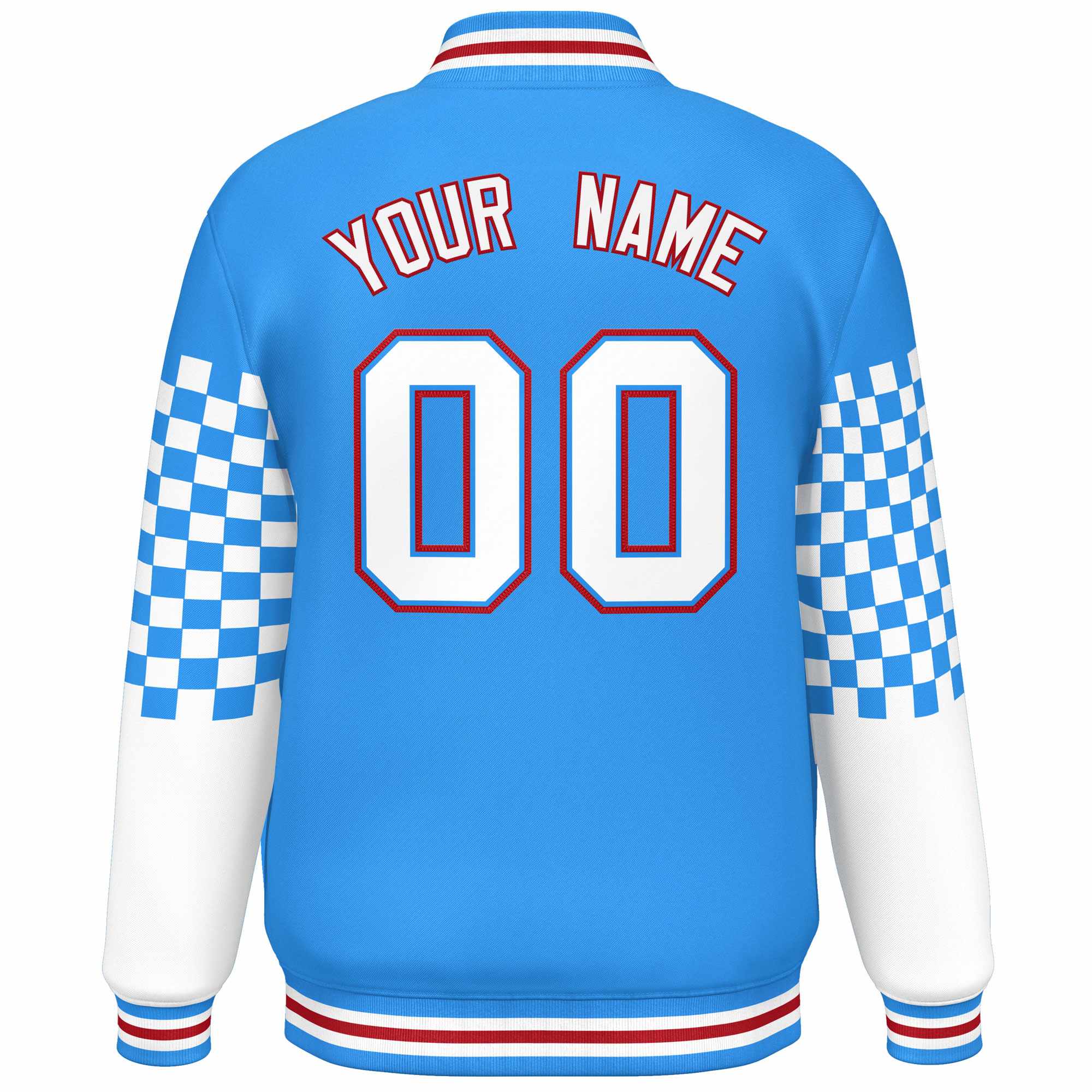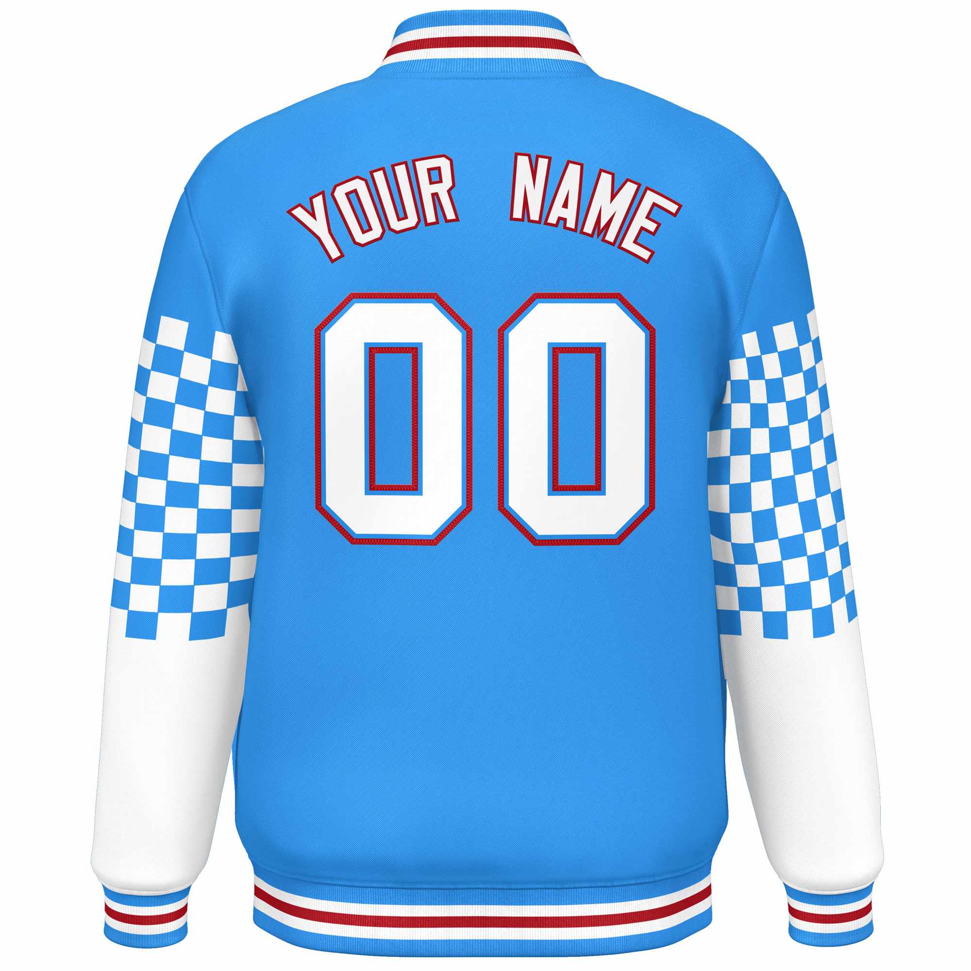 Custom Powder Blue White-Red Checkered Pattern Color Block Bomber Varsity Jacket