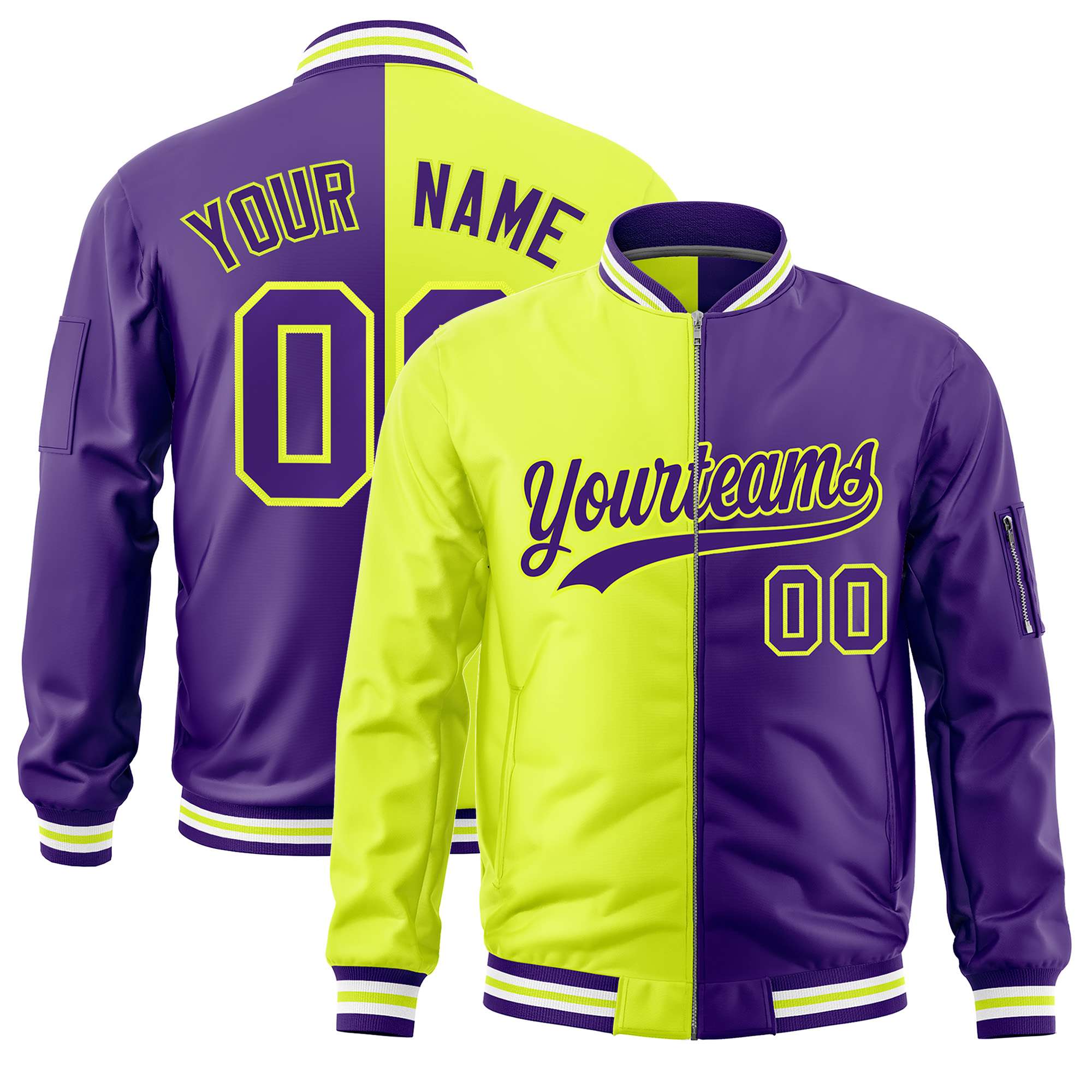 Custom Fluorescent Green Purple Split Varsity Full-Zip Two Tone Letterman Bomber Jacket