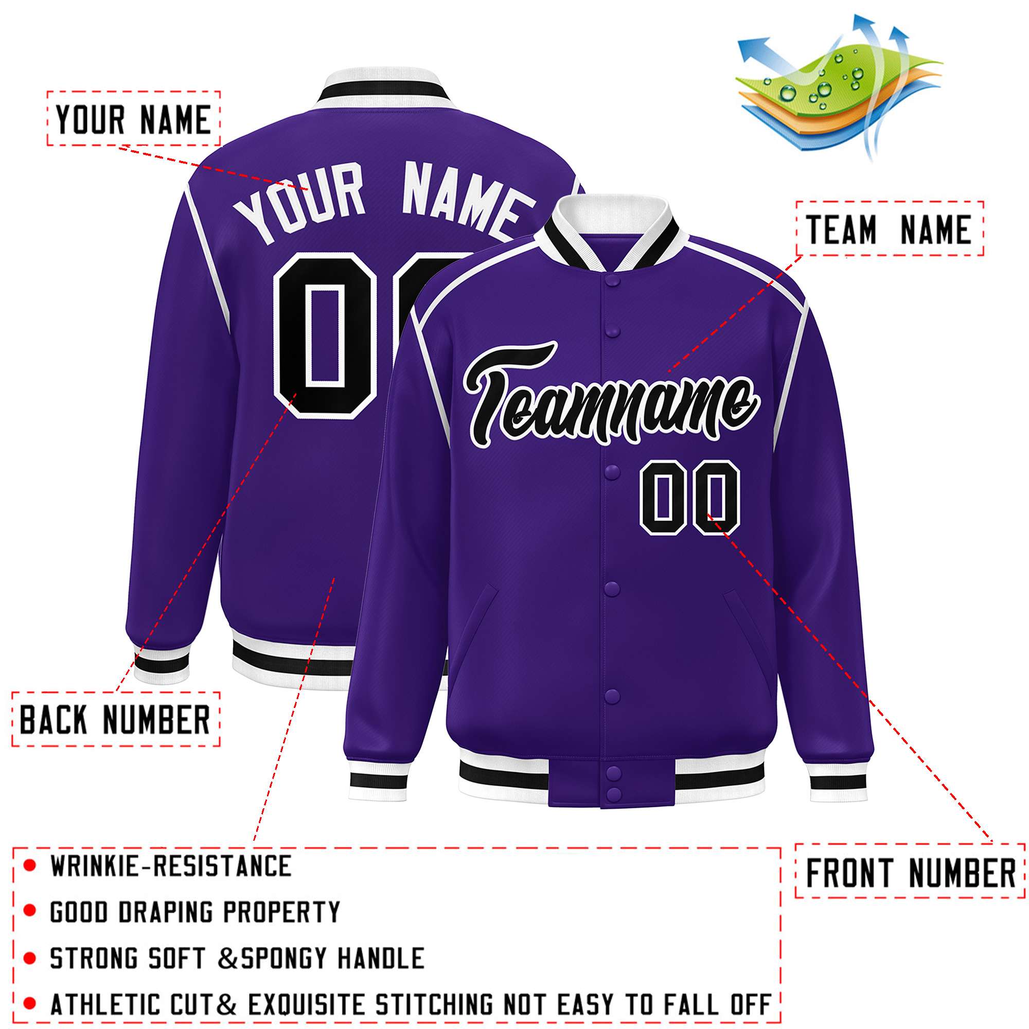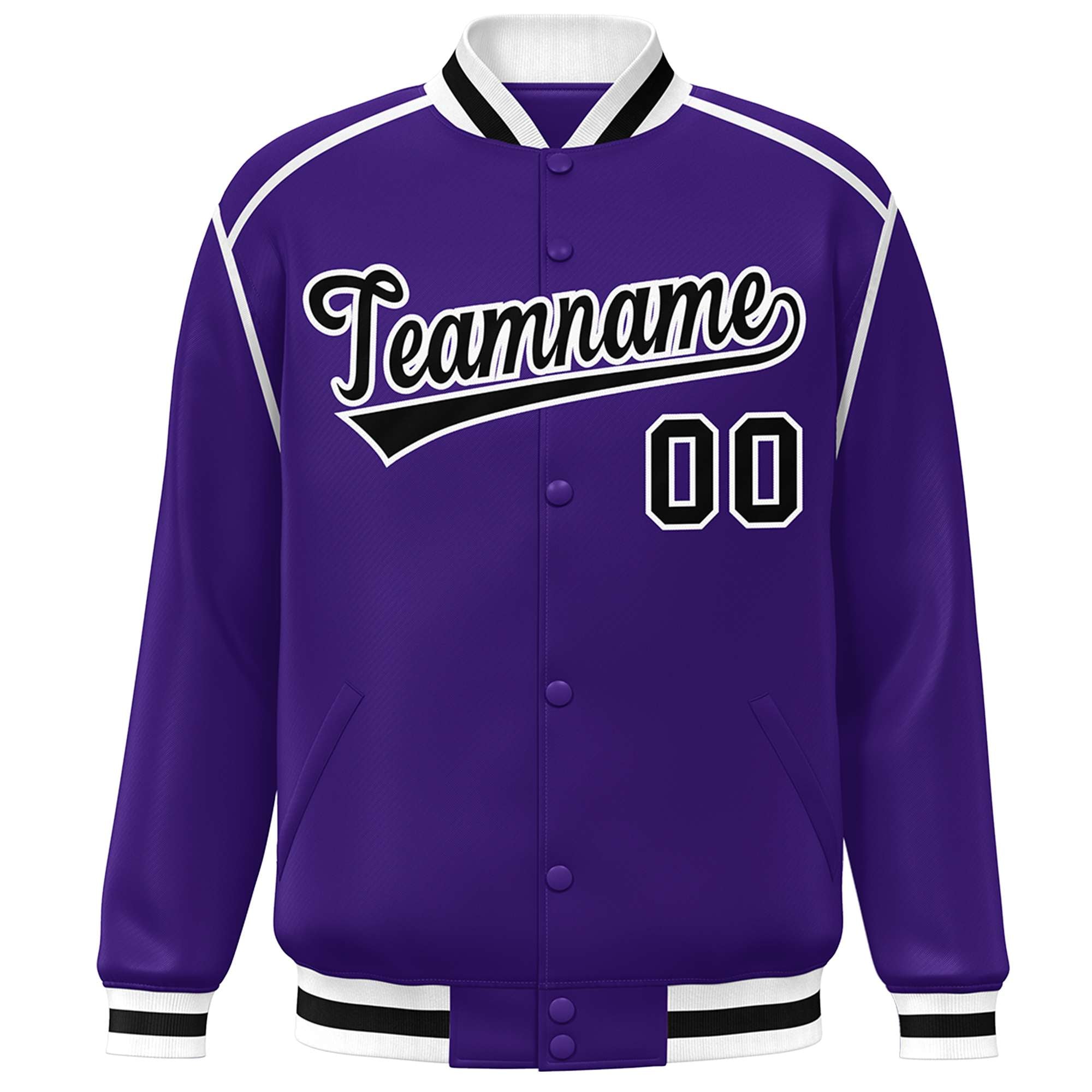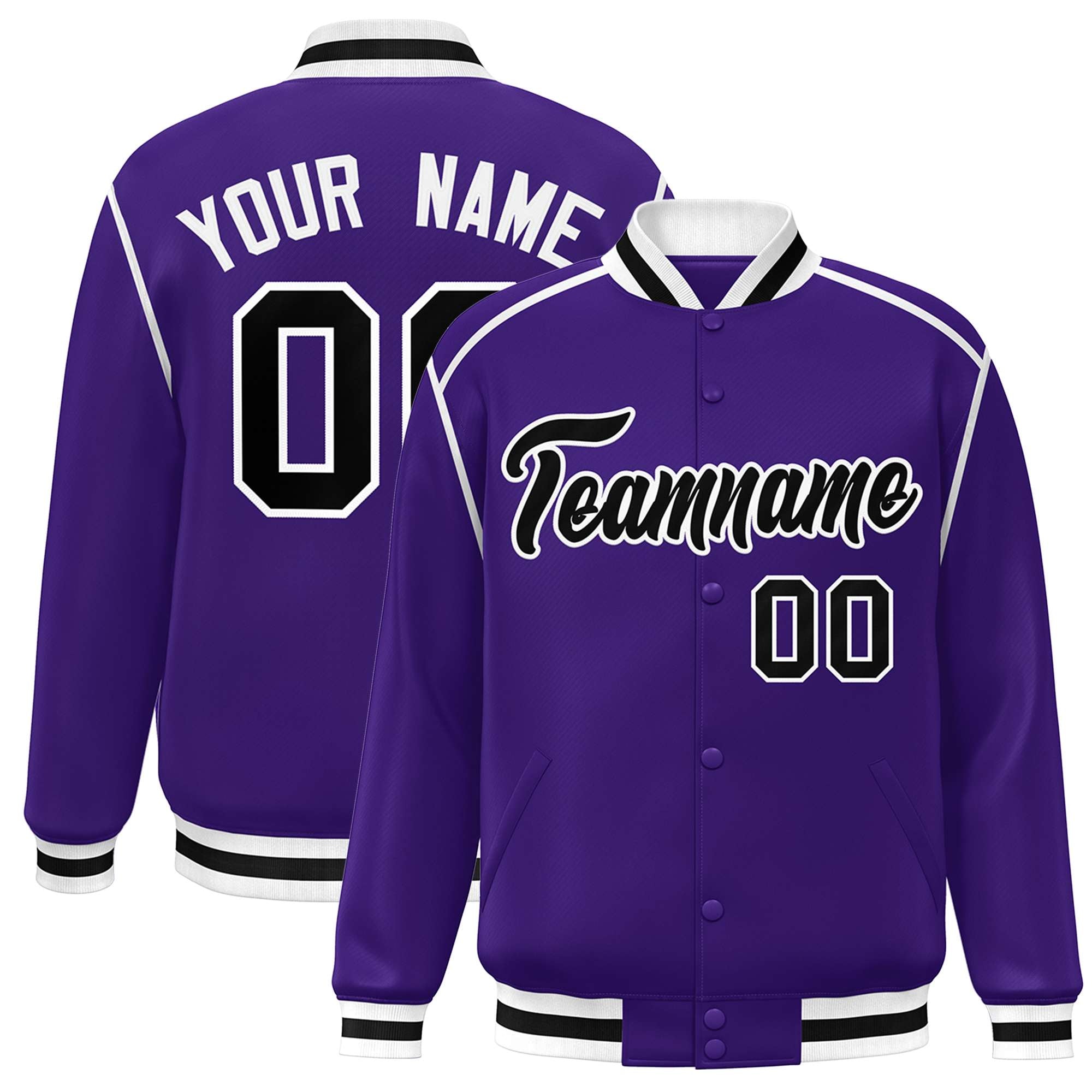 Custom Purple Black-White Color Block Ribbon Varsity Full-Snap Bomber Jacket