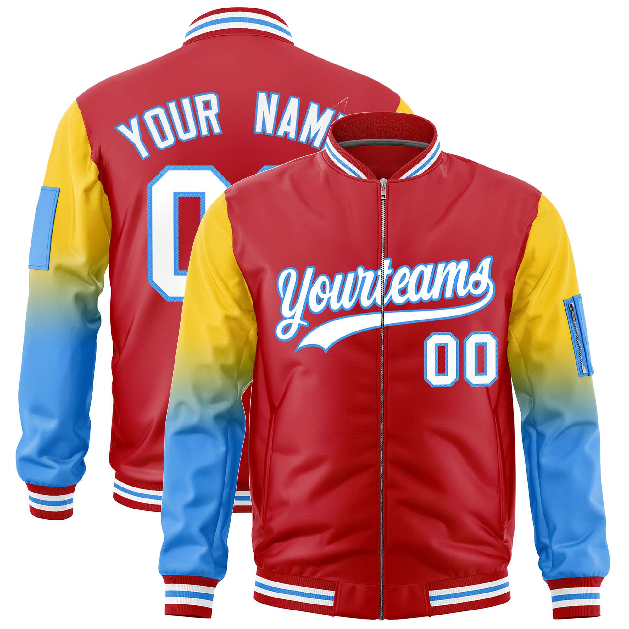 Custom Red Gold-Powder Blue Raglan Sleeve Gradient Varsity Full-Zip Letterman Bomber Jacket