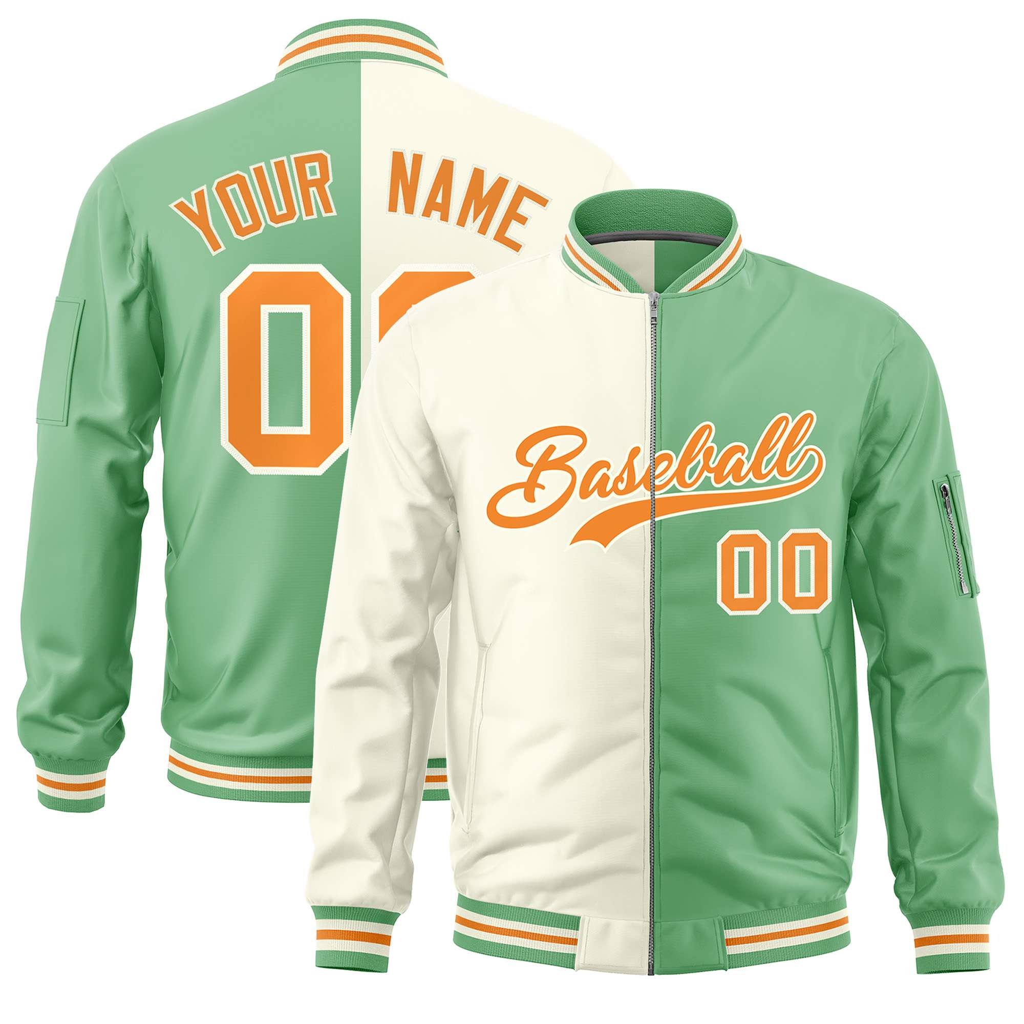 Custom Cream Light Green Split Varsity Full-Zip Two Tone Letterman Bomber Jacket