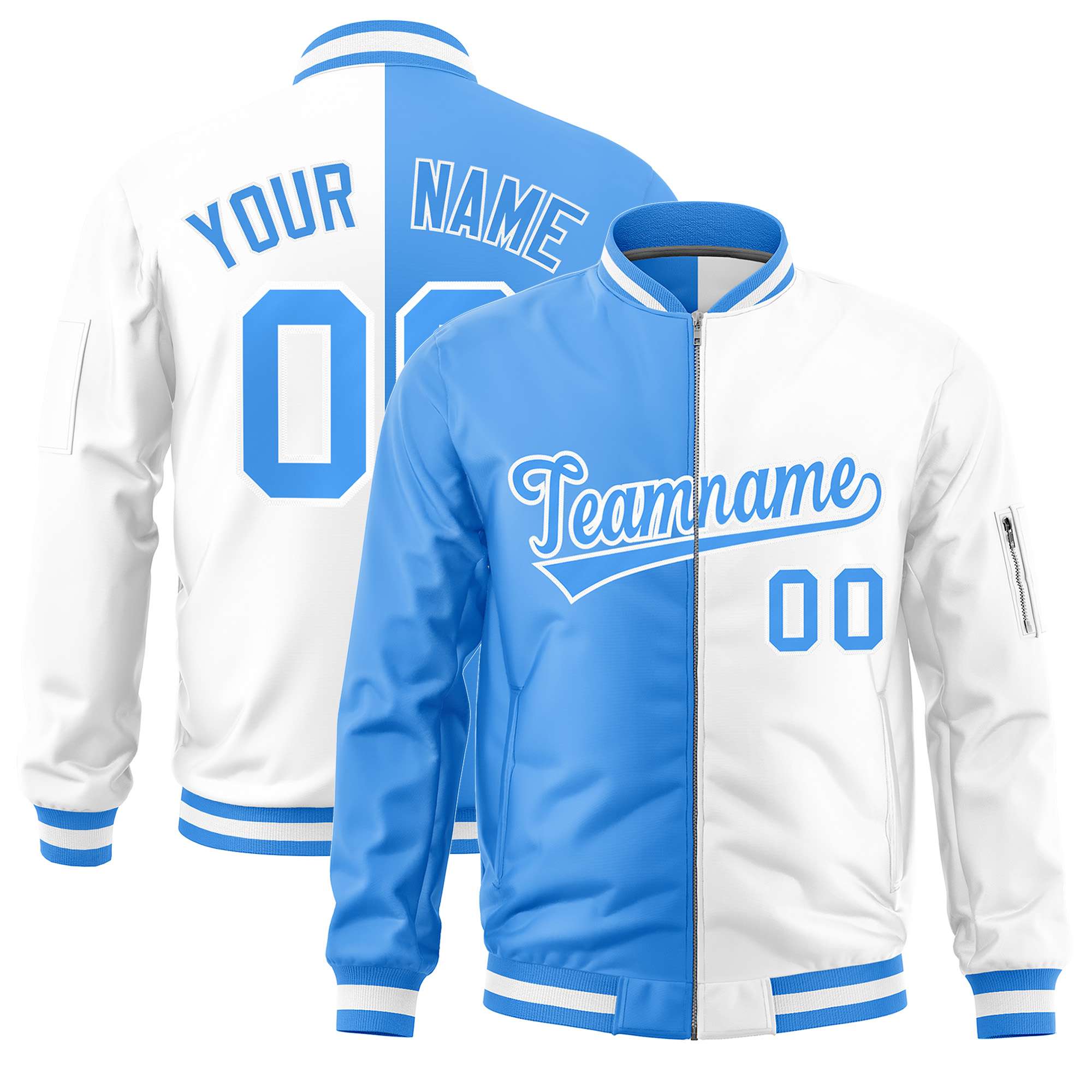 Custom Powder Blue White Split Varsity Full-Zip Two Tone Letterman Bomber Jacket