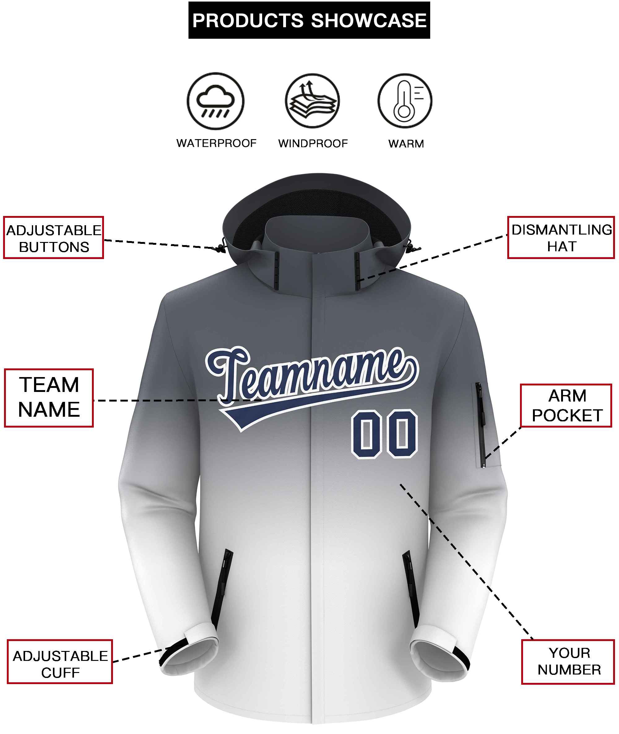 Custom Dark Gray White Gradient Fashion Outdoor Hooded Waterproof Jacket